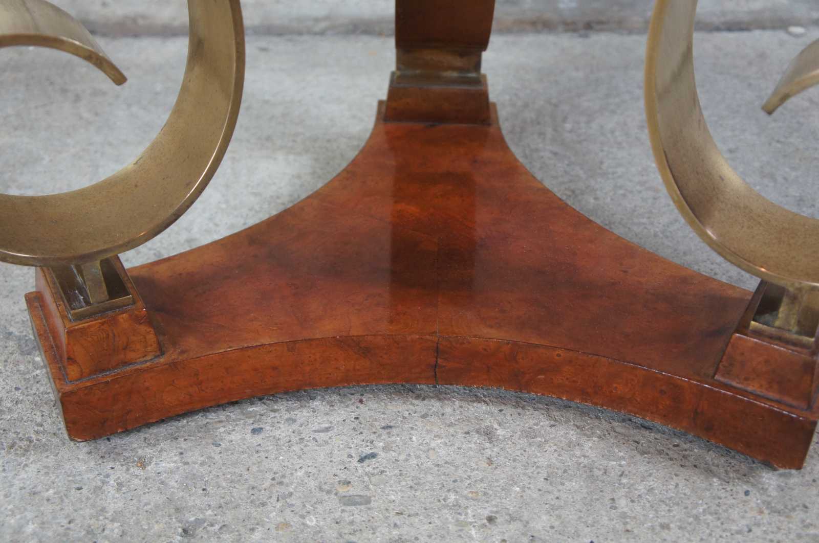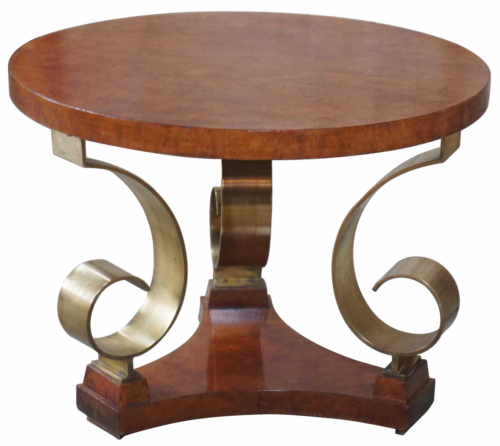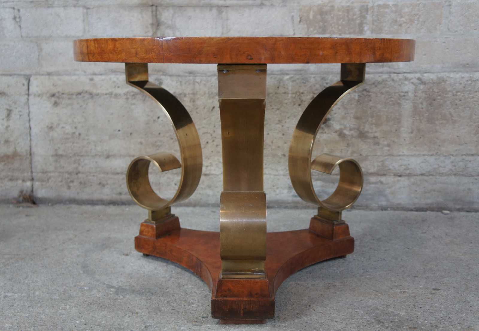 Late 20th century olive burl and scrolled brass side table. Featuers a round top supported by three elegent brass scrolls over a tripod form base. Signed along underside.