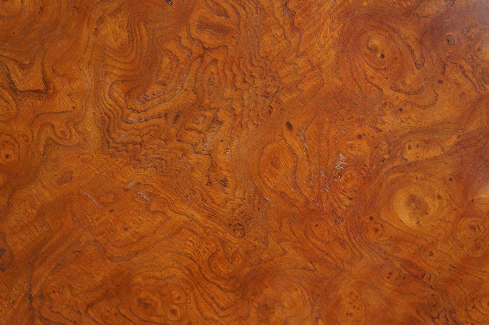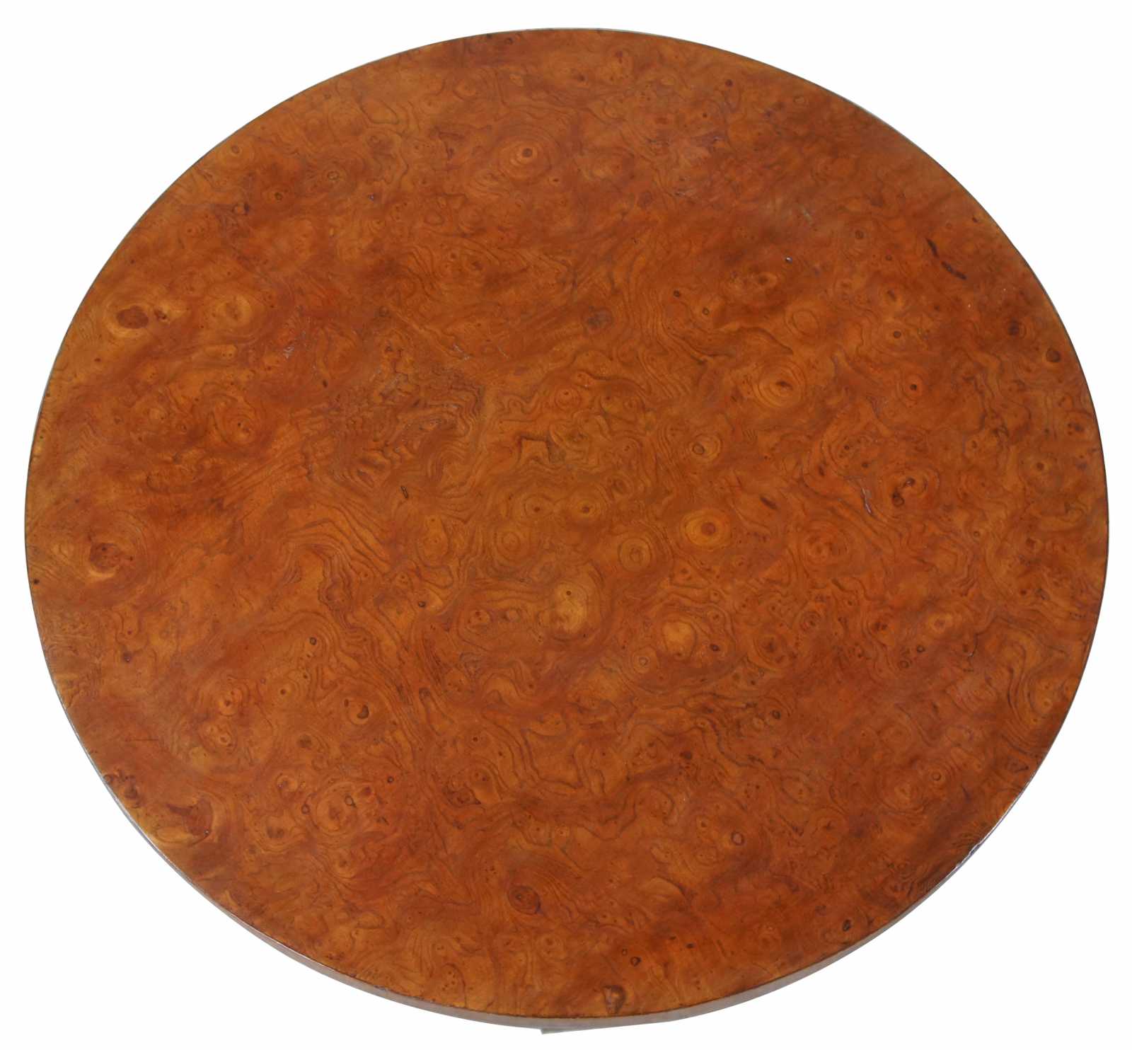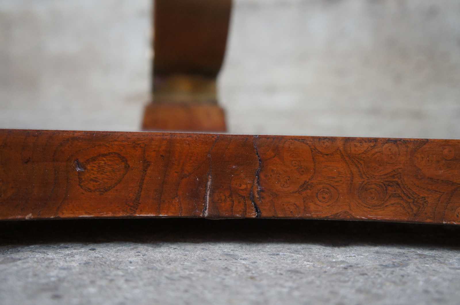 Late 20th century olive burl and scrolled brass side table. Featuers a round top supported by three elegent brass scrolls over a tripod form base. Signed along underside.