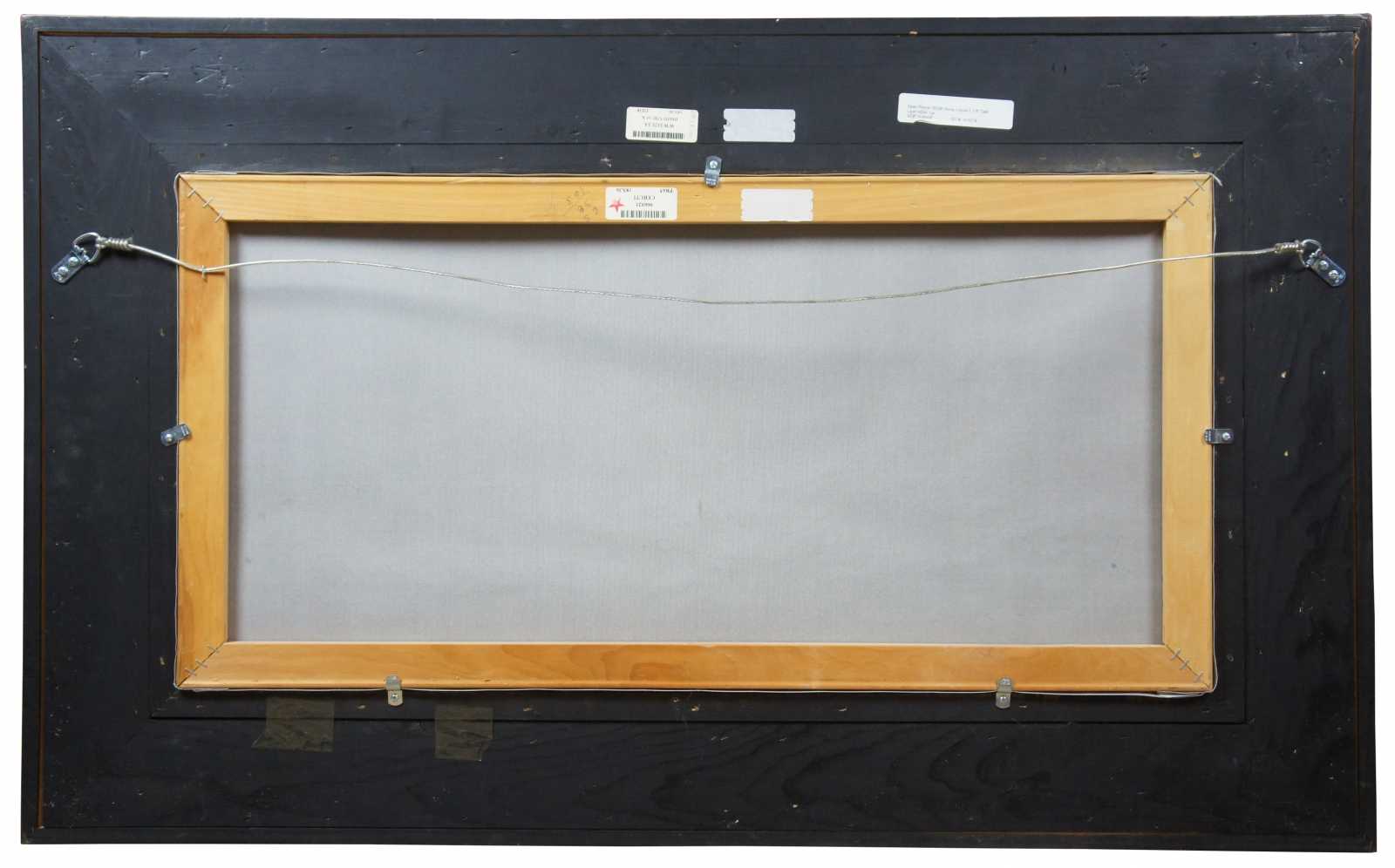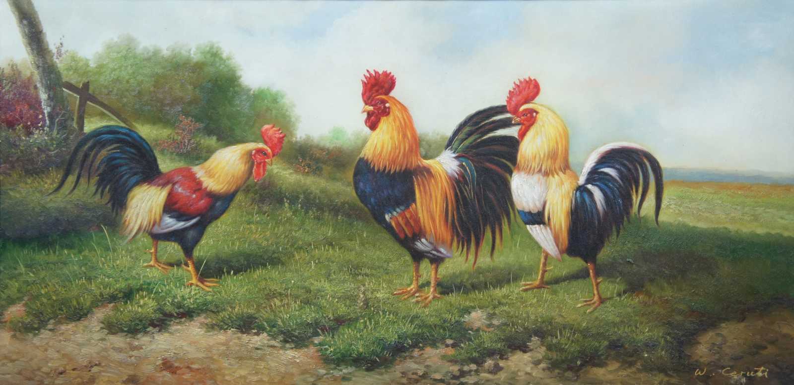 Large oil painting on canvas signed by W. Ceruti showing roosters in a grassy landscape.