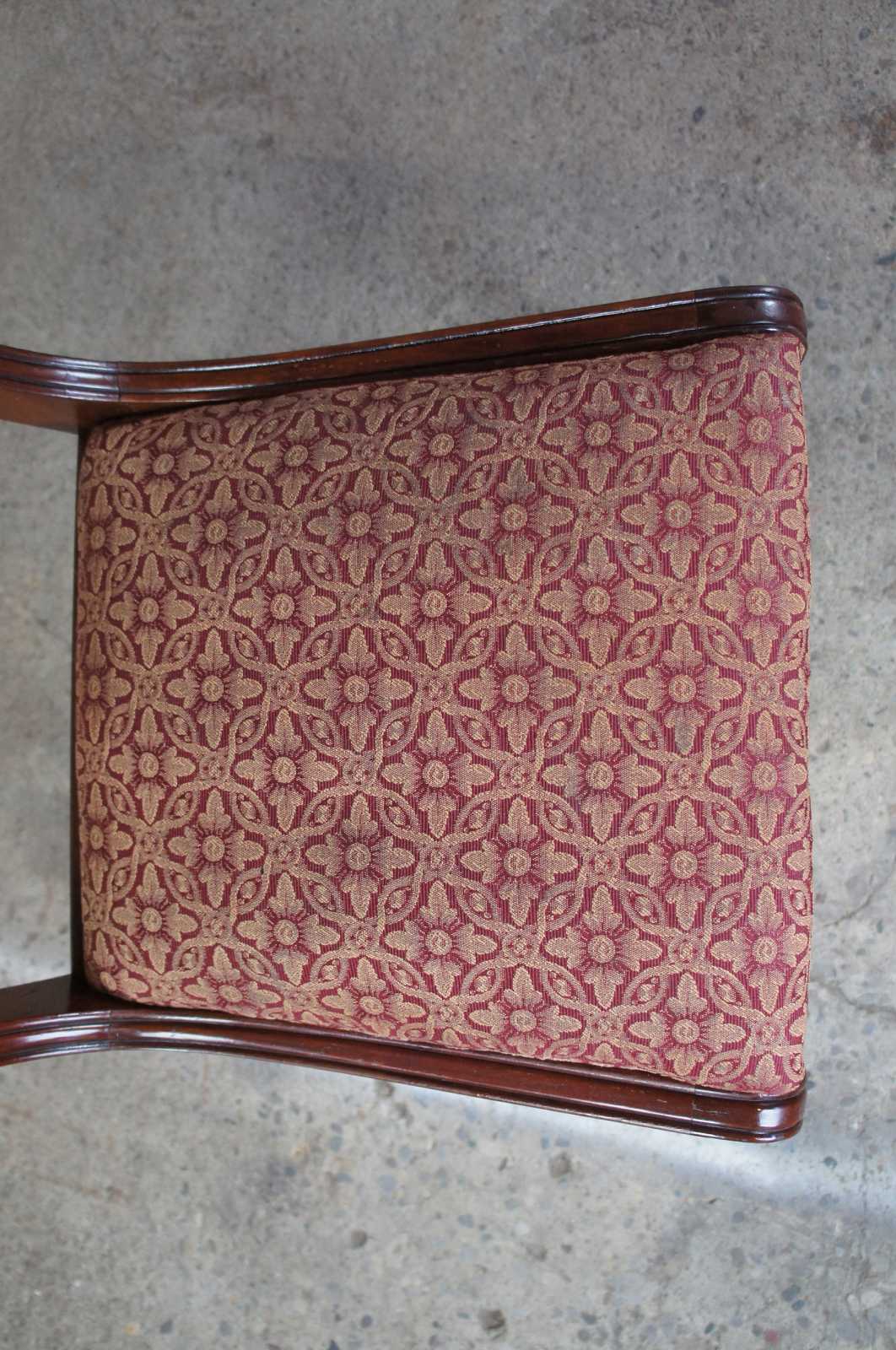 Six mahogany Regency rope back or barley twisted dining chairs. Features rope twist and slat back with serpentine arms and flared legs.
