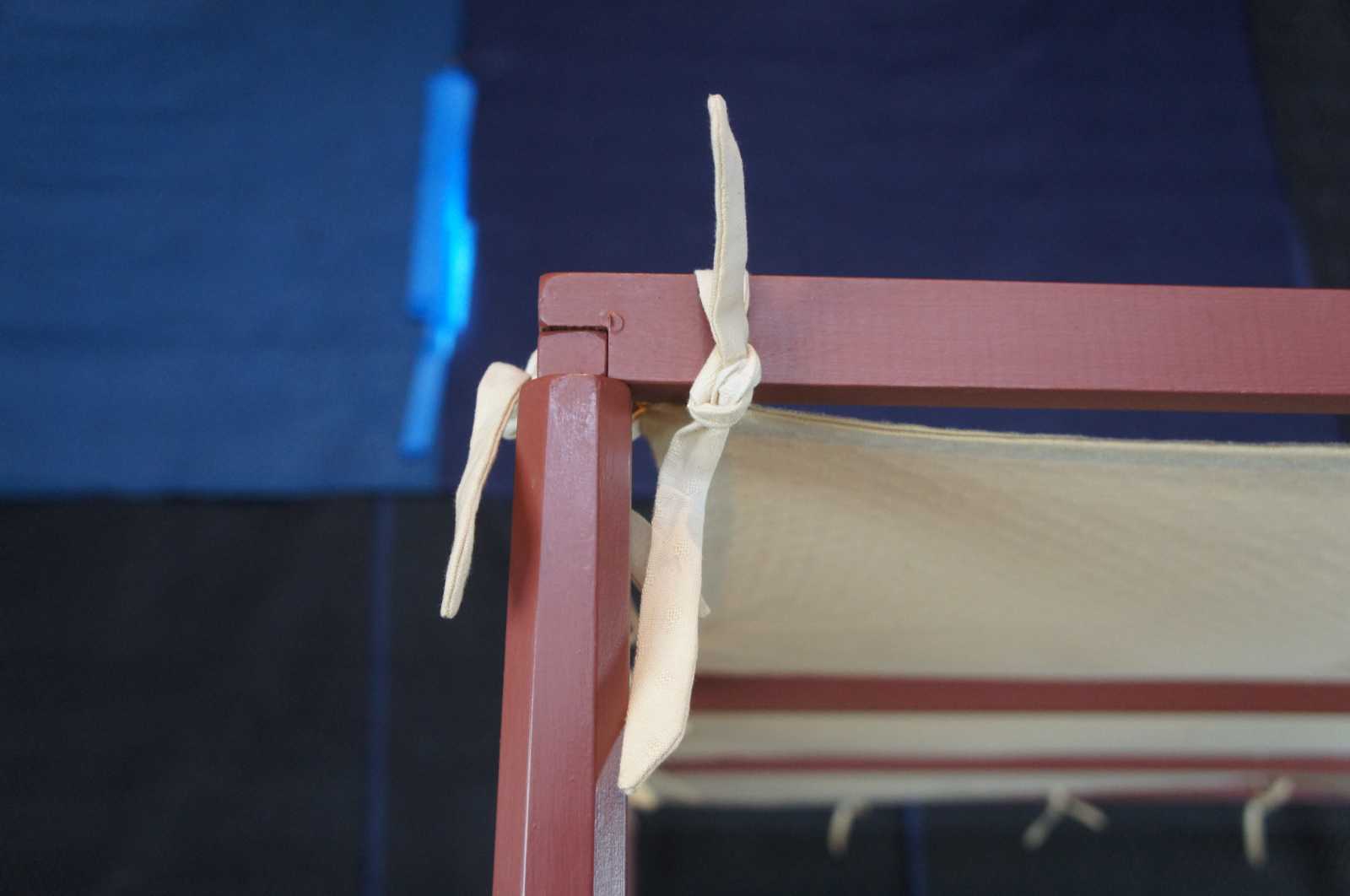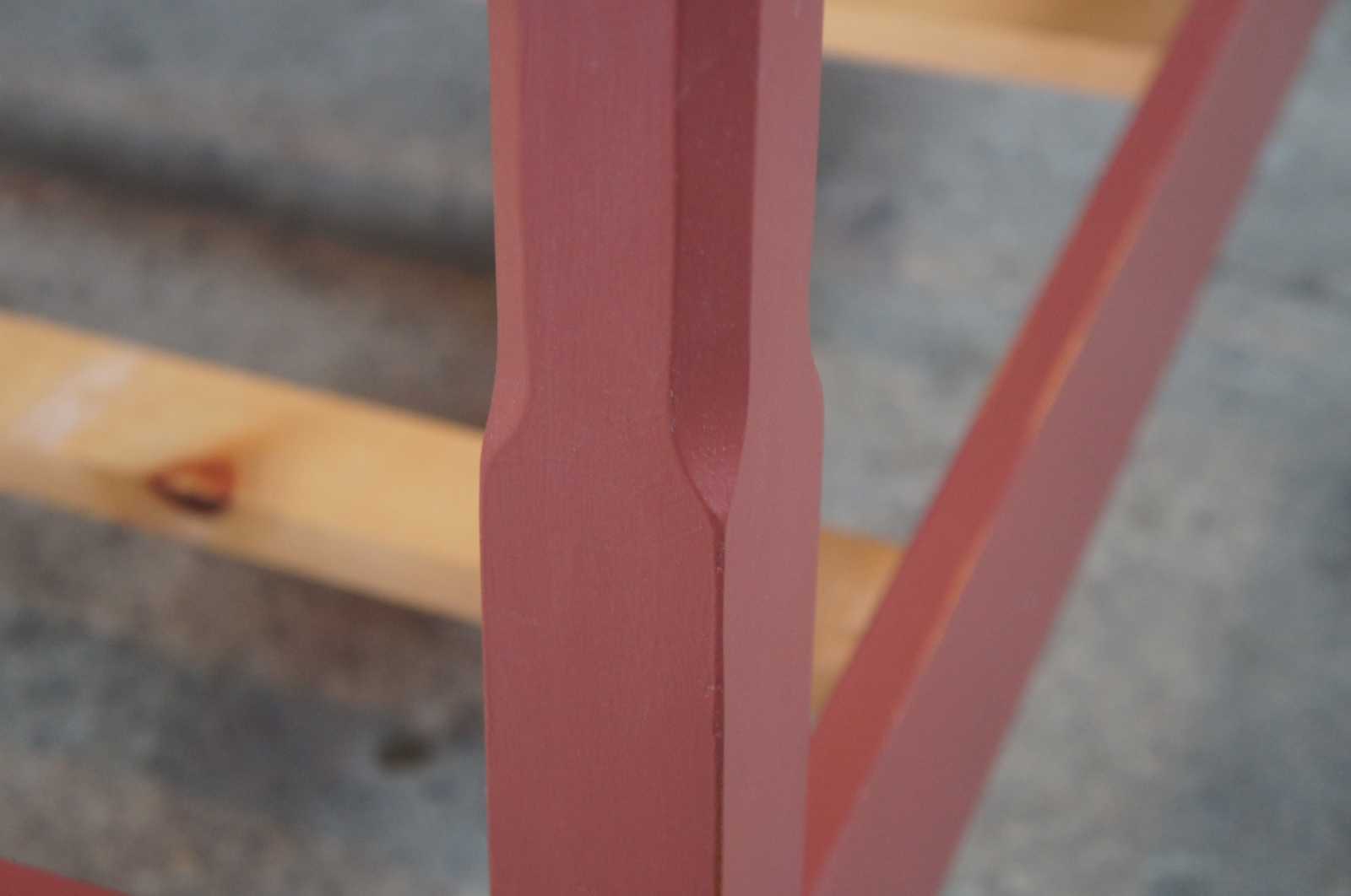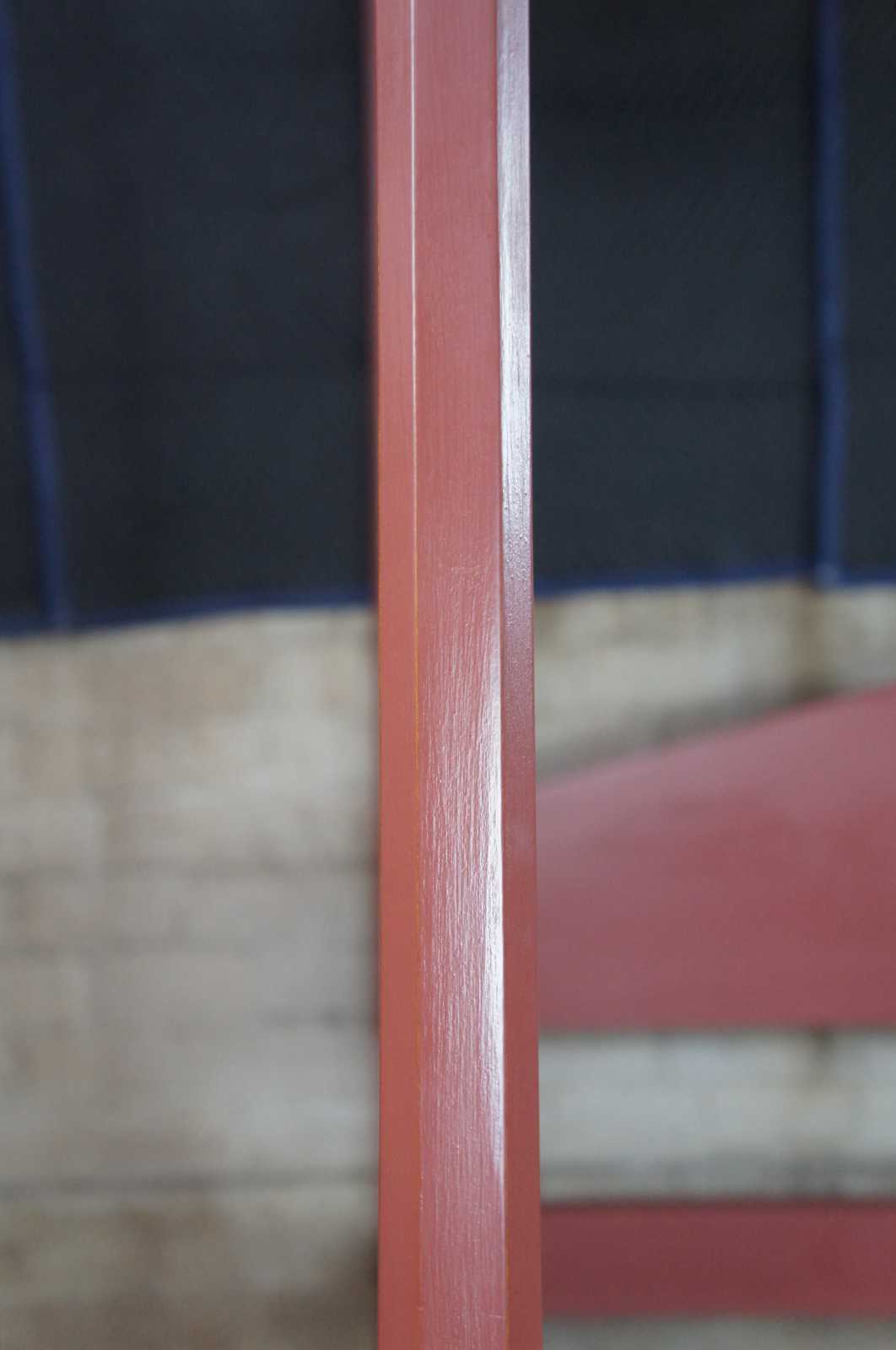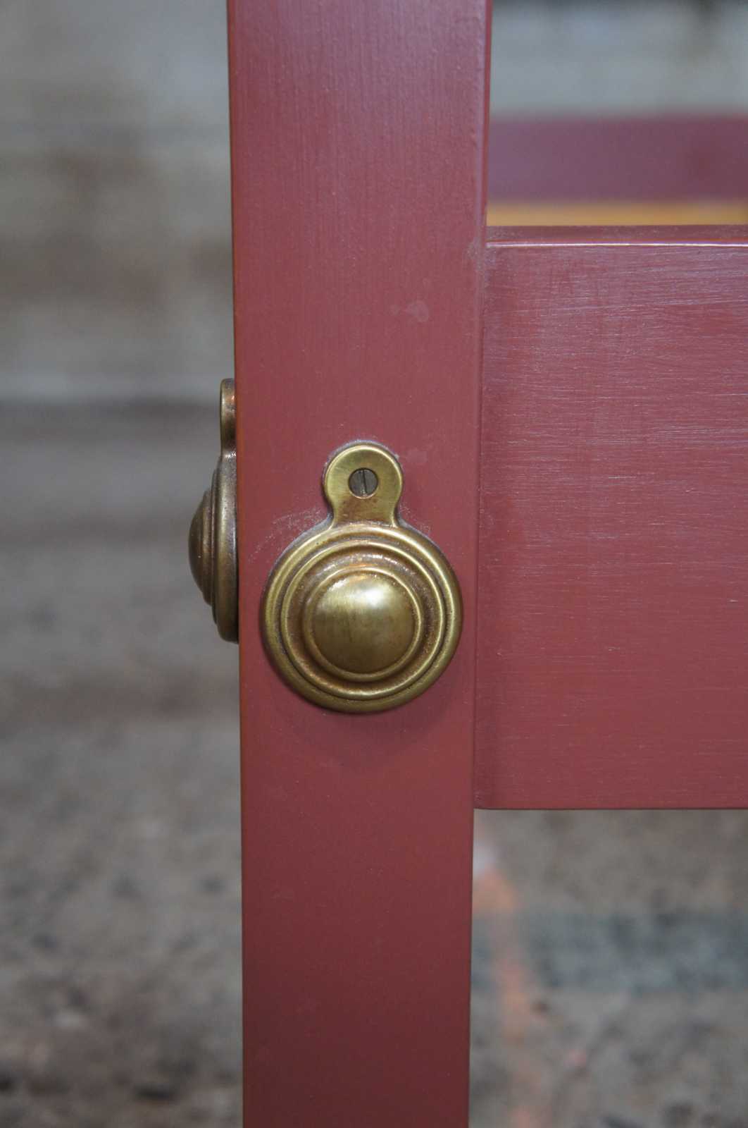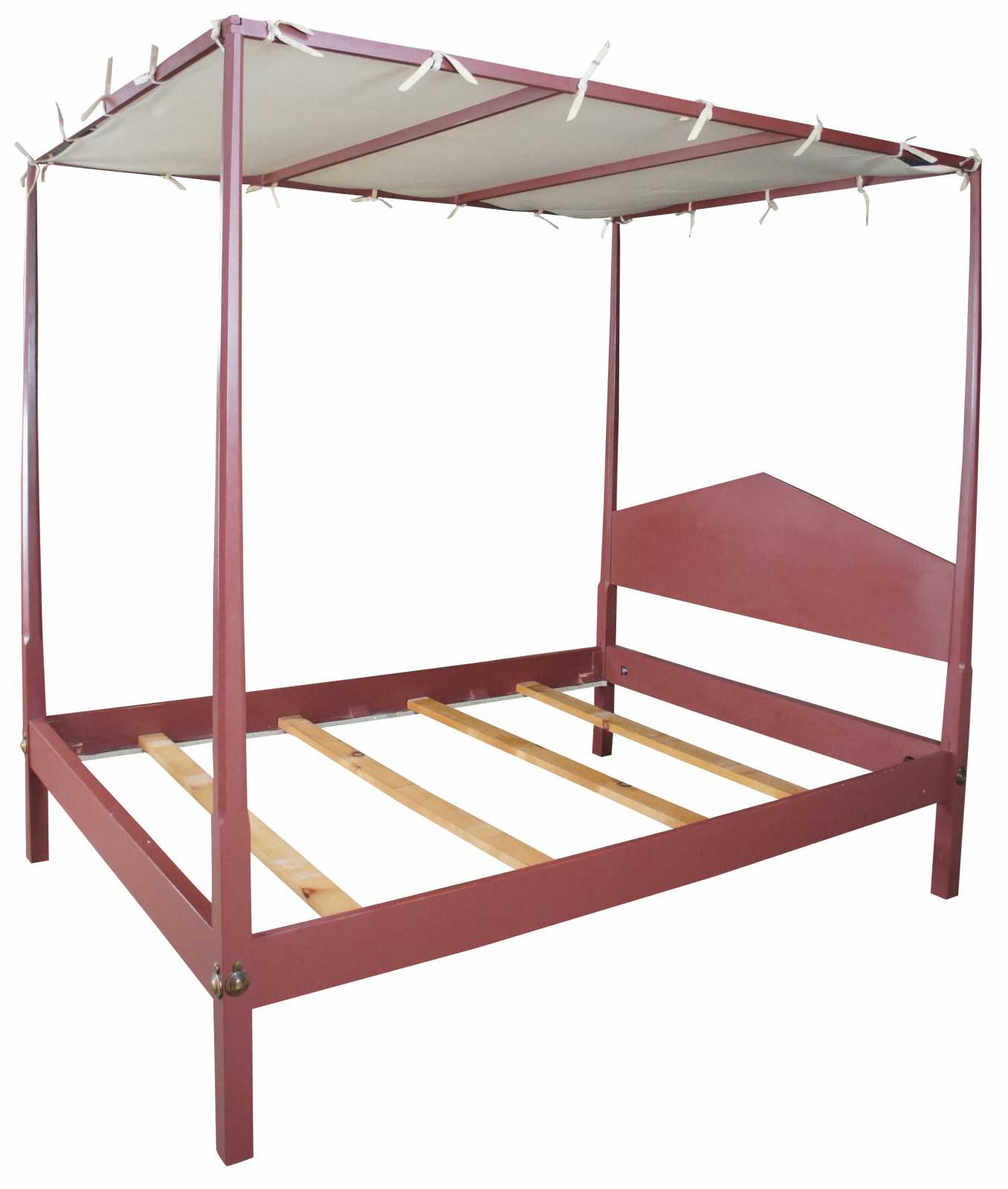 Early American painted pine full size pencil post canopy bed by David T Smith, Circa 1987. A style popularized in the late 1700s. Features a canopy with fabric, pencil posts and colonial hardware. Finished in Old Red.