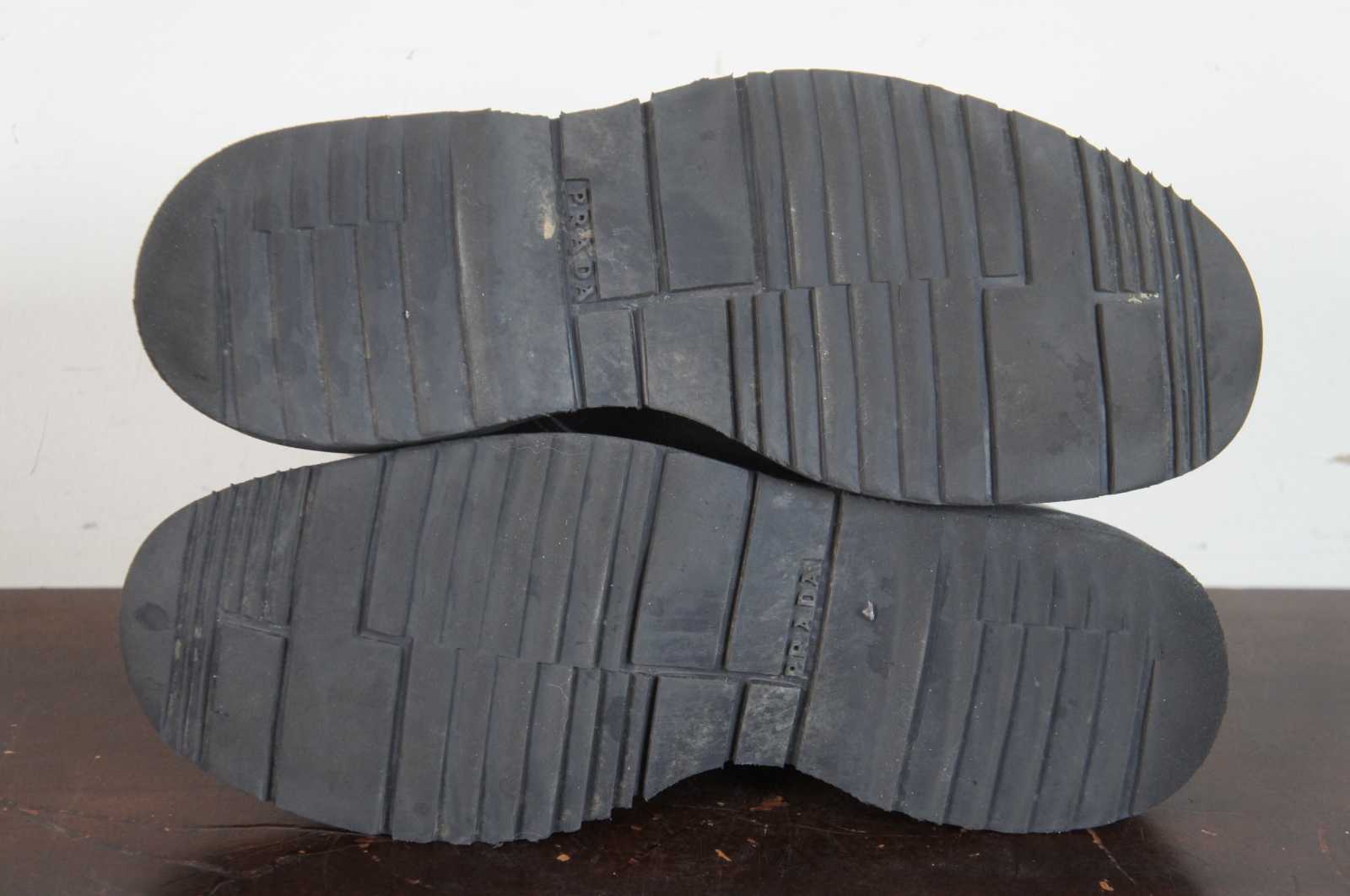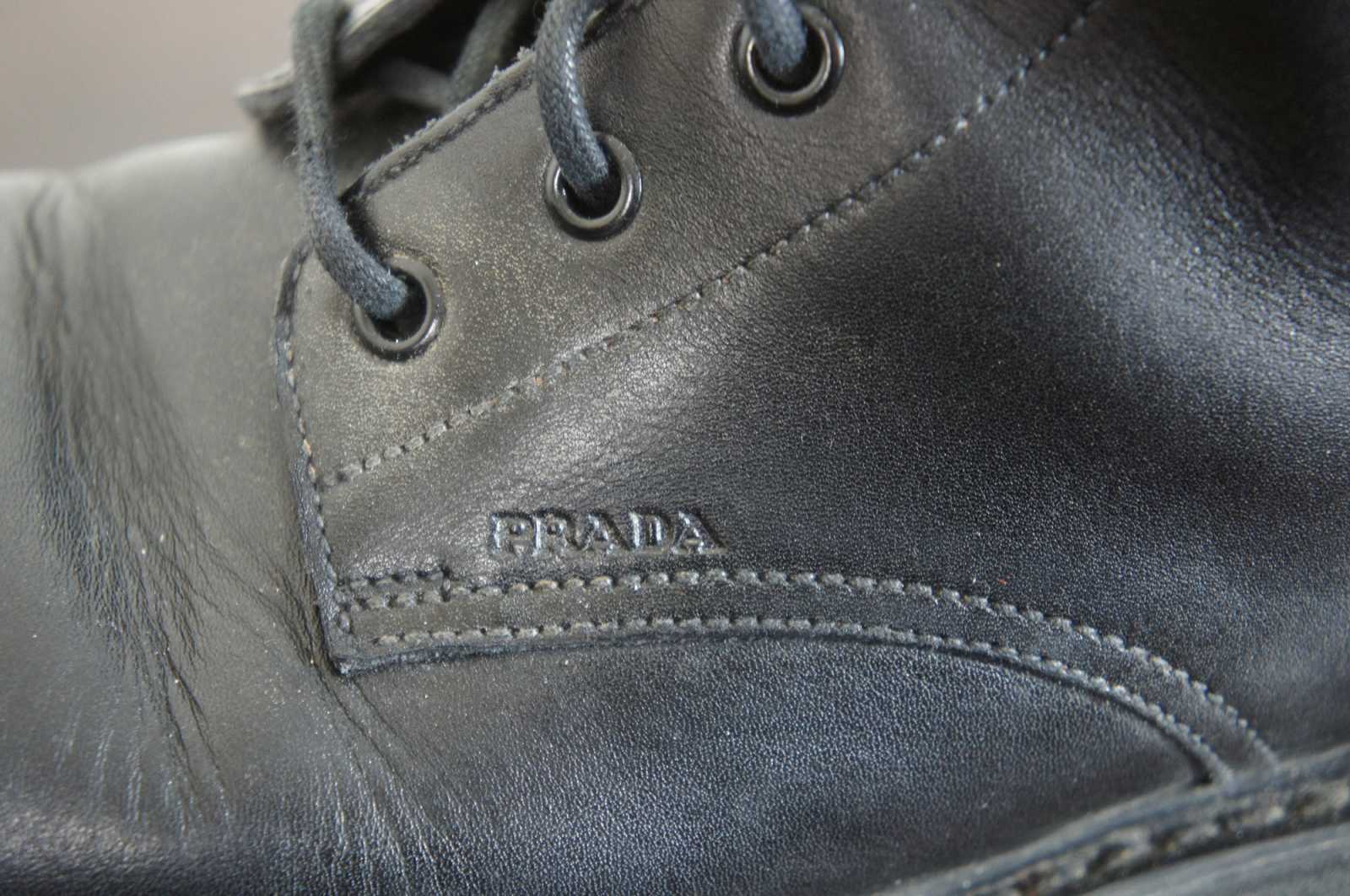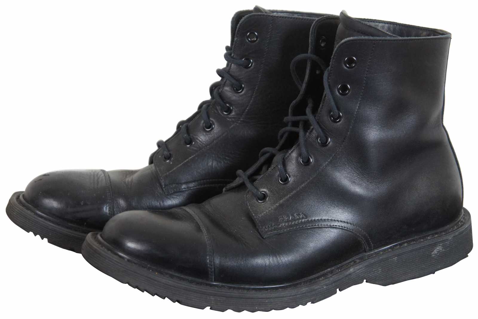 Prada men’s black leather lace up ankle height combat style boot, product number 2TG002.