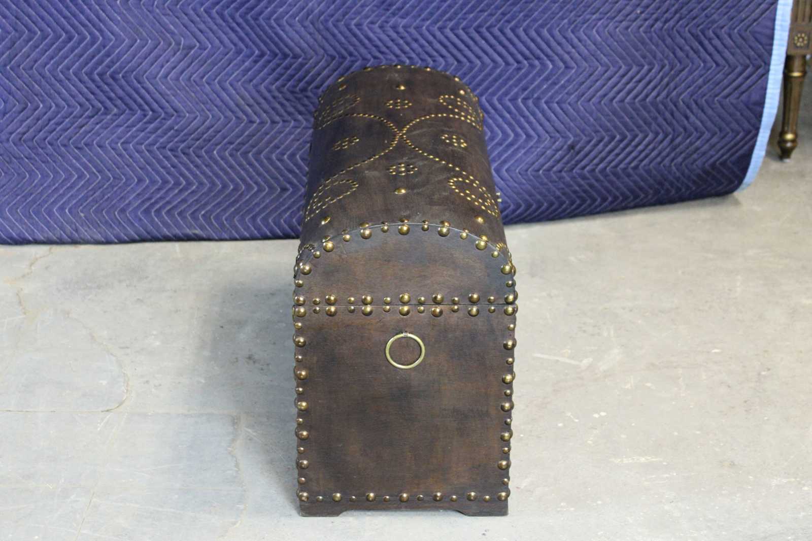 Spanish Colonial inspired chest. Made from wood with a dome top, hinged lid and ornately designed riveting along the outside.