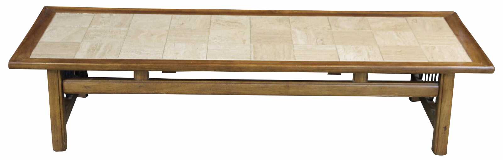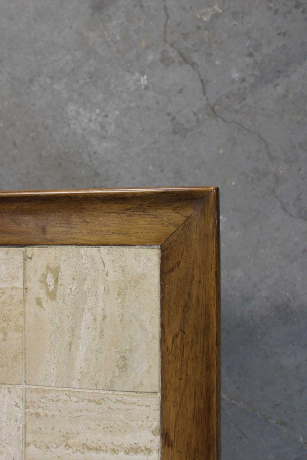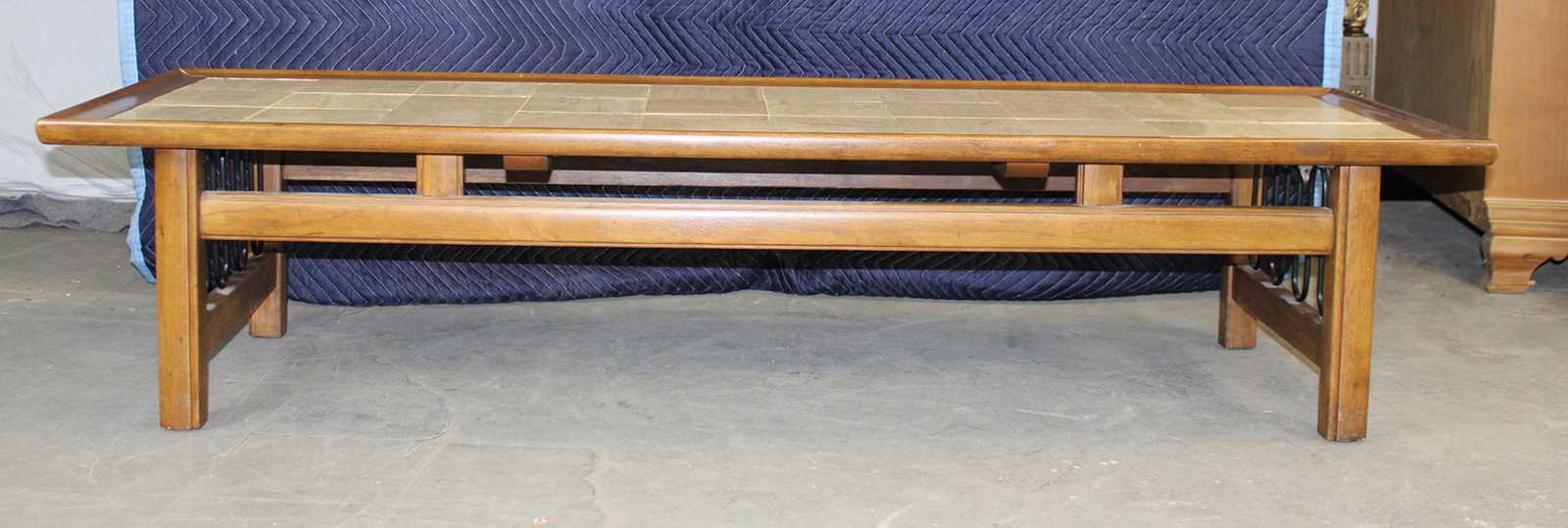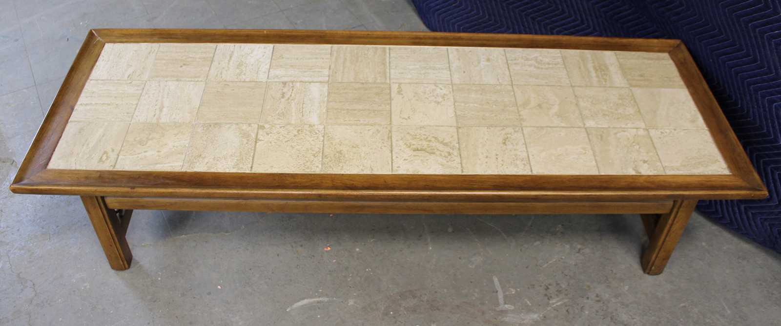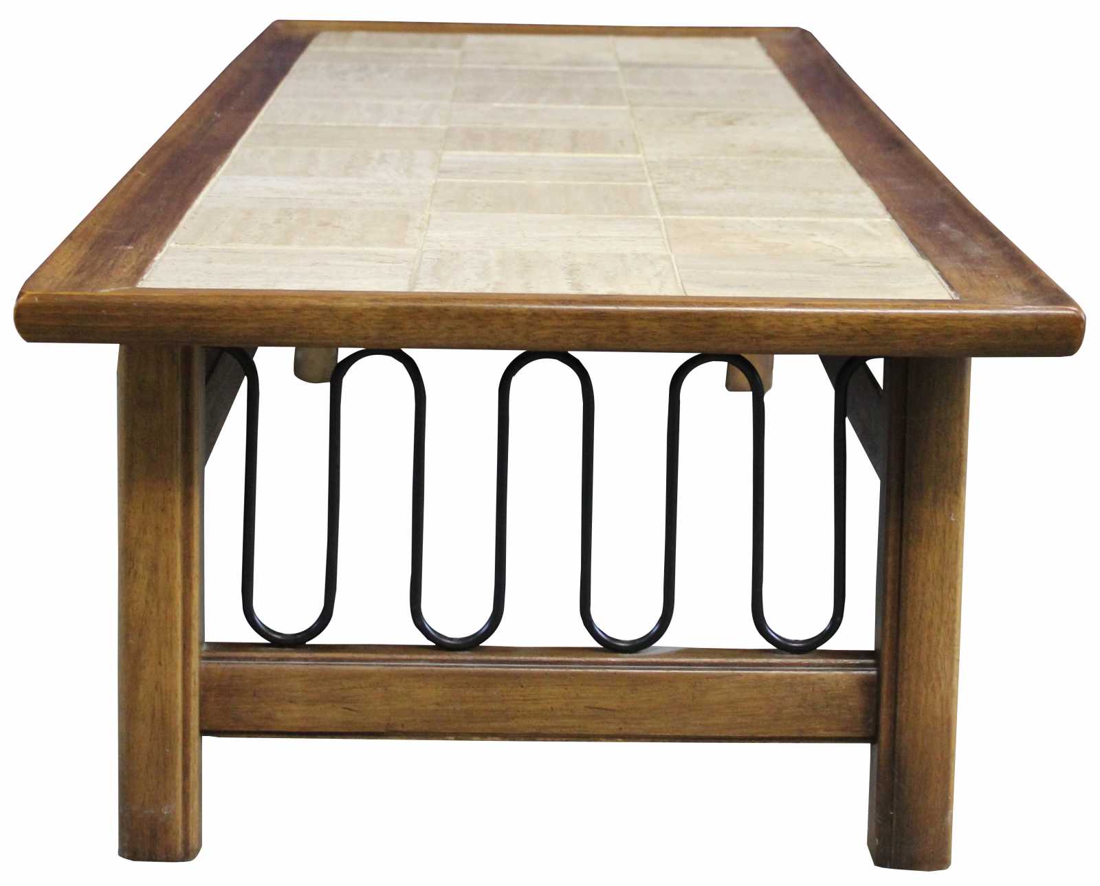 Mid Century Modern walnut coffee table with inset tiled top. Features a serpentine wire design along the sides. Originally purchased from Rikes Furniture in Dayton, Ohio.