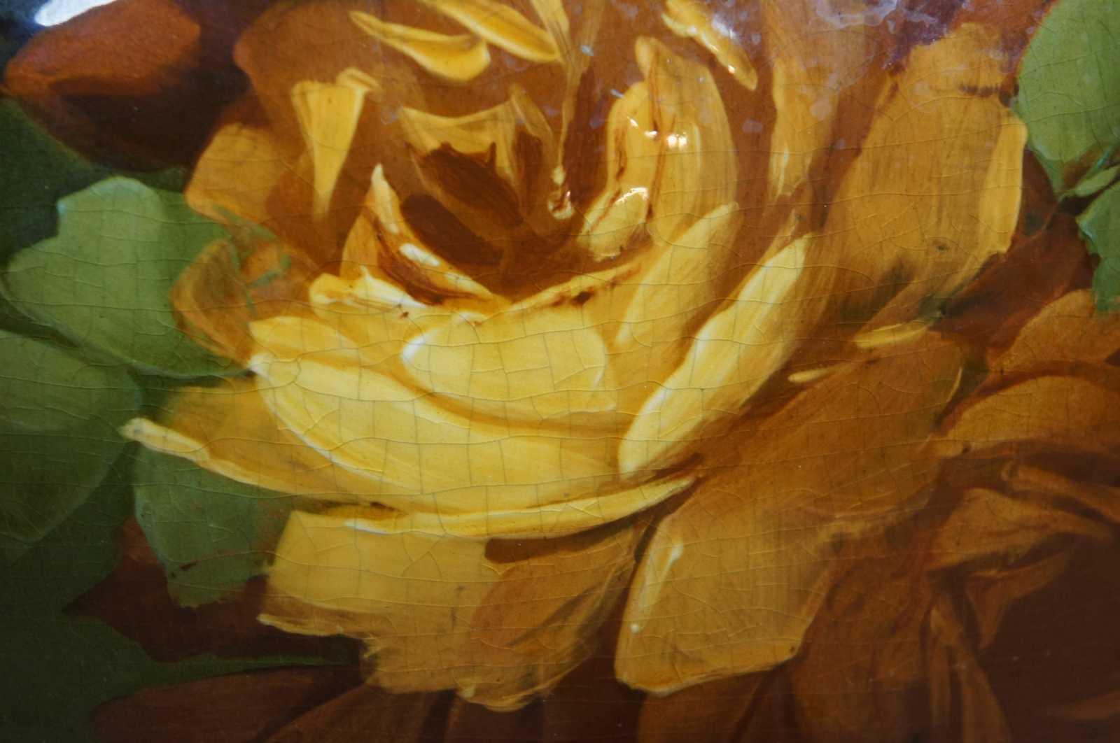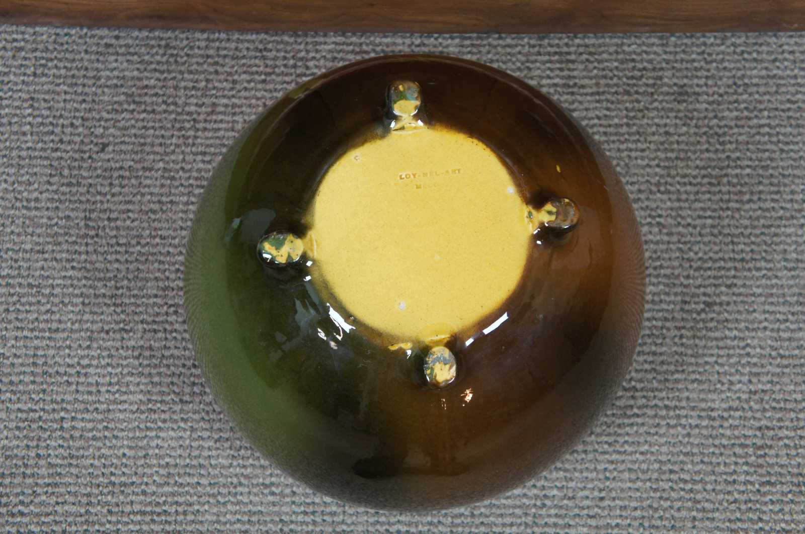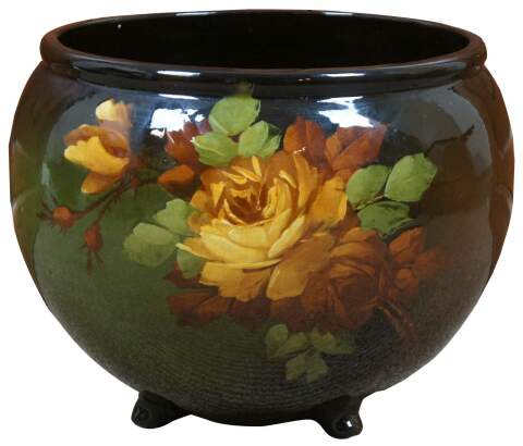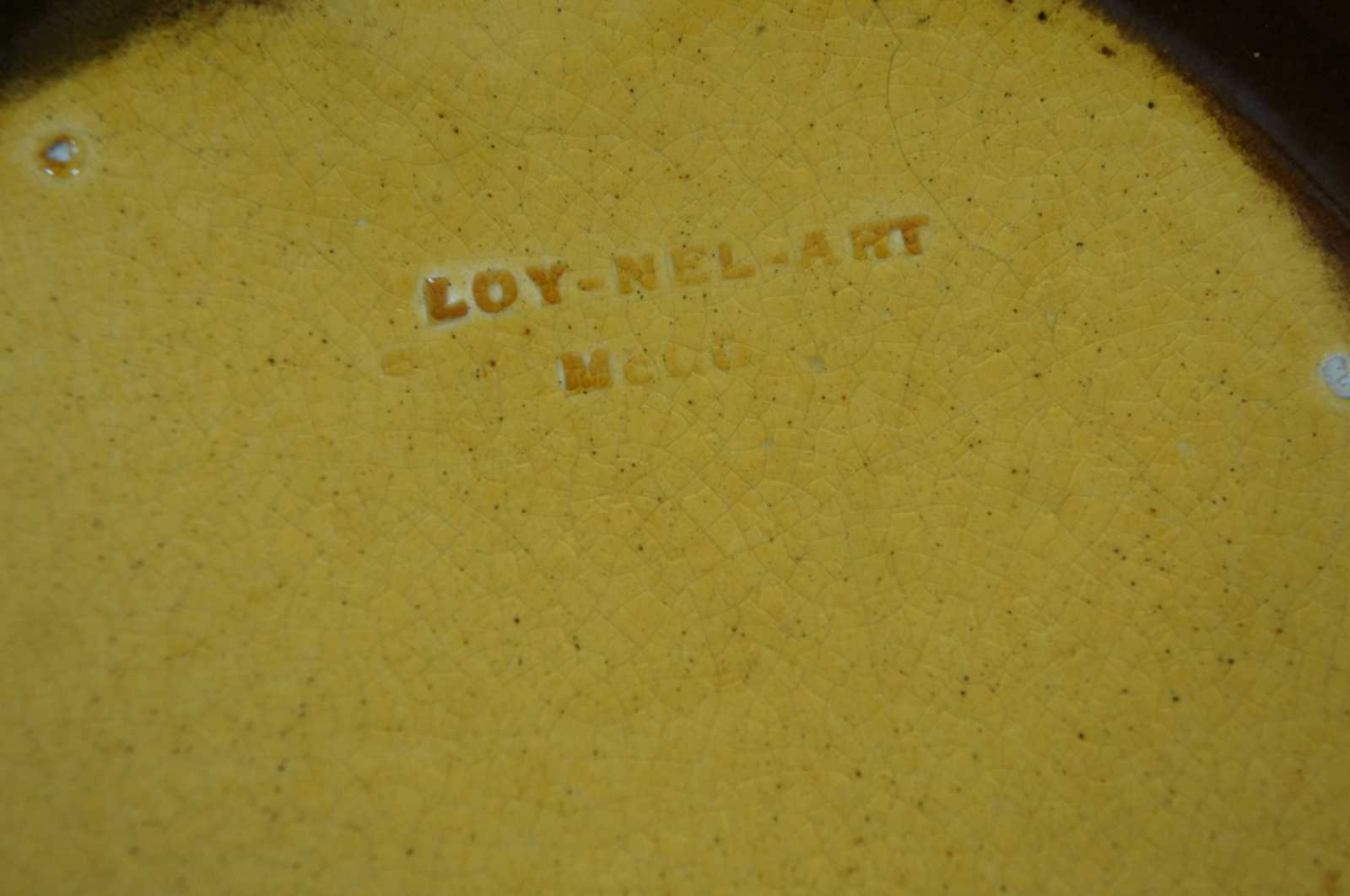 Vintage brown and green ceramic planter painted with yellow roses, by McCoy pottery and marked Loy-Nel-Art.