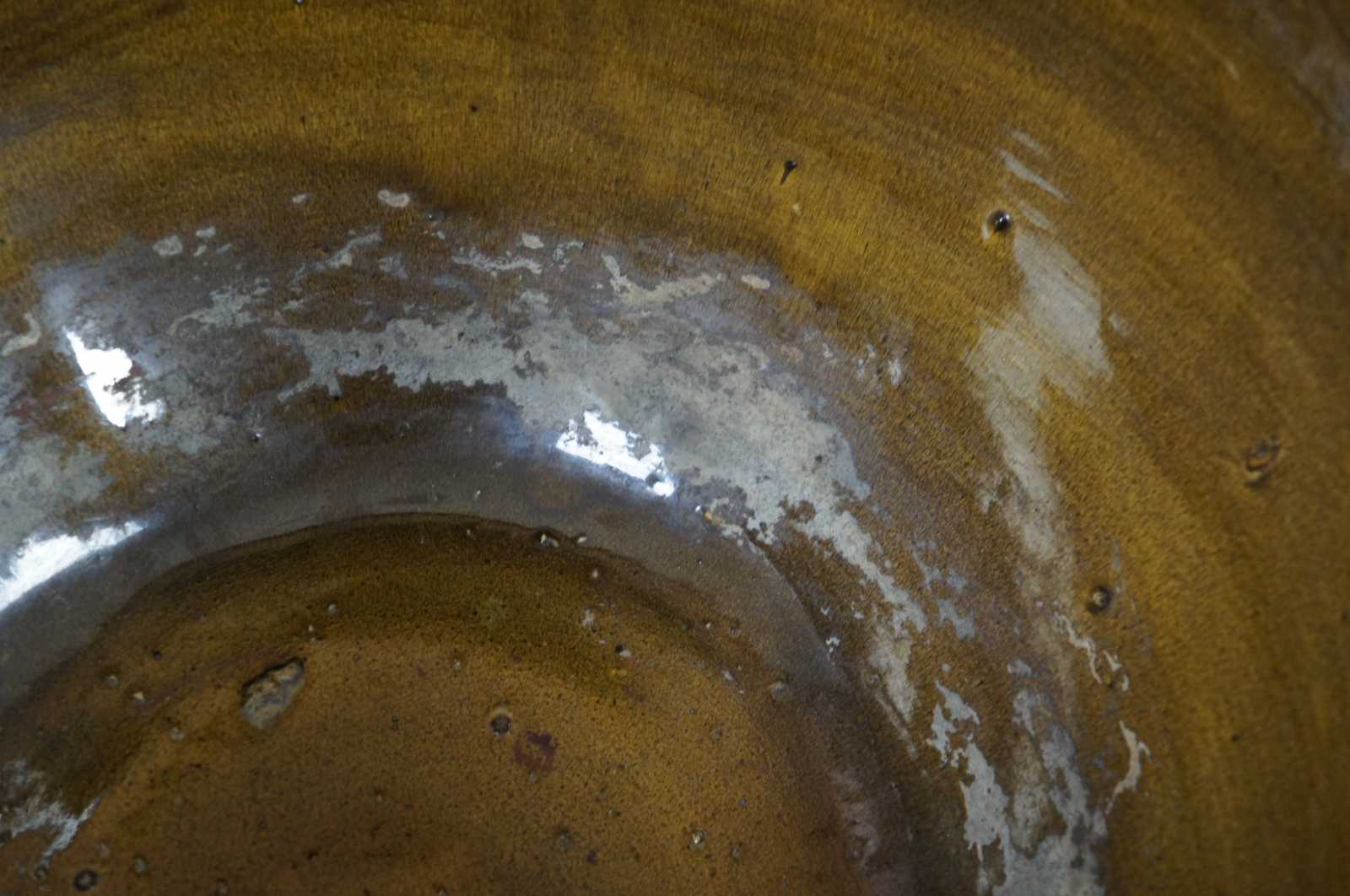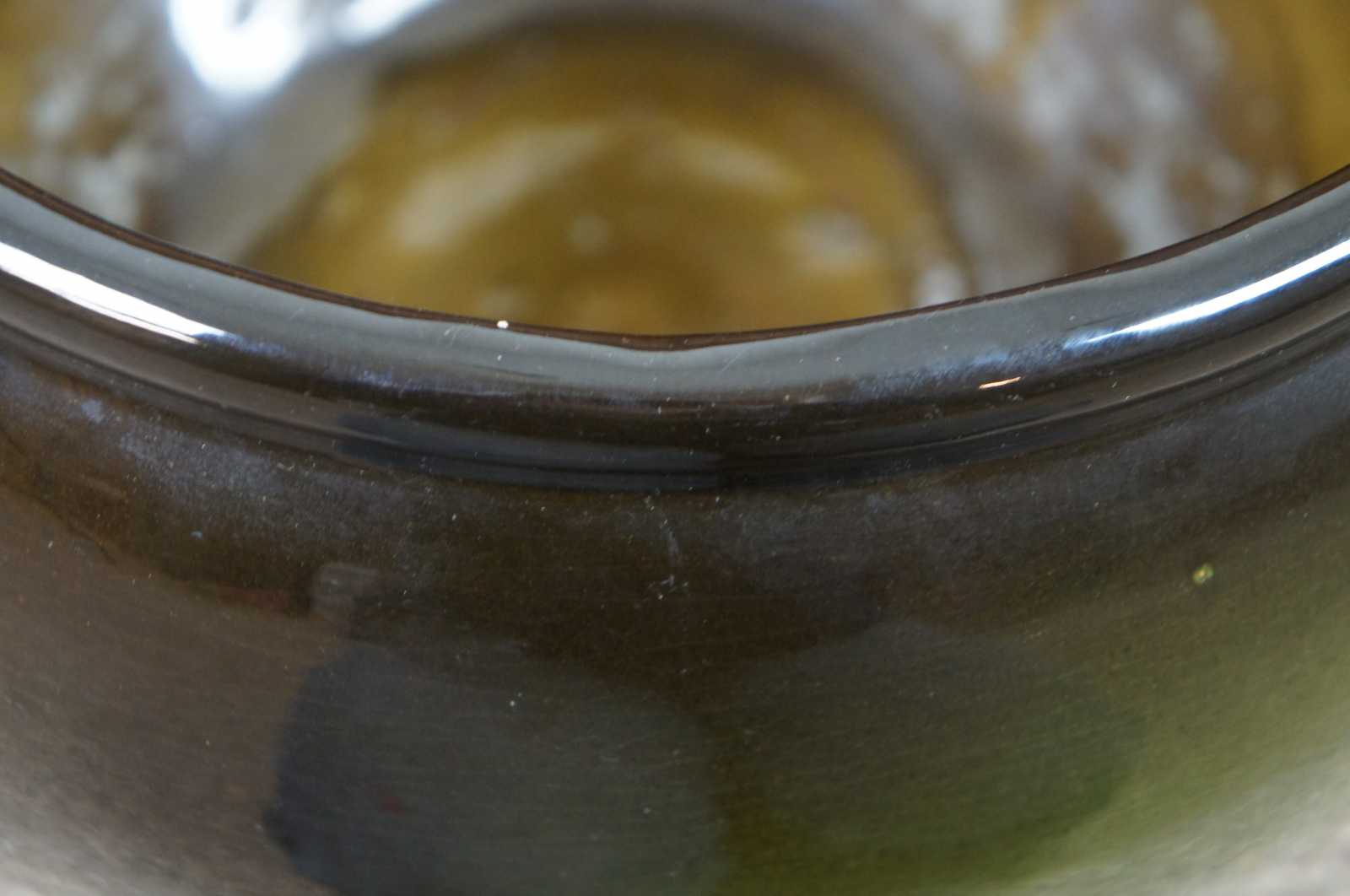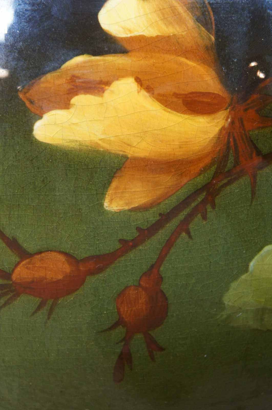 Vintage brown and green ceramic planter painted with yellow roses, by McCoy pottery and marked Loy-Nel-Art.
