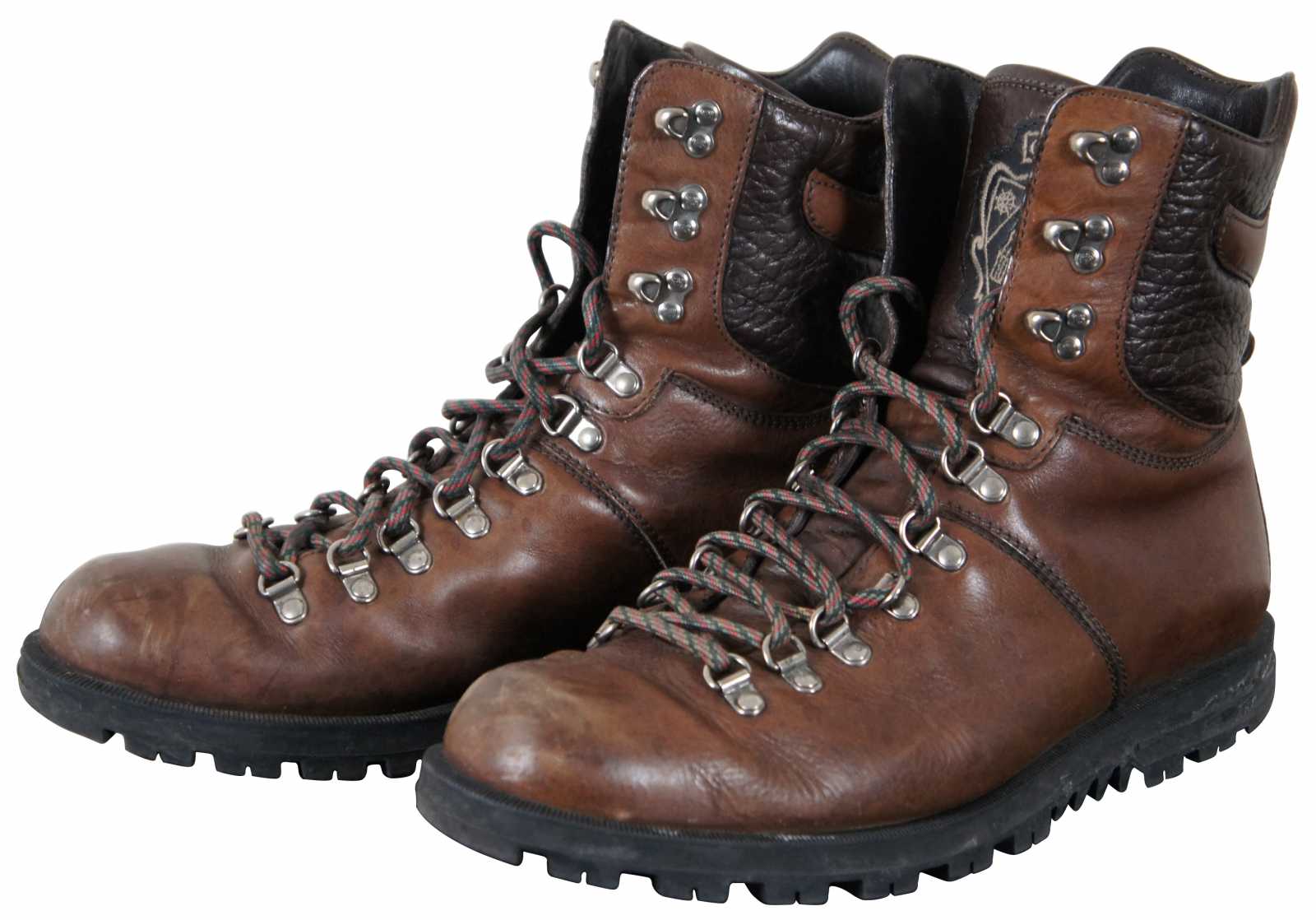 Gucci Mens brown leather ankle height hiking, trekking or winter boots with pebbled accents, product model number 181853.