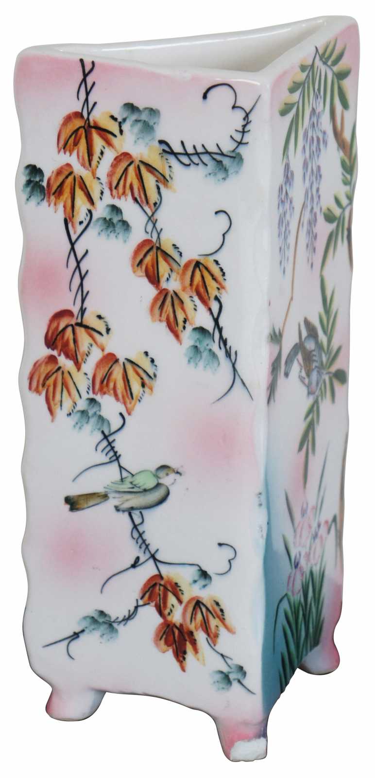 Vintage hand painted porcelain wall pocket /footed vase, probably made in Japan, marked 4020 on bottom. Features pink and blue shading of the background with leaves, flowers and birds.