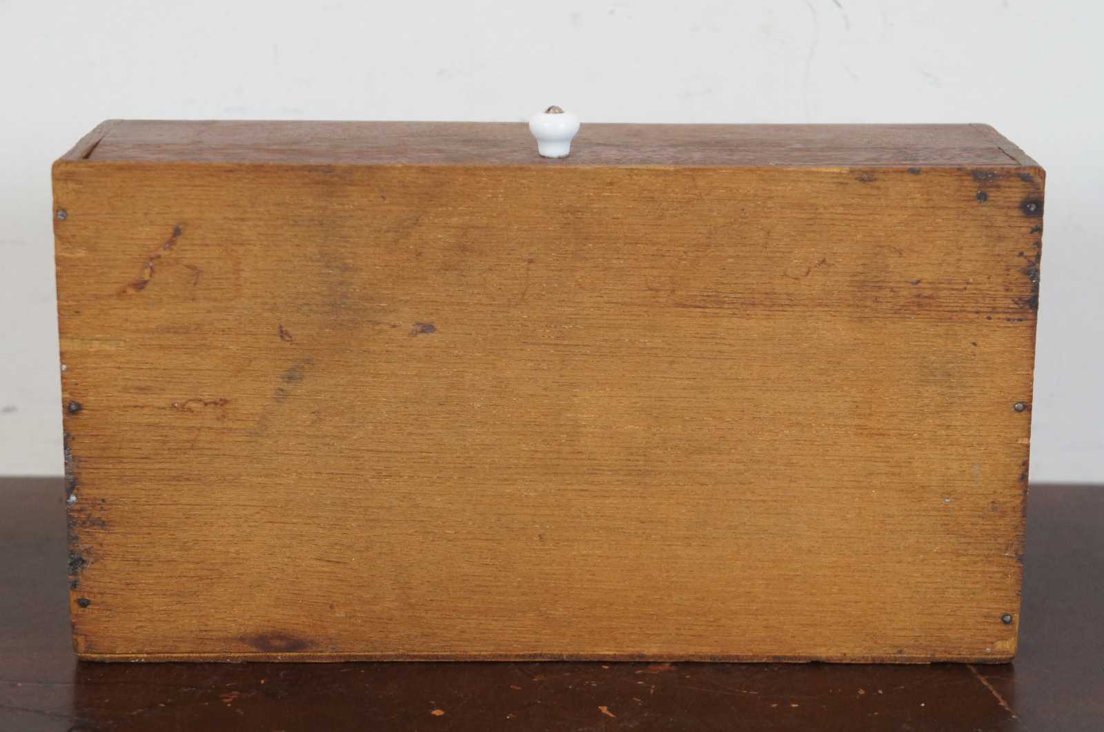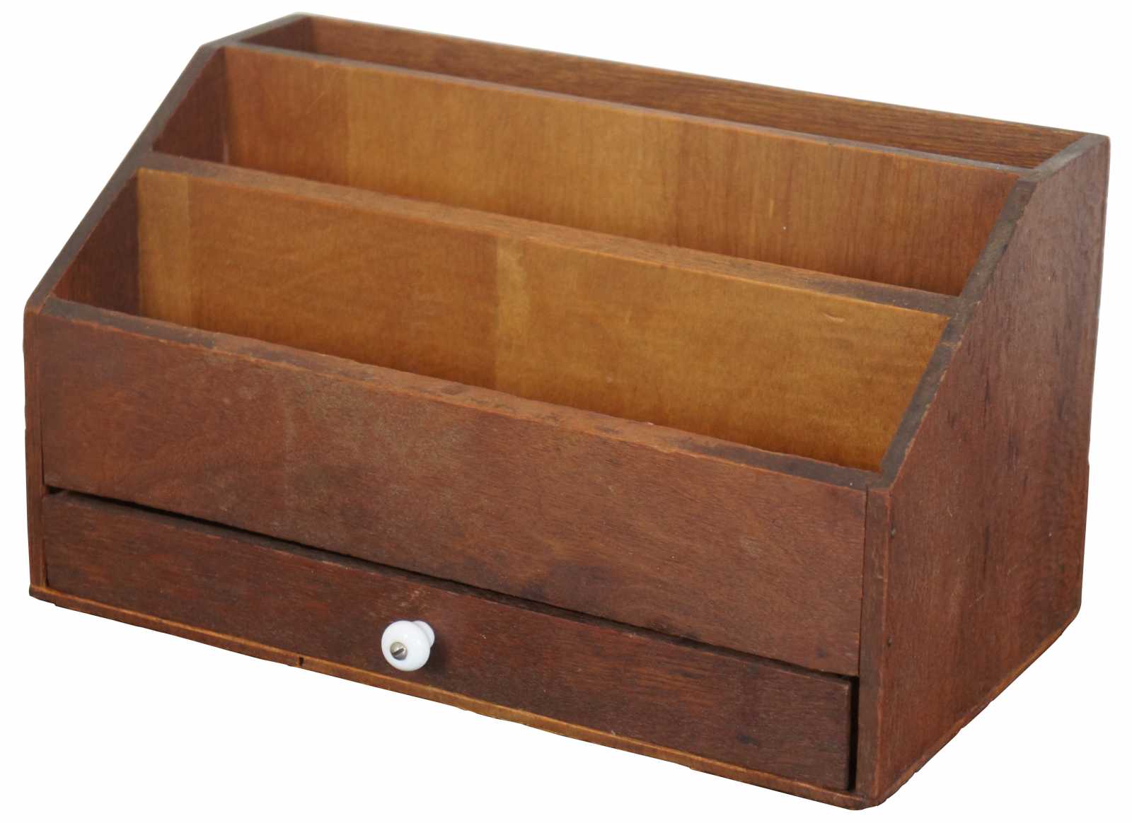 Antique three slot letter holder with single drawer at the base and porcelain knob pull.