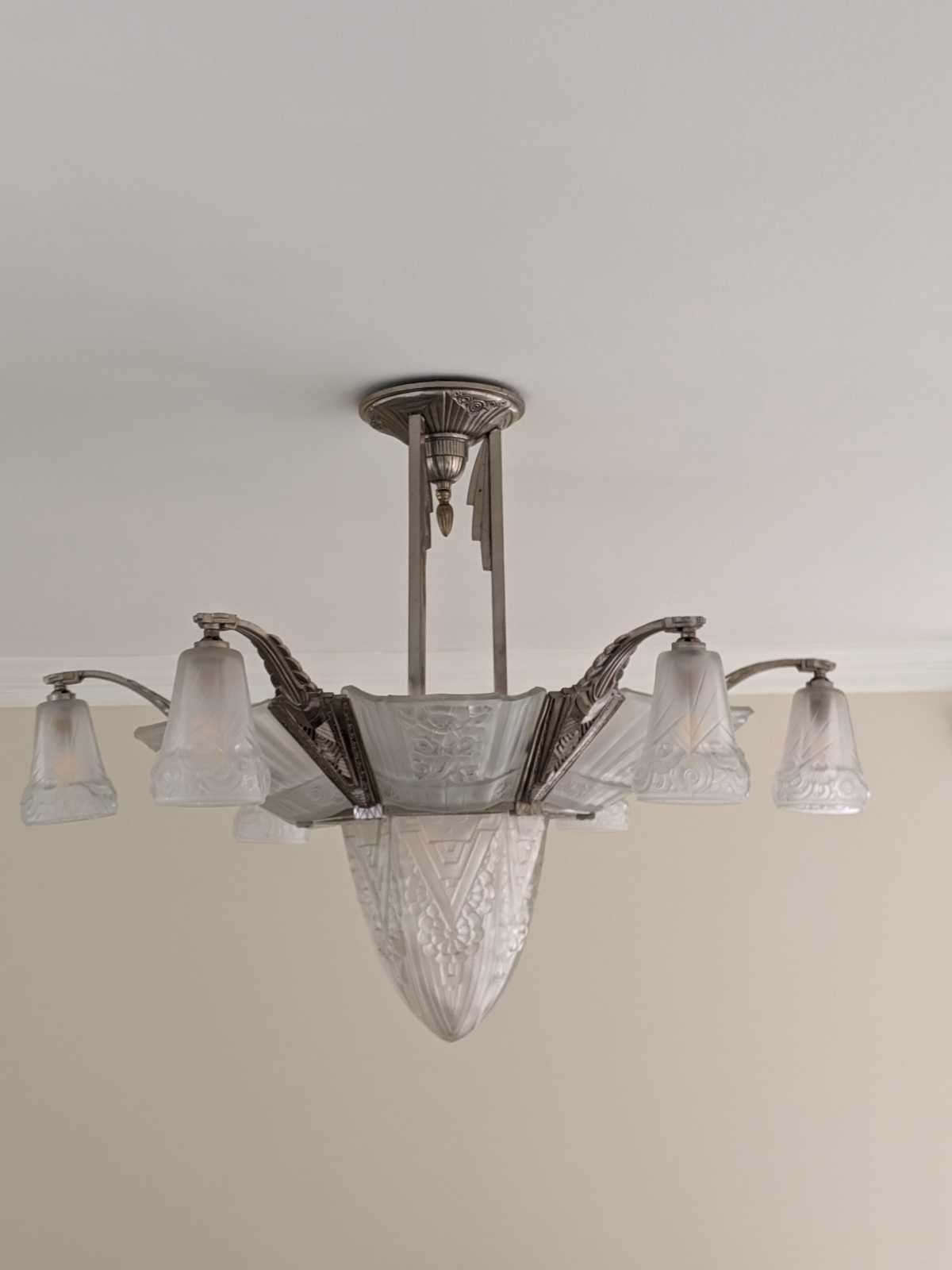 French Art Deco chandelier by Société d'Exploitation des Verreries de Bagneaux, 7 rue de Surène, Paris, France, 1920s. Nickel plated with thick molded glass slip shades and ornate central cone. (S.E.V.B)