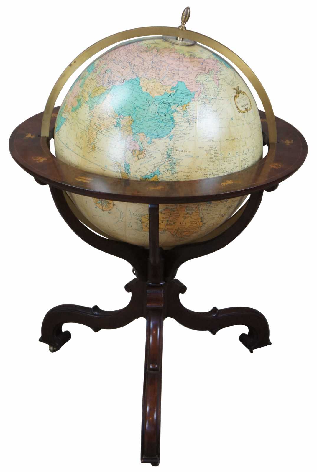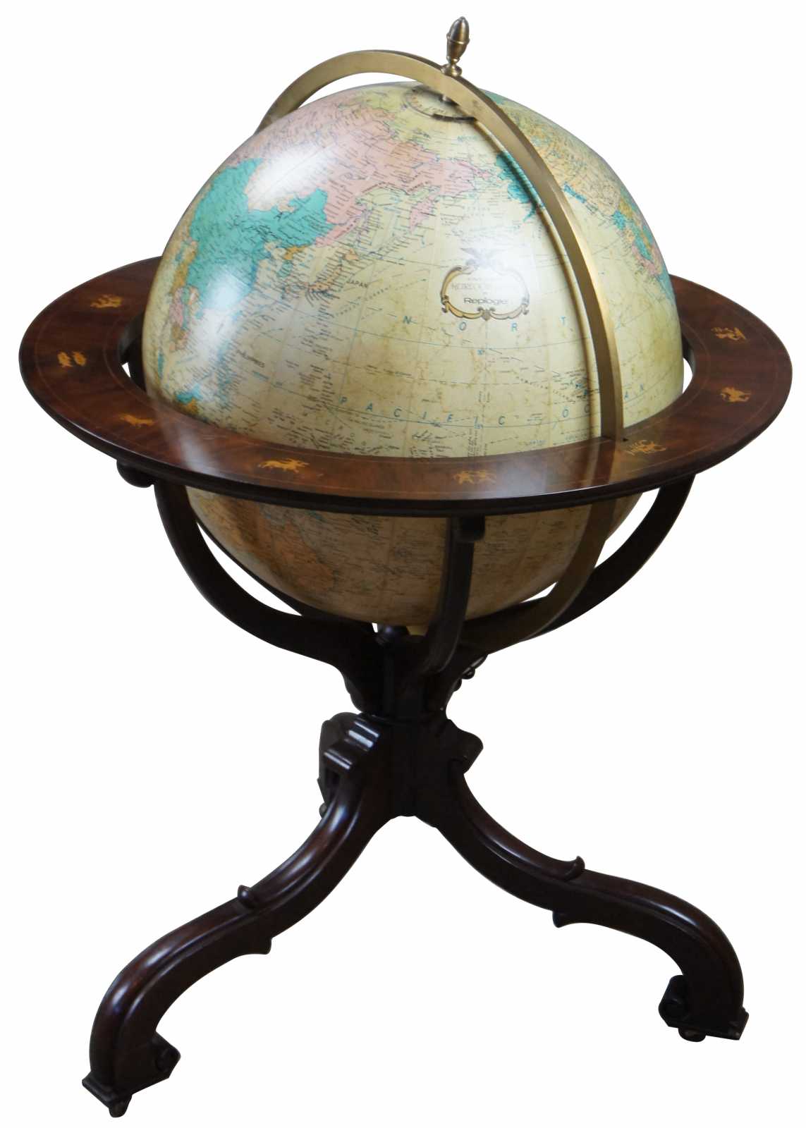 Baker Furniture Replogle Heirloom illuminated 20" globe. Features mahogany frame with scrolled feet and inlaid zodiac motif around the surface. The globe has a brass exoskeleton that grooves into the frame and illuminates by cord and switch.