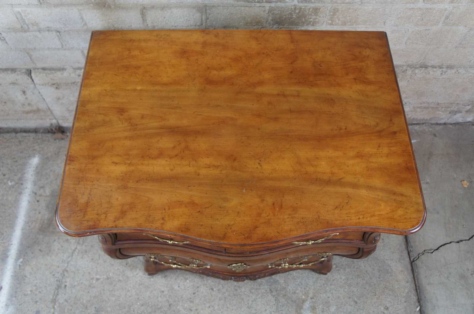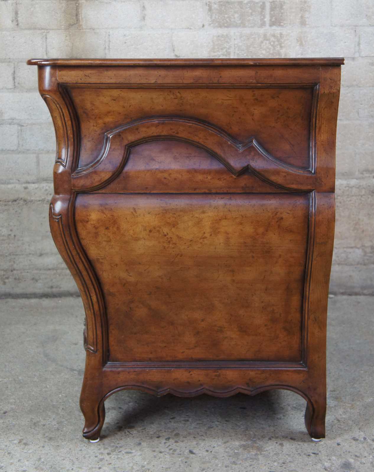 Baker Furniture McMillan Collection Bombe Chest. Inspired by classic Louis XV & French Provincial styling, Naturally distressed shaped walnut with a serpentine top. Features four drawers with brass mounts and faux keyholes, cabriole legs and a lower scalloped apron.
