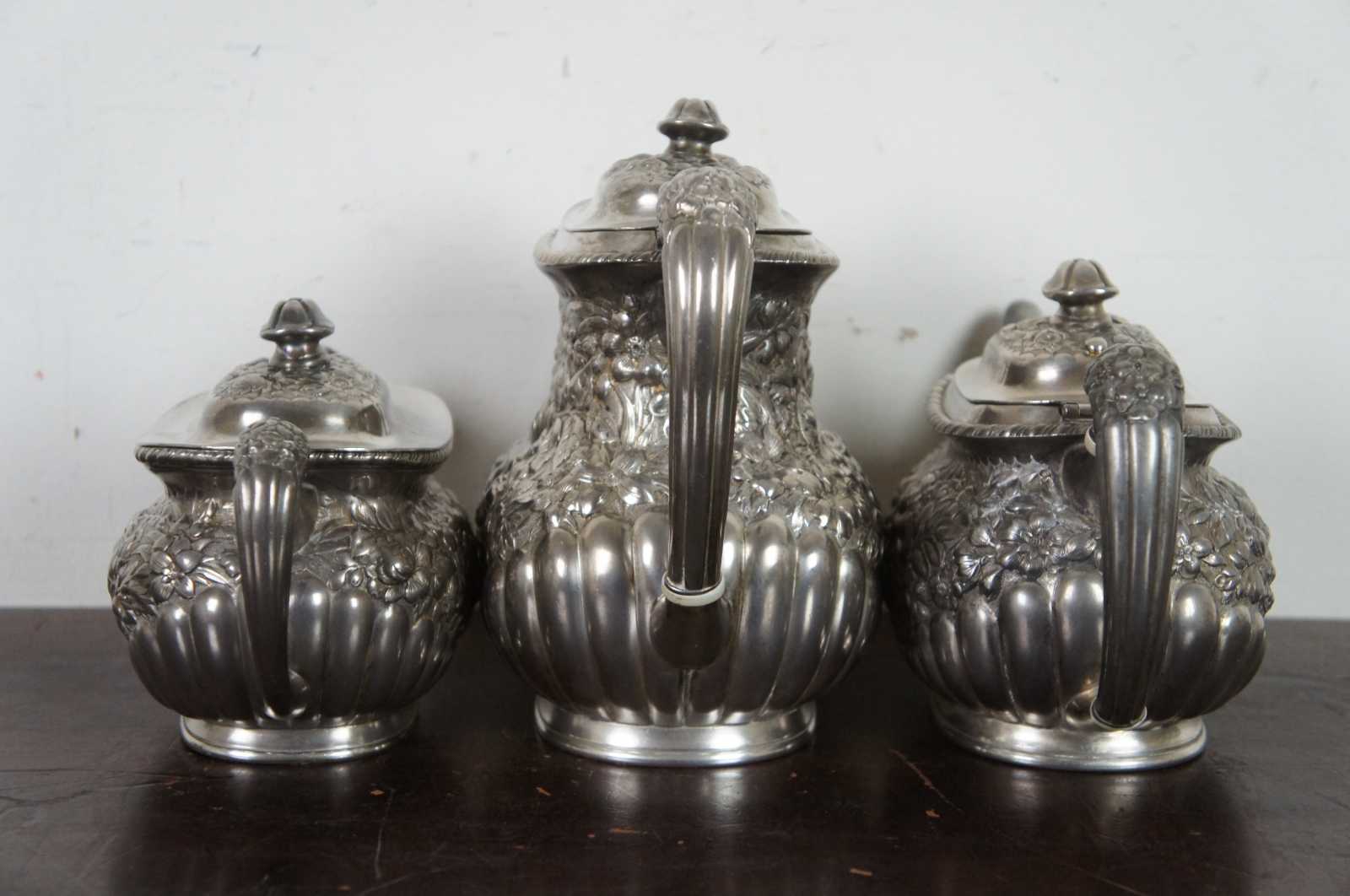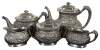 Five piece tea and coffee quadruple plate serving set by American Silver Plate Co, 3014, with a high relief repousse floral design. Made during the Aesthetic movement towards the last part of the Victorian era.