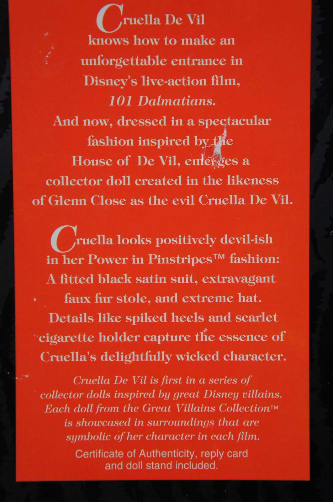 1996 Cruella De Vil Barbie doll from Disney’s live action movie 101 Dalmatians starring Glen Close, first in Mattel’s Great Villains Collection series.