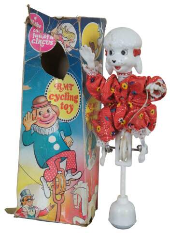 Vintage circus unicycle toy by RMT Enterprises, Li’l Edee the poodle. White plastic anthropomorphic poodle in a red floral romper, seated on a weighted unicycle; legs and wheel rotates when strings are pulled back and forth.