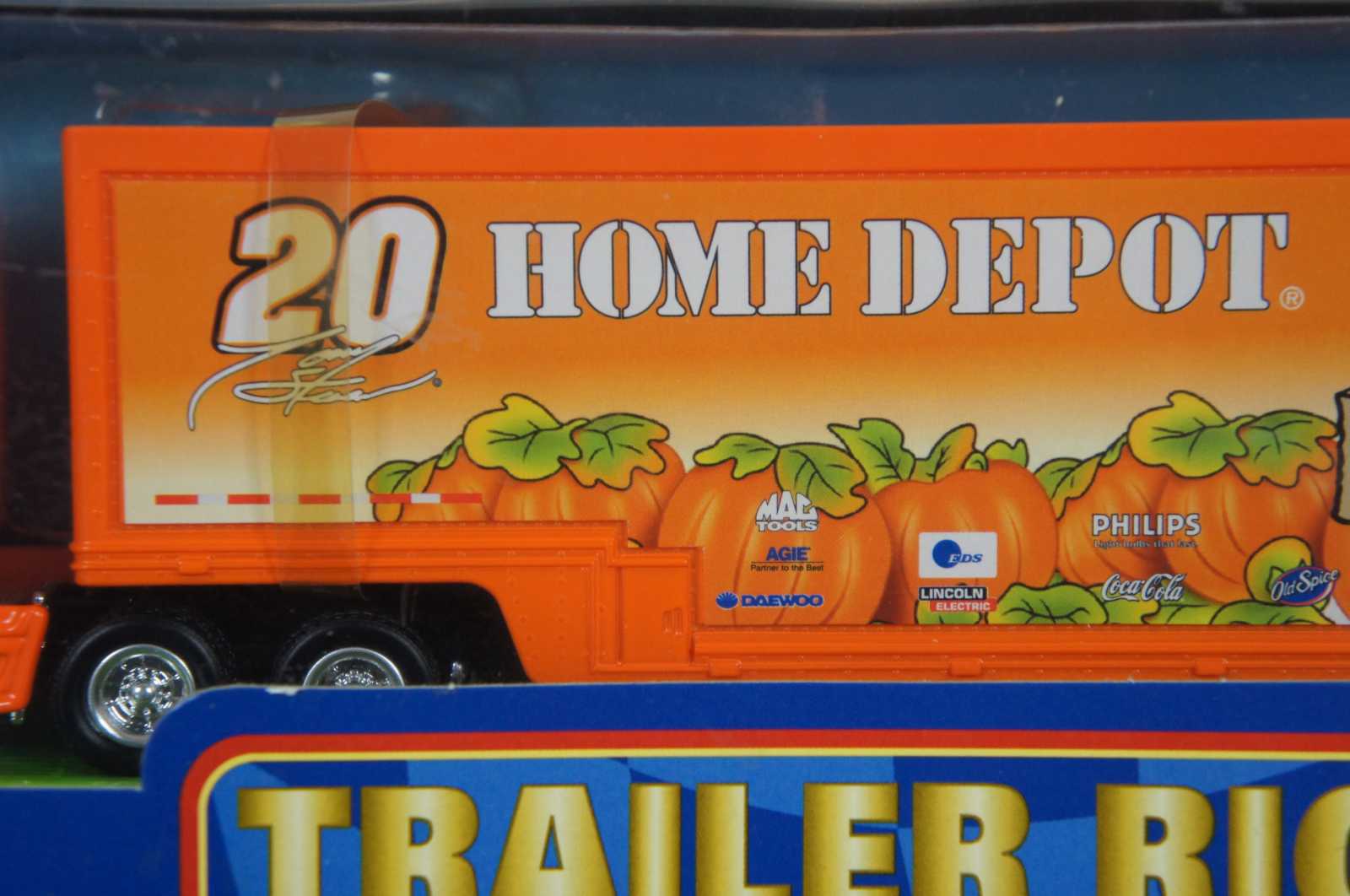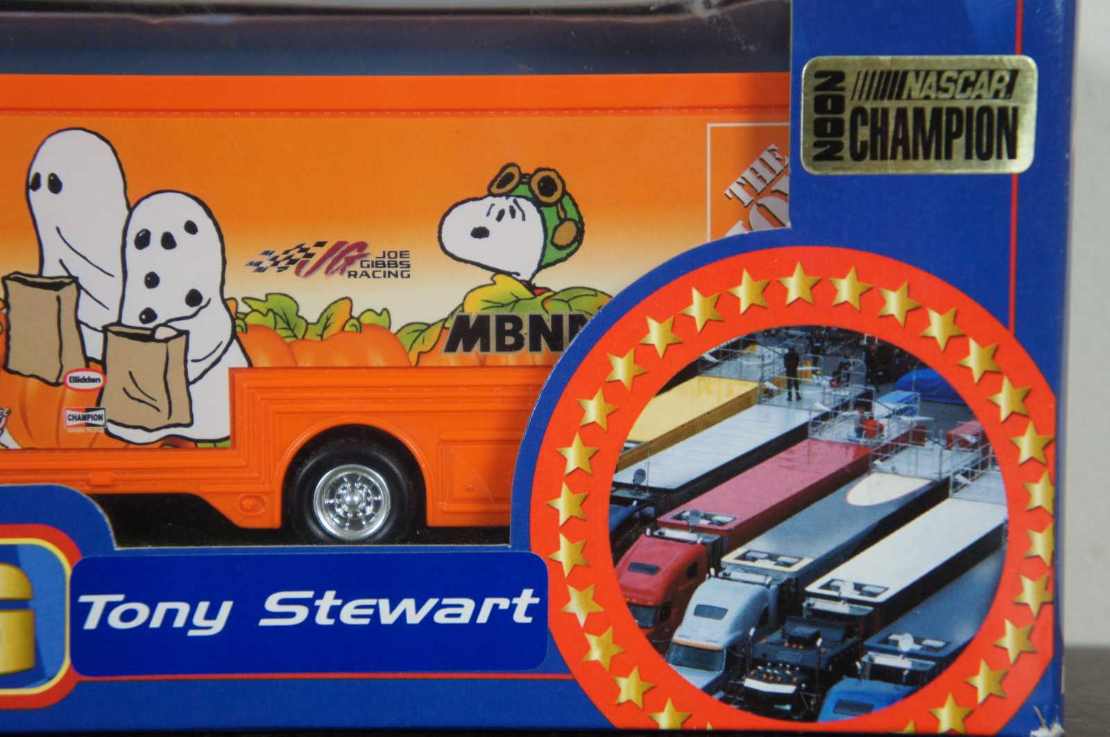 2002 NASCAR Champion Tony Stewart 20 Winner’s Circle trailer rig, featuring Home Depot branding with Snoopy and Peanuts characters from “It’s the Great Pumpkin, Charlie Brown.”