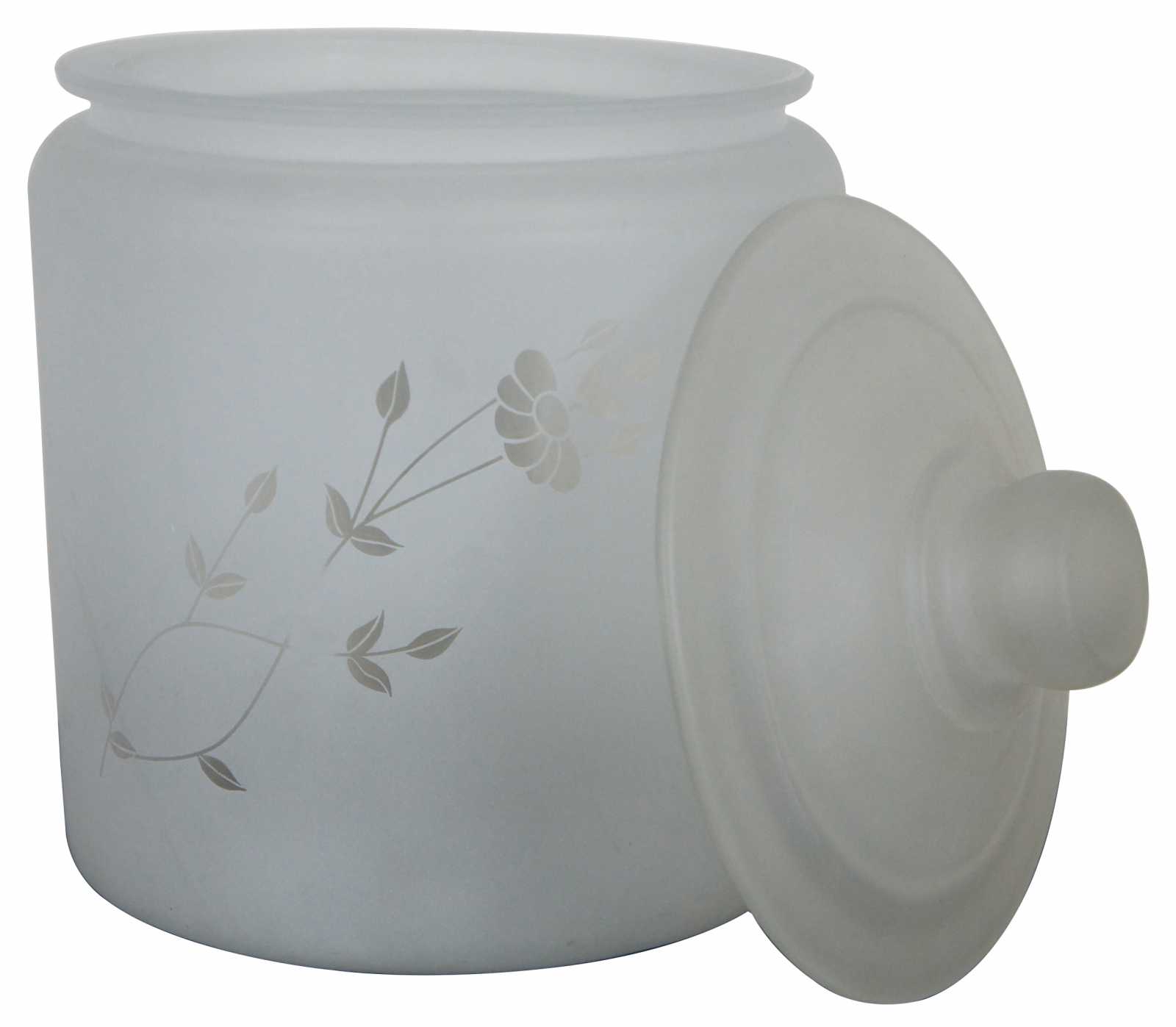 Vintage 1985 Princess House, Heritage Crystal, frosted glass cookie jar with a delicate flower design across the side.