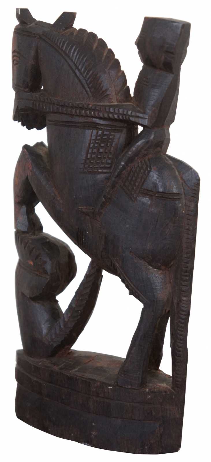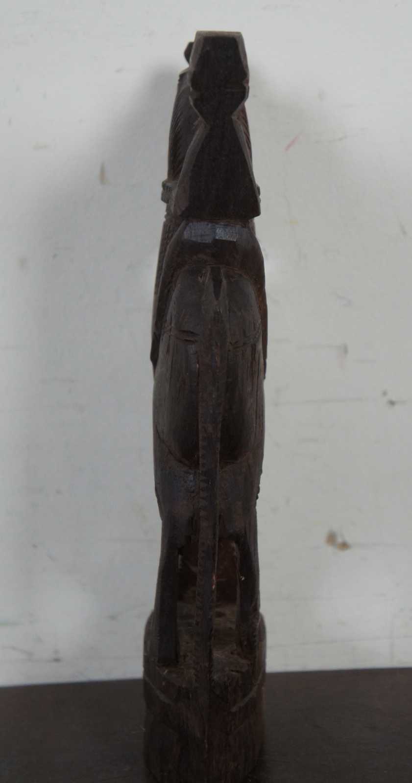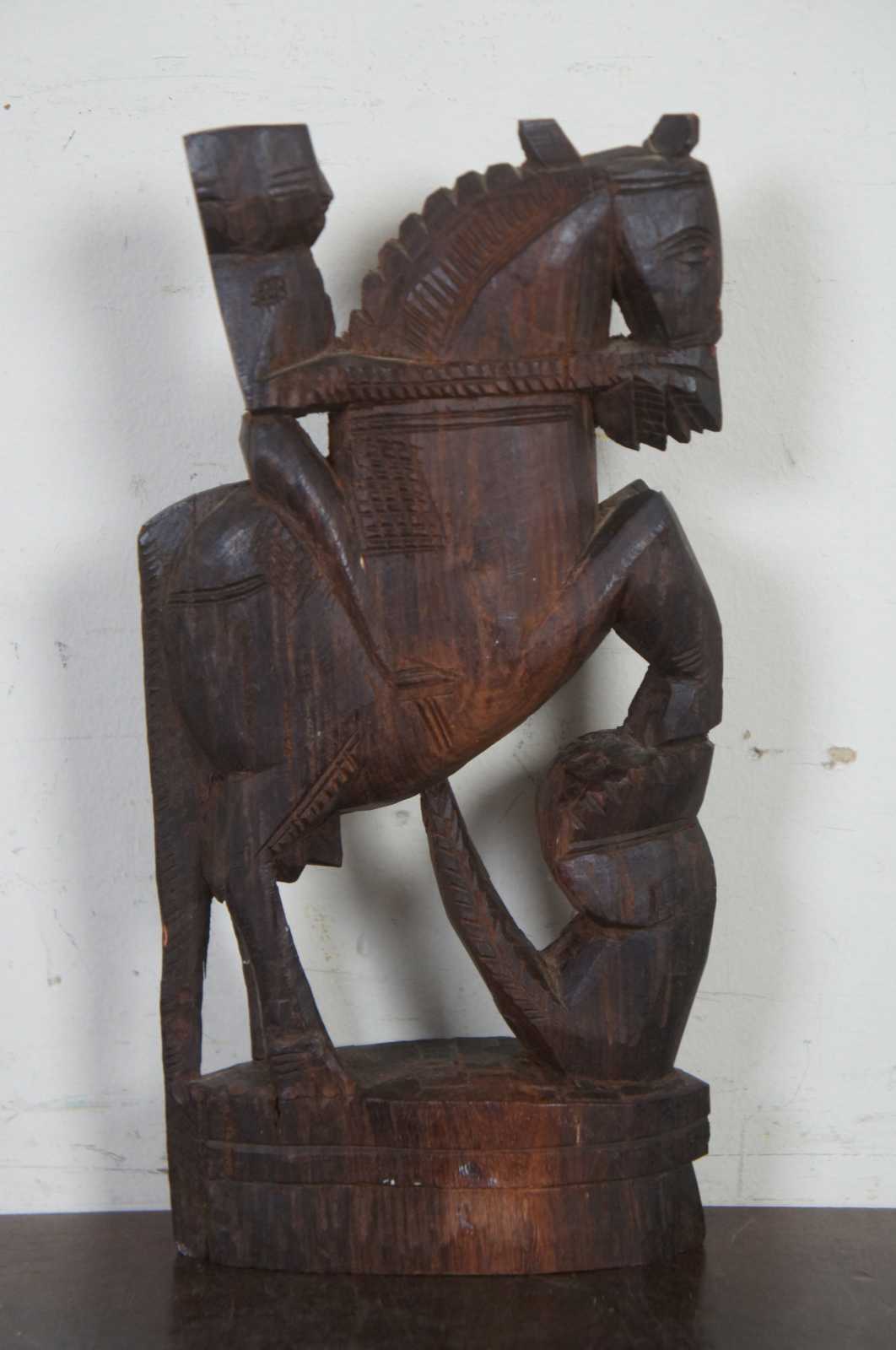 Vintage primitive style hand carved folk art horse and rider sculpture.