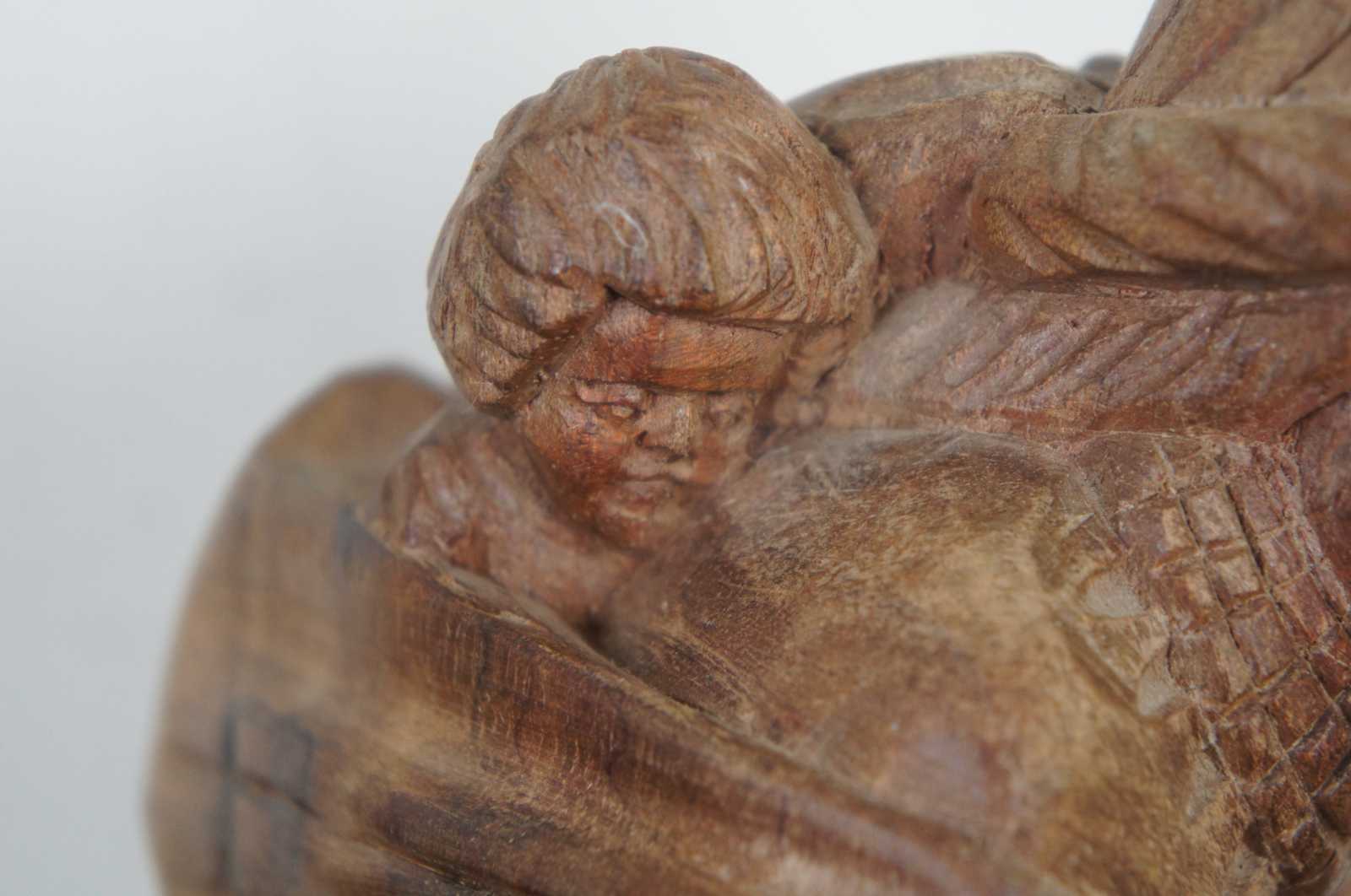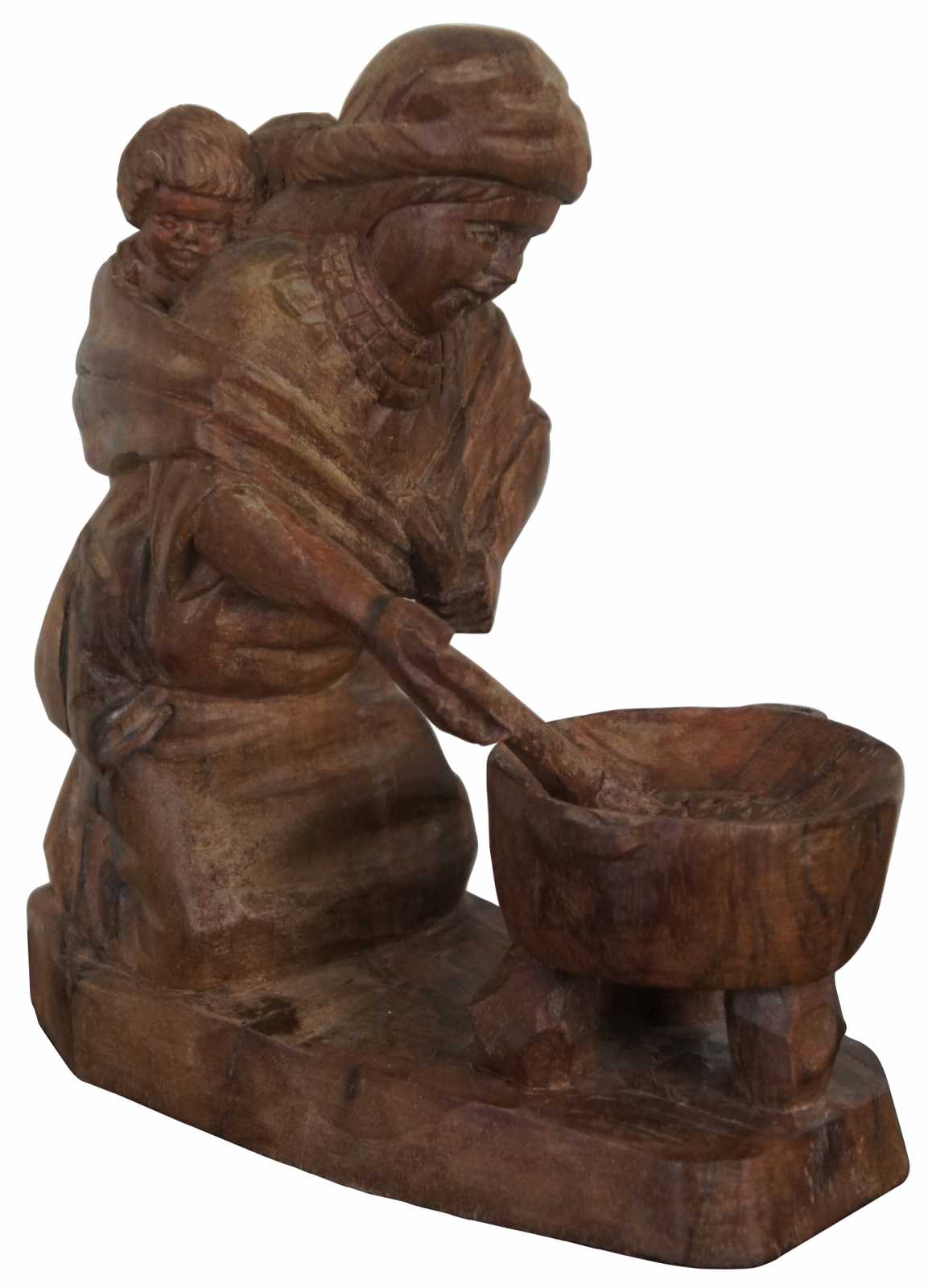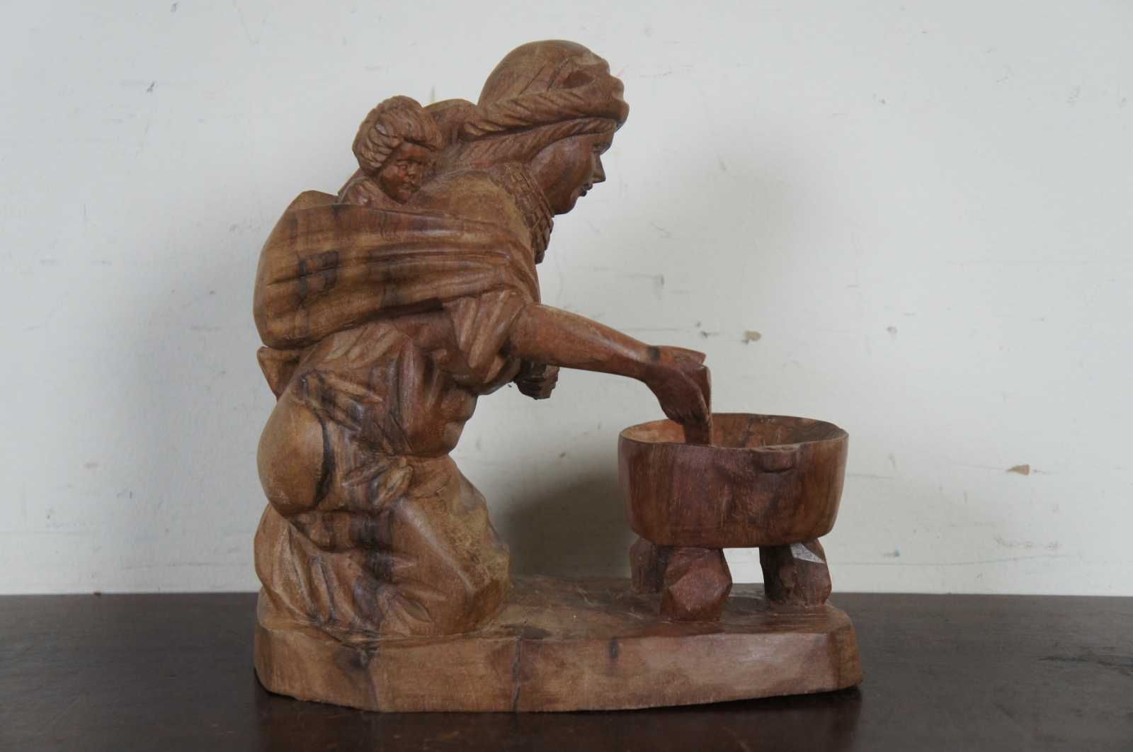 Vintage hand carved folk art figurine of a native woman in a shawl with a baby on her back, kneeling by and stirring a cooking pot.
