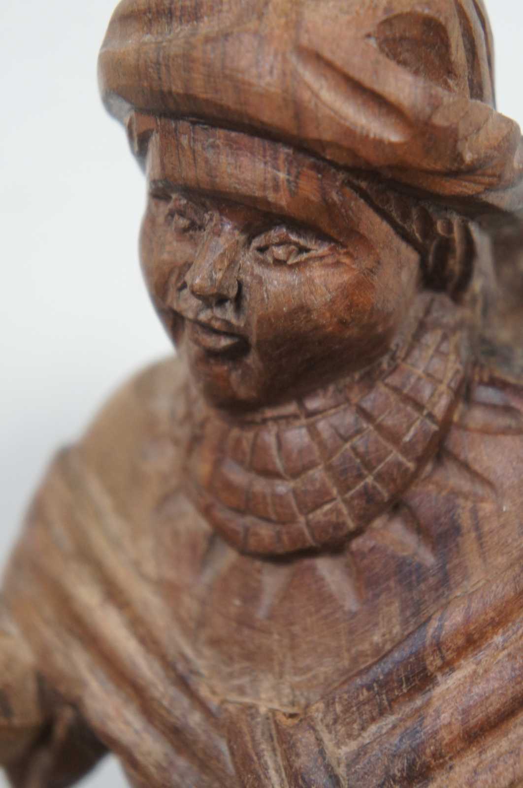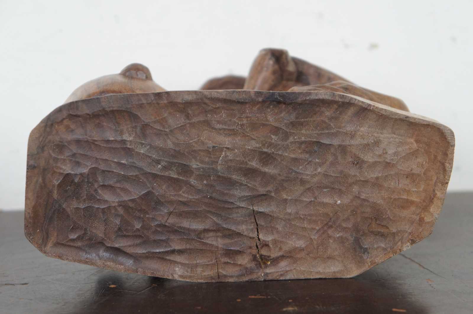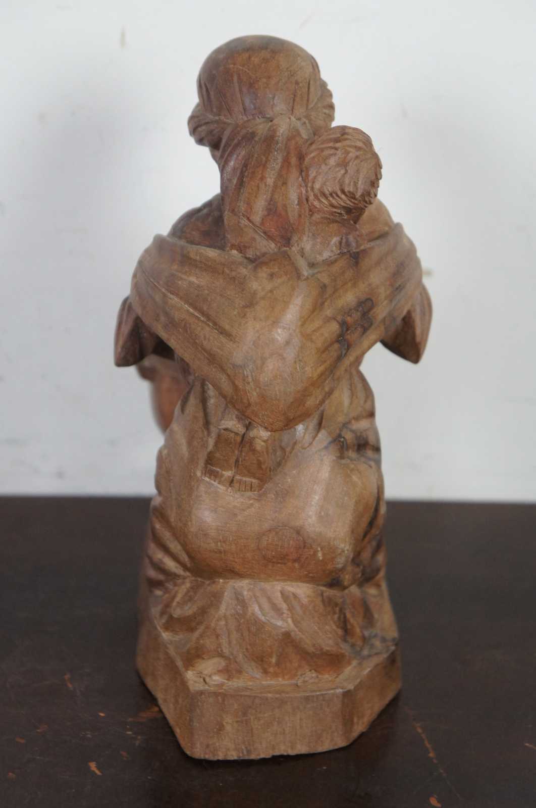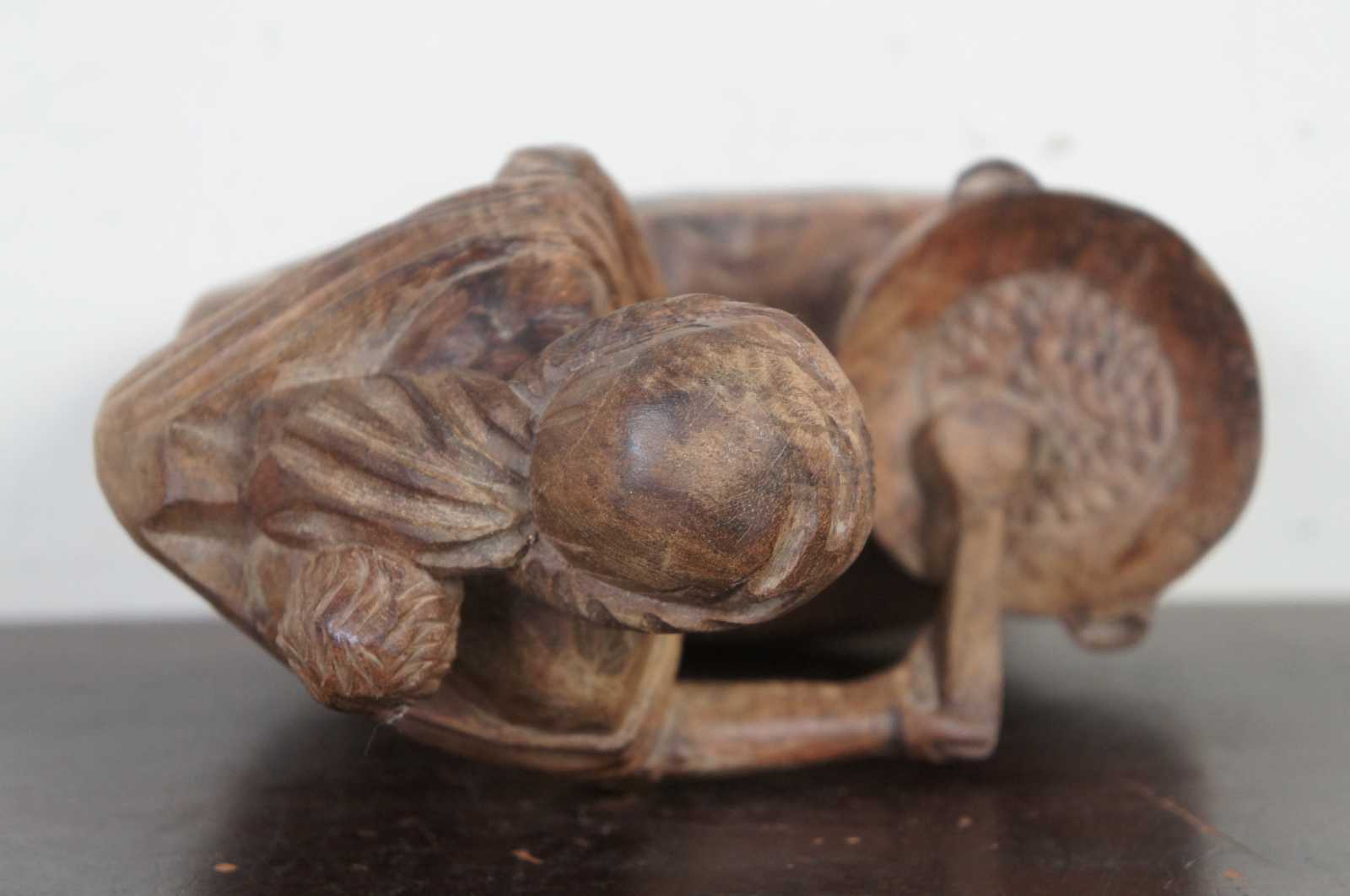 Vintage hand carved folk art figurine of a native woman in a shawl with a baby on her back, kneeling by and stirring a cooking pot.