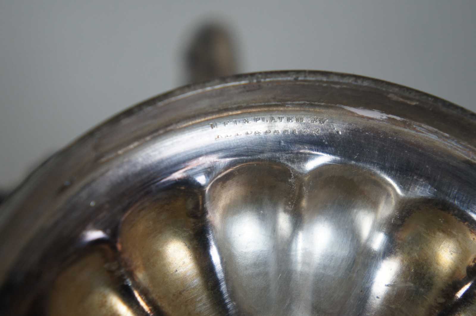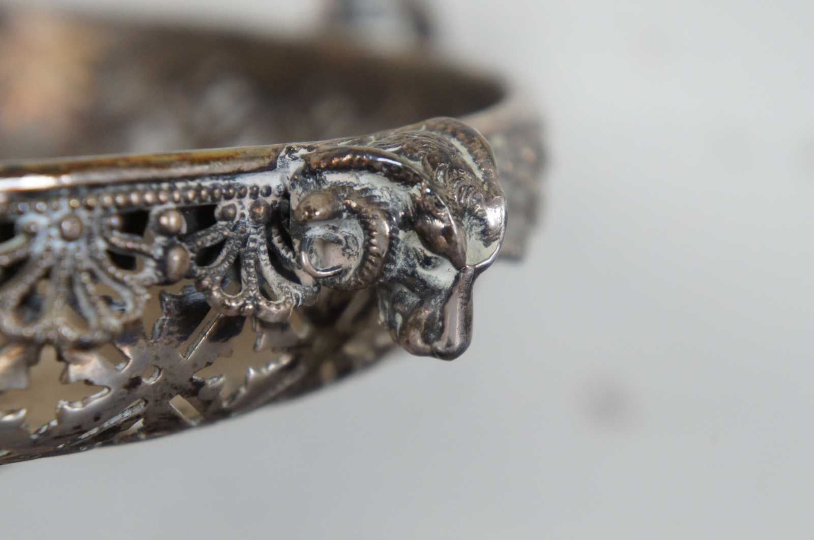 Antique Reed and Barton silver plated bride’s basket or footed compote with reticulated sides, two handles, and ram’s head accents.