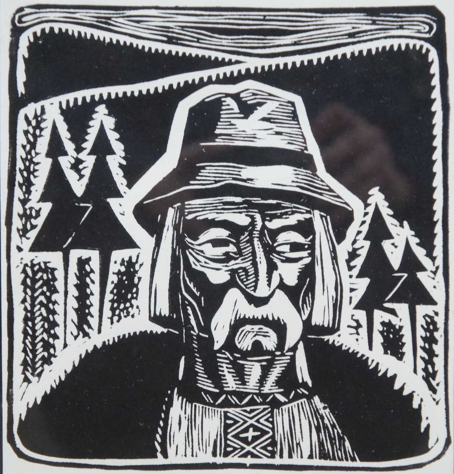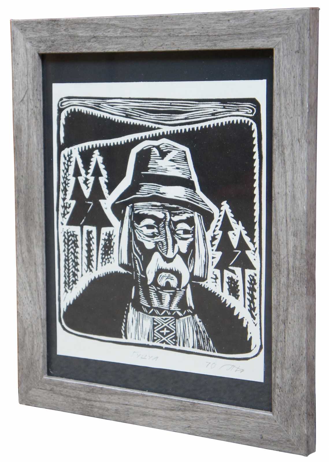 Vintage 1970 black and white Ukrainian etching by Lanyak Dmytro Oleksiiovych titled ""Hutsul"" and featuring a portrait of an older man against a tree line or forest wearing a hat with a nice mustache. Hutsuls are an ethnic group spanning parts of western Ukraine and Romania (parts of Bukovina and Maramures). The origin of the name Hutsul is uncertain. The most common derivations are from the Romanian word for ""outlaw"" (cf. Rom. hoț–""thief"", hoțul–""the thief""), and the Slavic kochul (Ukr. kochovyk–""nomad"") which is a reference to the semi-nomadic shepherd lifestyle or the inhabitants who fled into the mountains after the Mongol invasion.