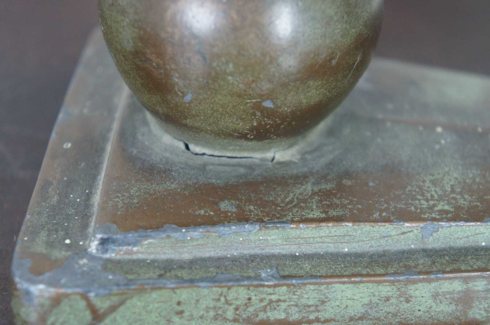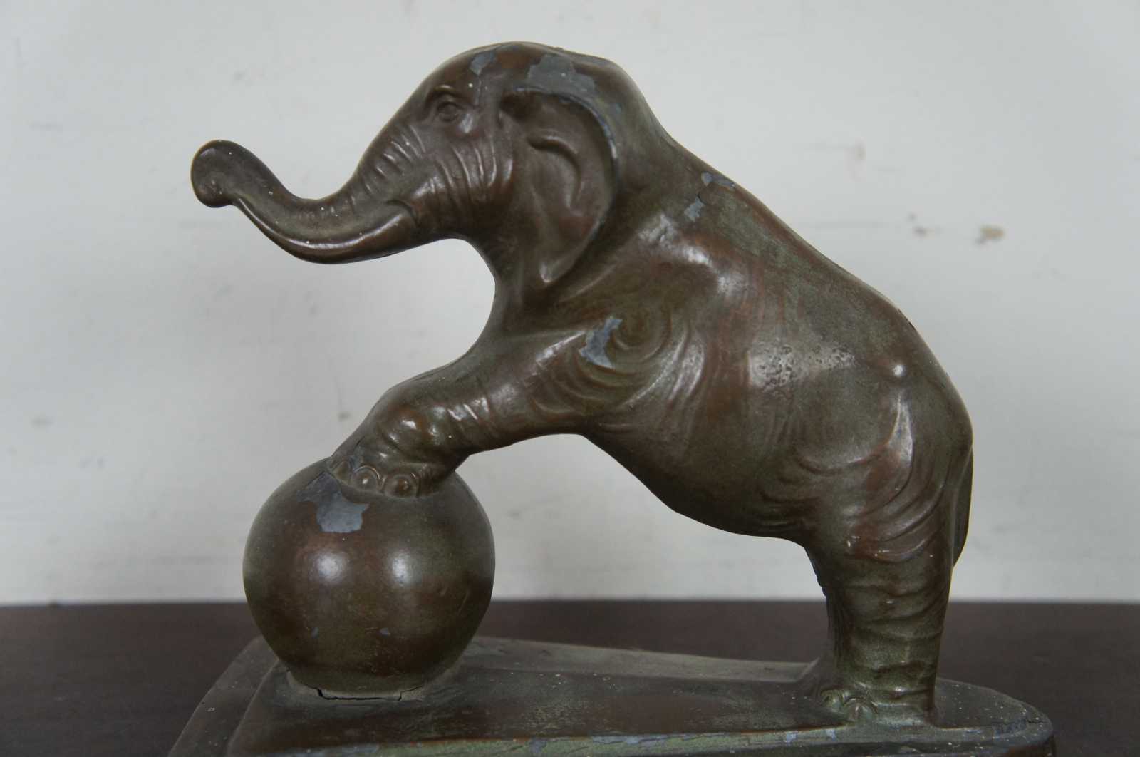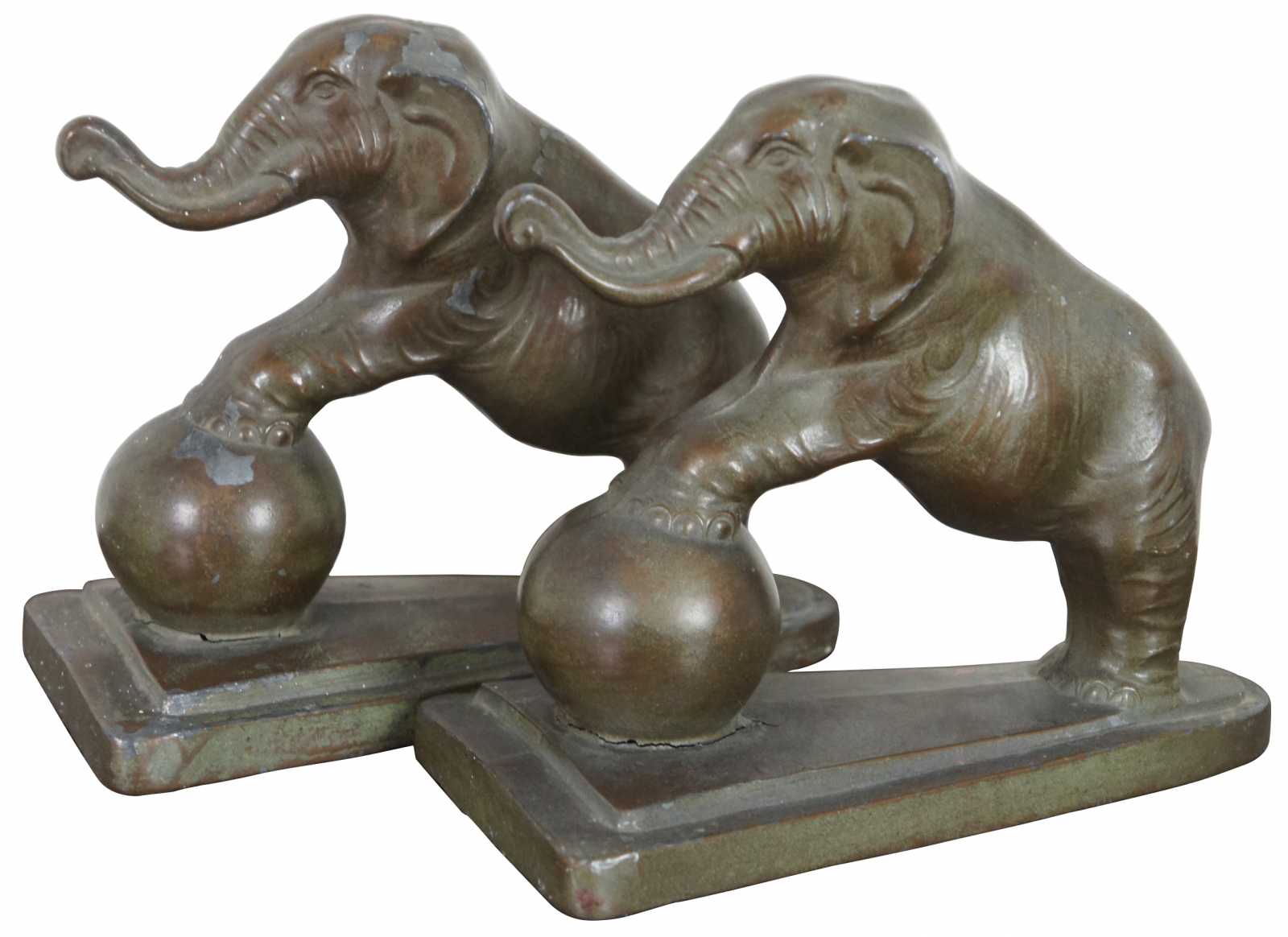 Antique art deco metal bookends in the shape of elephants with raised trunks, front feet balanced on a large ball and triangular base.