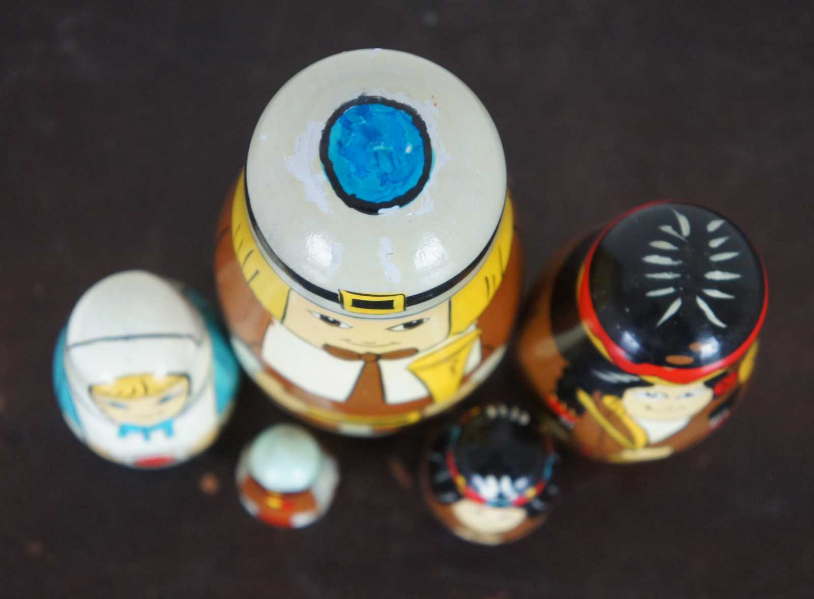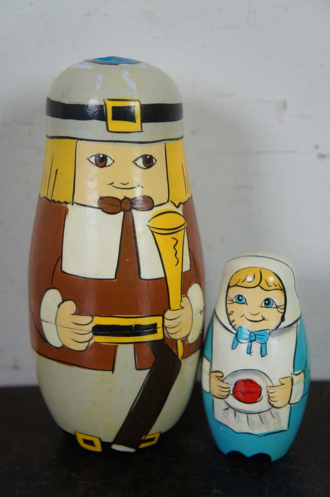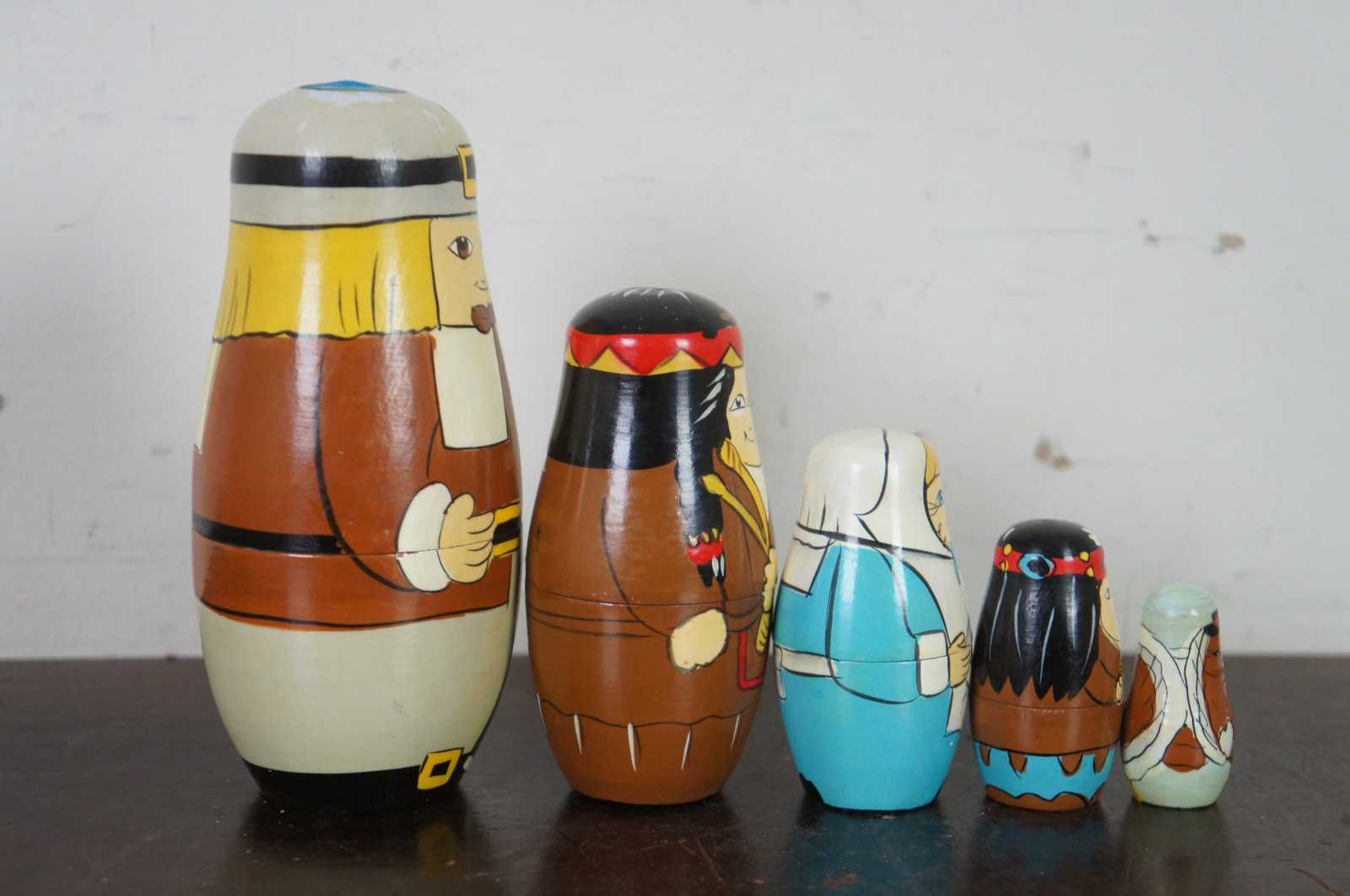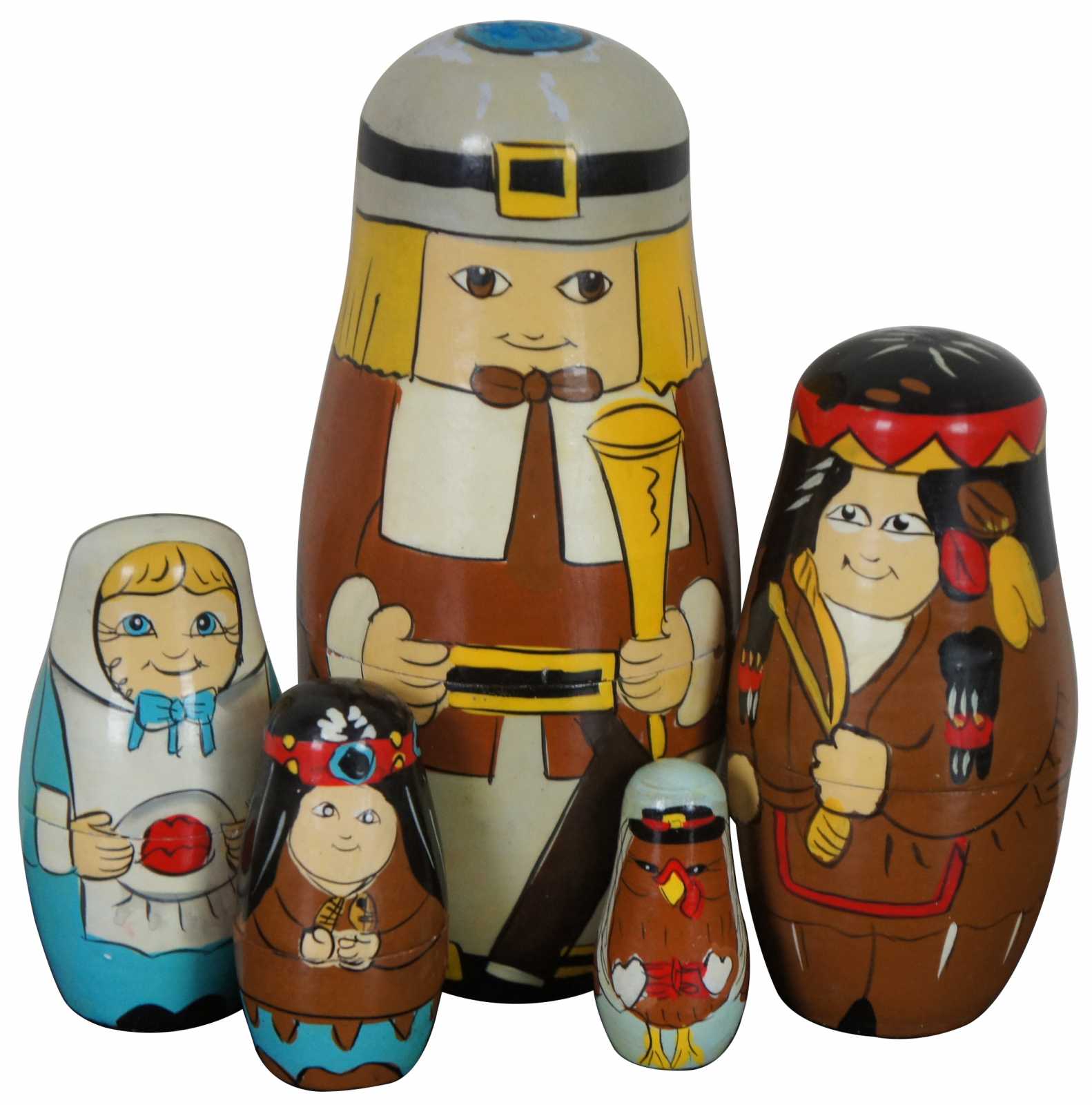 Vintage five piece set of American Thanksgiving themed nesting dolls featuring two Pilgrims, two Native Americans and a turkey.