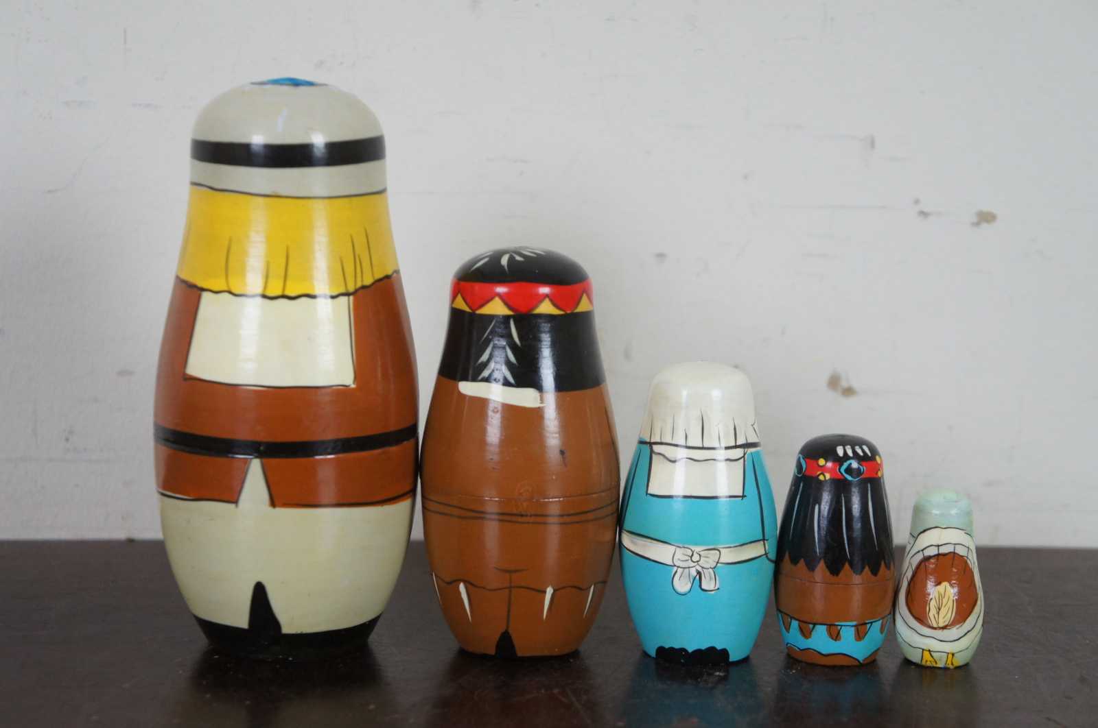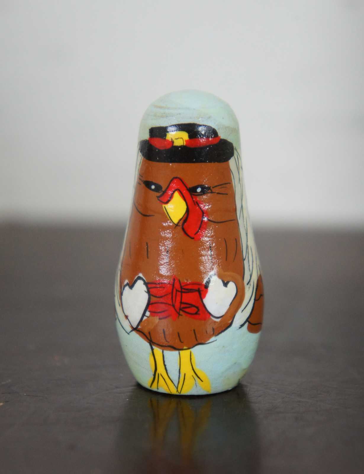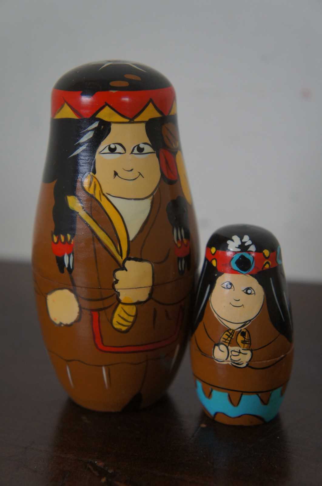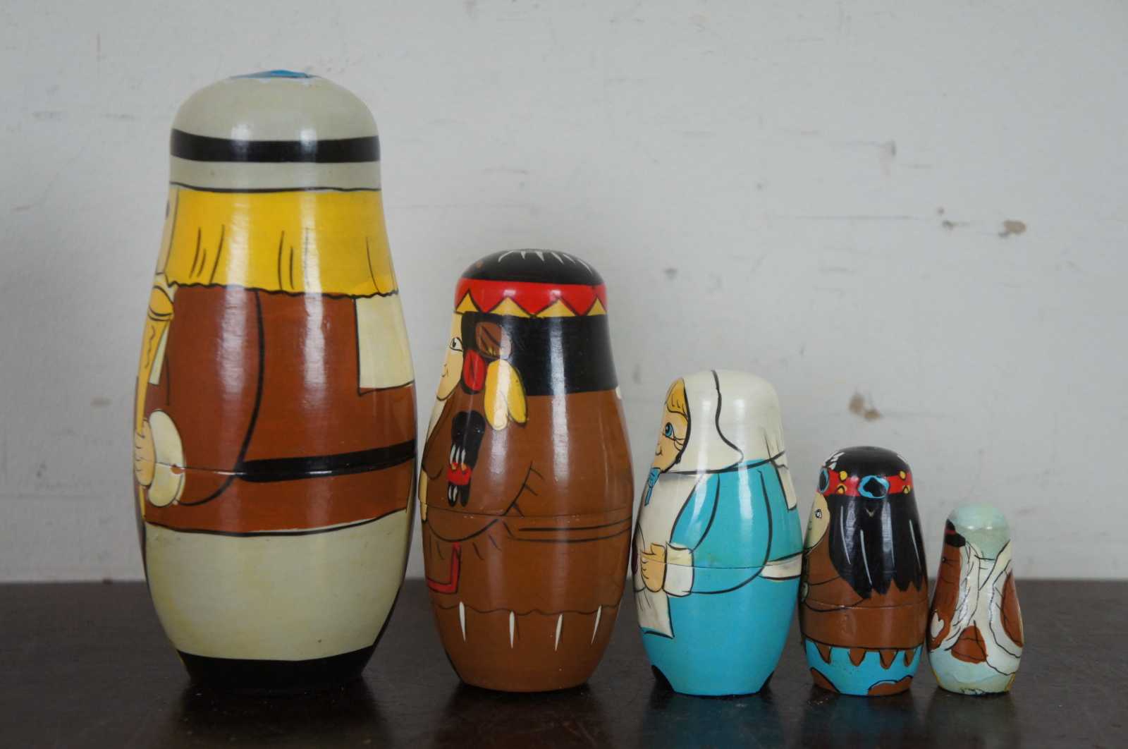 Vintage five piece set of American Thanksgiving themed nesting dolls featuring two Pilgrims, two Native Americans and a turkey.