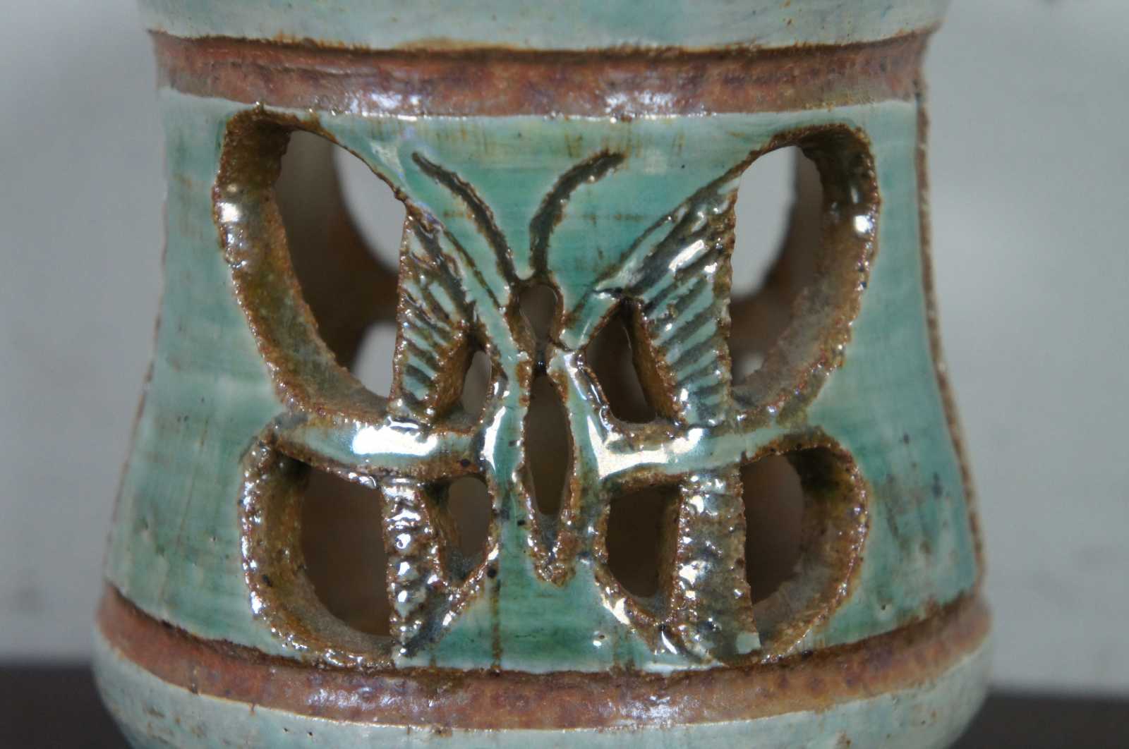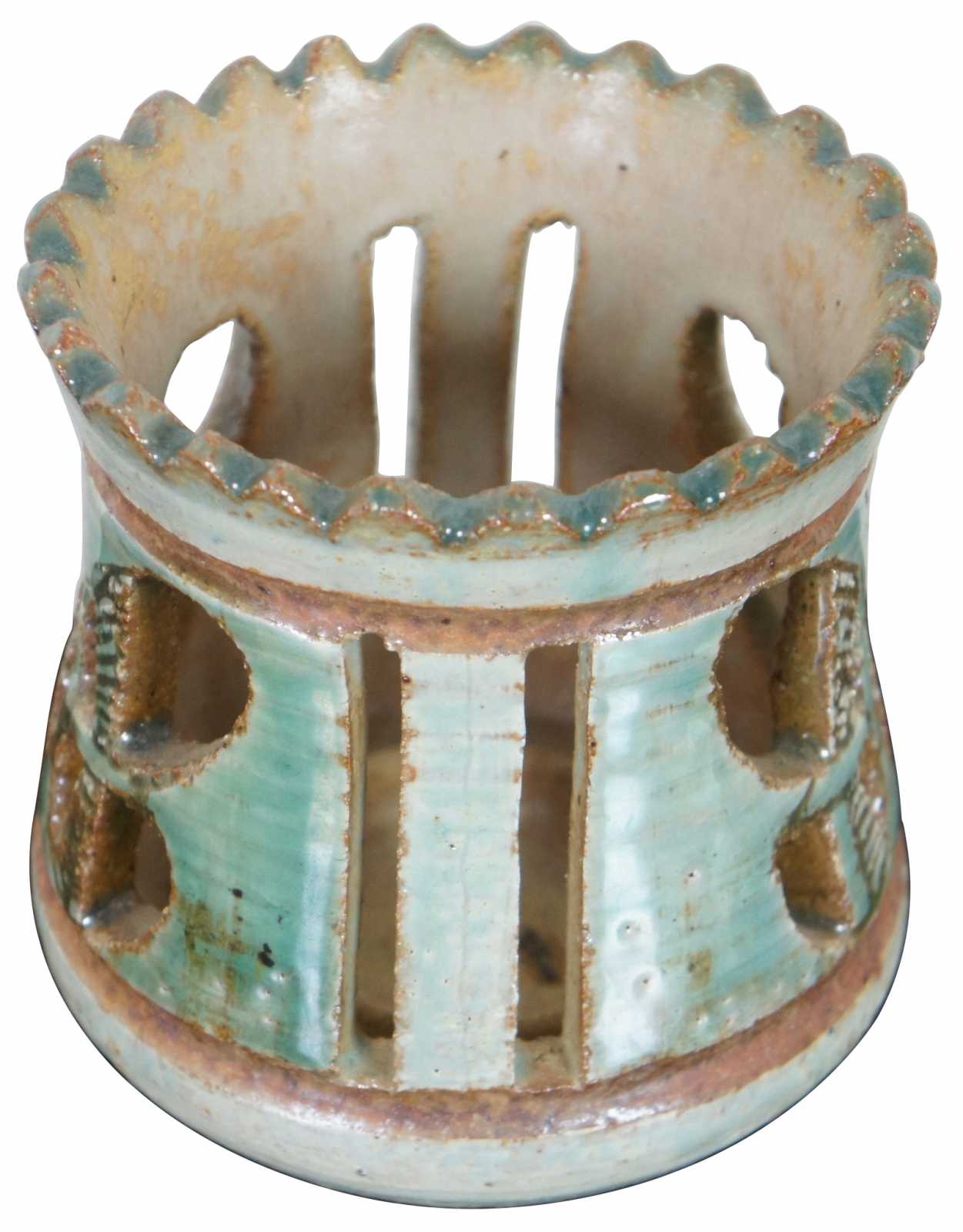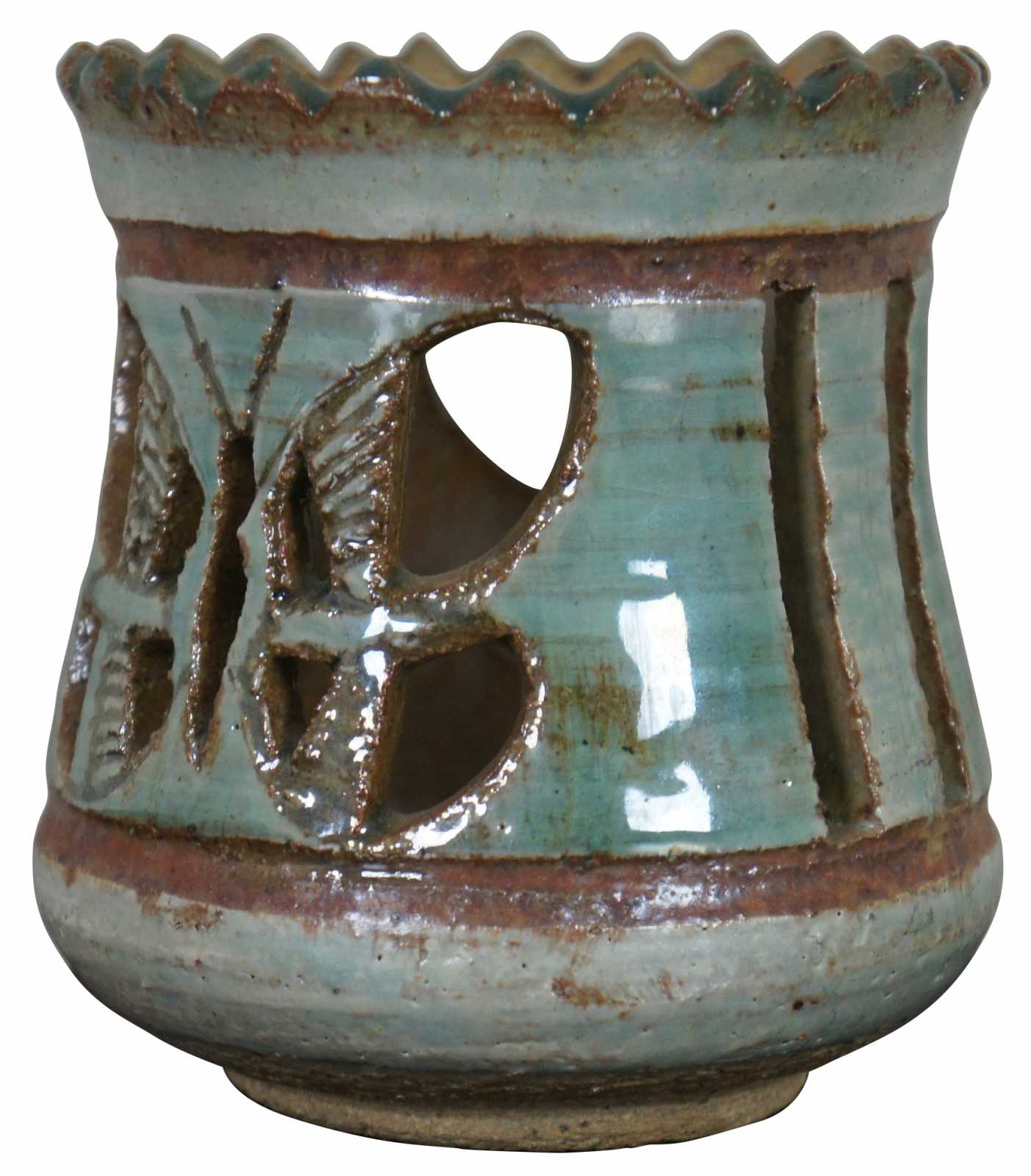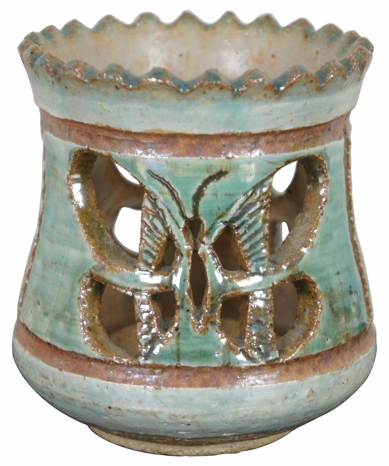 Vintage hand made ceramic candle holder by John Nartker, featuring a pierced butterfly design and a light turquoise glaze with brown details. Signed on vase. BIO: John Nartker (1930-1988) is a multi-media artist whose specialties are painting, printmaking, and designing in clay. His works have been shown in over 250 one-man, group, and invitational exhibitions both in the United States and abroad, and are included in public, private and corporate collections. John was awarded the Ohioana Citation as the outstanding visual artist in Ohio for the year 1985 and is the recipient of an Outstanding Educator in American Colleges and Universities award. His works have been published in “The Guild” by Kraus-Sikes of New York City. “The Great Chess Set” was included in the 1987 “Guiness Book of World Records. Kalida native John Nartker resided many years with his family in Cincinnati, OH and served as Professor of art at the College of Mount St. Joseph.