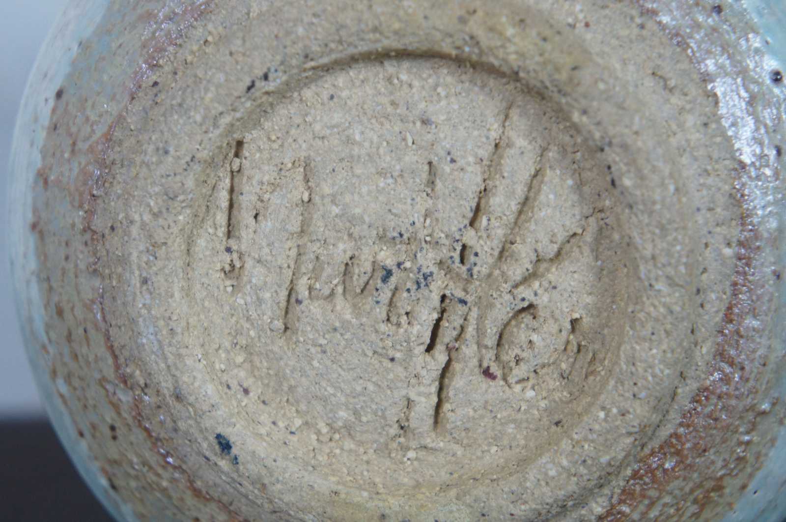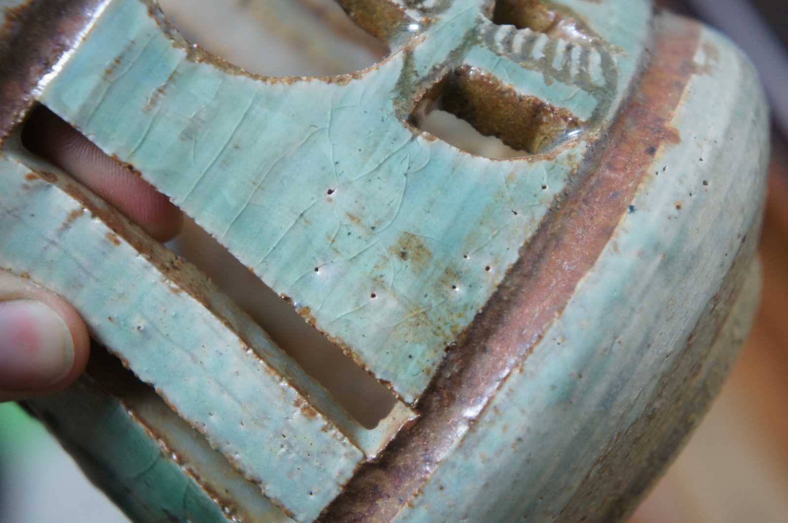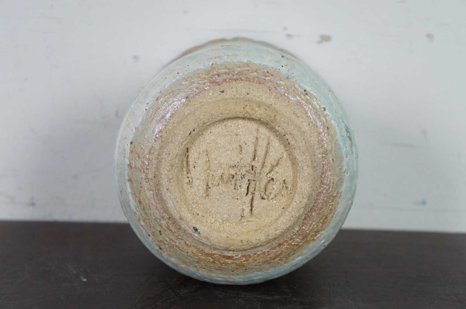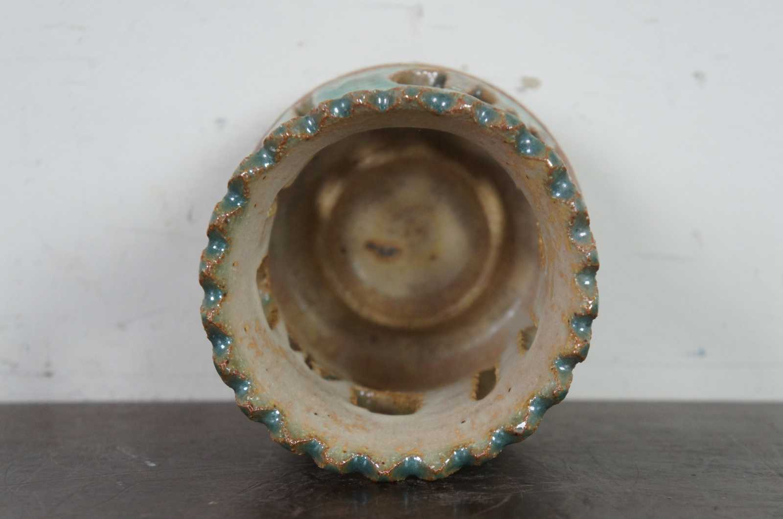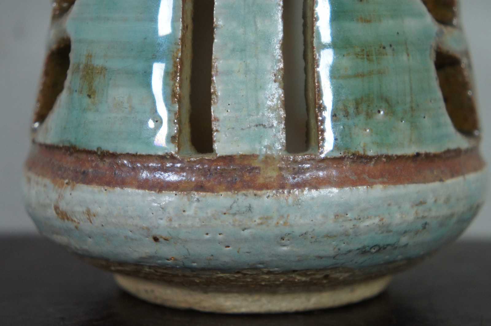 Vintage hand made ceramic candle holder by John Nartker, featuring a pierced butterfly design and a light turquoise glaze with brown details. Signed on vase. BIO: John Nartker (1930-1988) is a multi-media artist whose specialties are painting, printmaking, and designing in clay. His works have been shown in over 250 one-man, group, and invitational exhibitions both in the United States and abroad, and are included in public, private and corporate collections. John was awarded the Ohioana Citation as the outstanding visual artist in Ohio for the year 1985 and is the recipient of an Outstanding Educator in American Colleges and Universities award. His works have been published in “The Guild” by Kraus-Sikes of New York City. “The Great Chess Set” was included in the 1987 “Guiness Book of World Records. Kalida native John Nartker resided many years with his family in Cincinnati, OH and served as Professor of art at the College of Mount St. Joseph.
