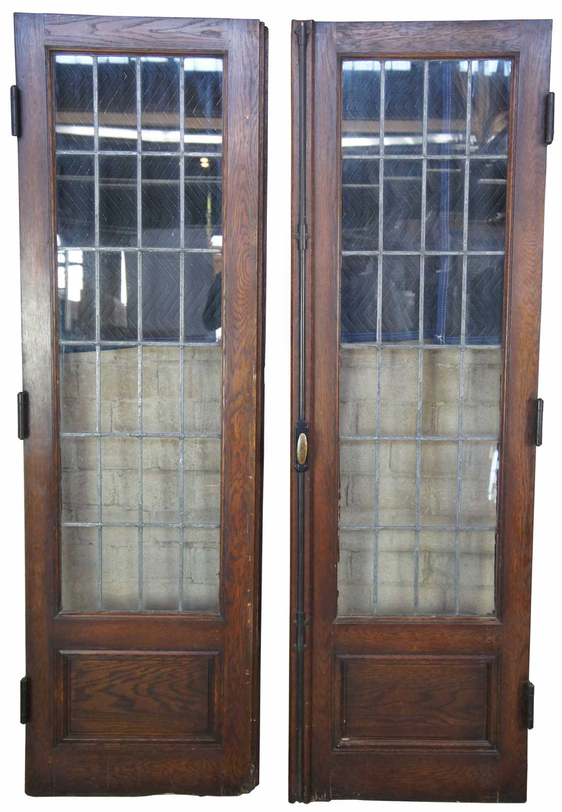 Ealy 20th century French doors. Made from solid oak with 24 panel leaded glass sections over paneled accent. Reclaimed from one of the first homes built in Oakwood, Ohio by Harry I Schenck, circa early 1900s. These doors were originally used between a patio and interior room, so they are painted red along one side.
