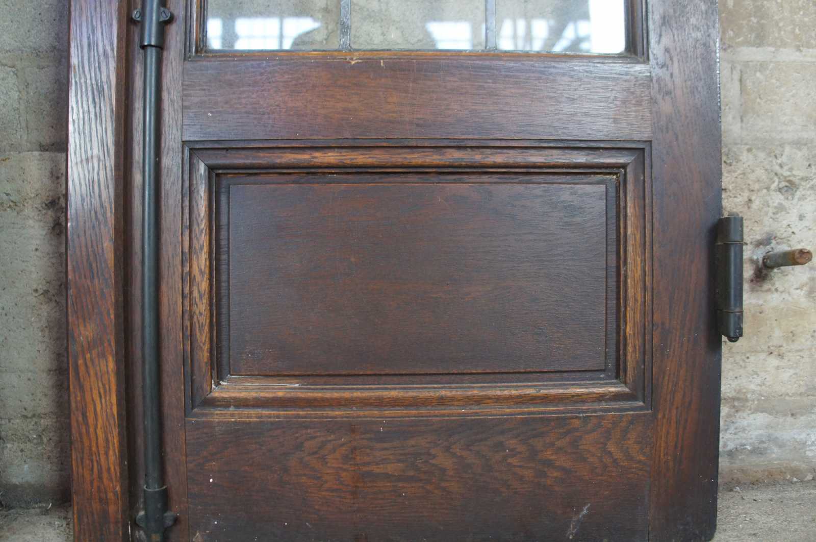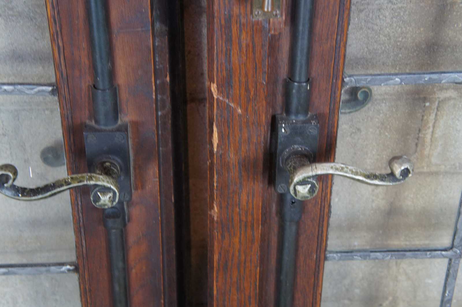 Ealy 20th century French doors. Made from solid oak with 24 panel leaded glass sections over paneled accent and spanish revival door handles. Reclaimed from one of the first homes built in Oakwood, Ohio by Harry I Schenck, circa early 1900s.