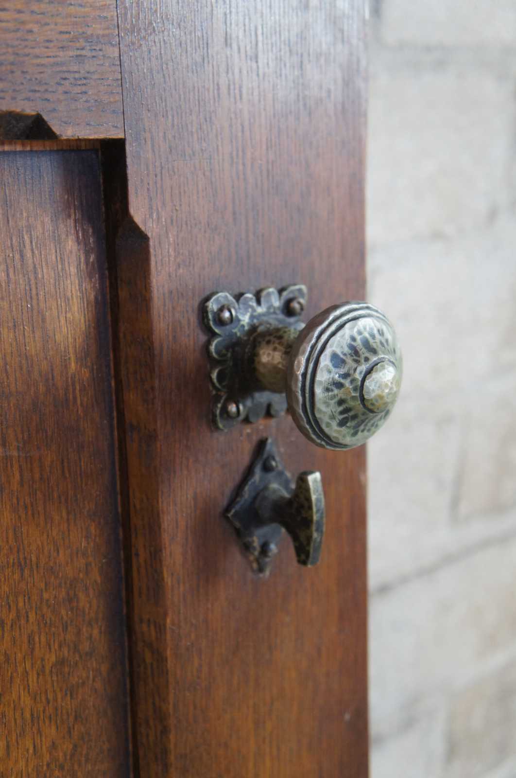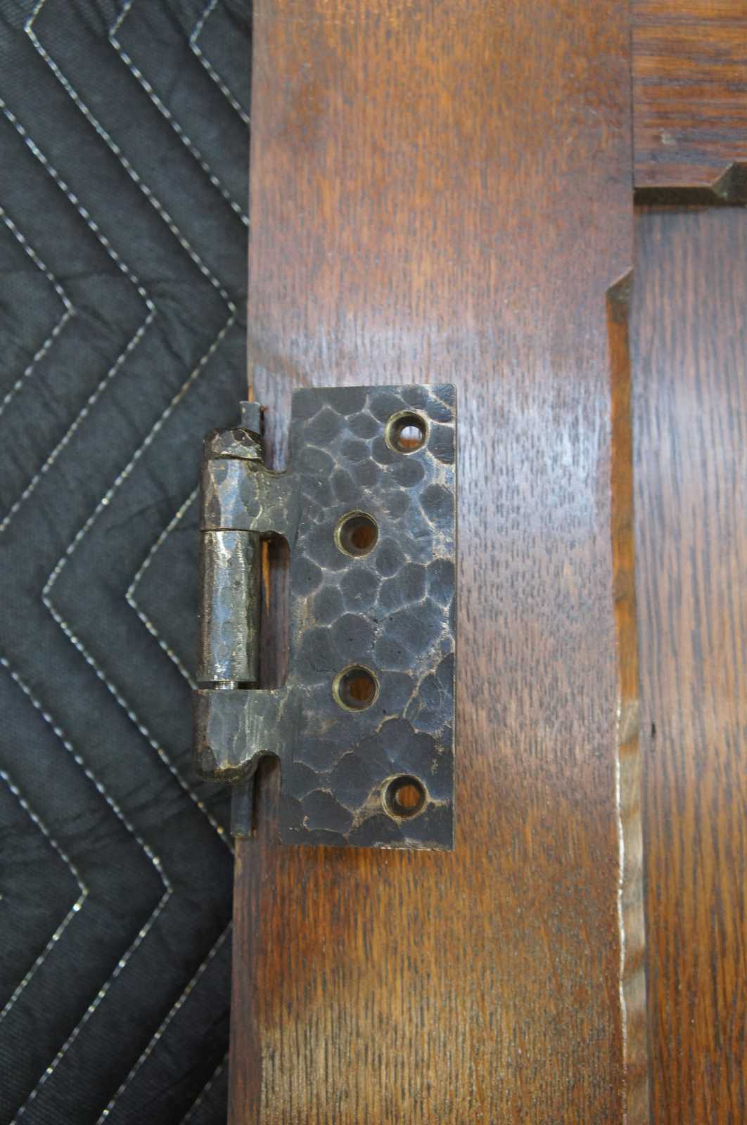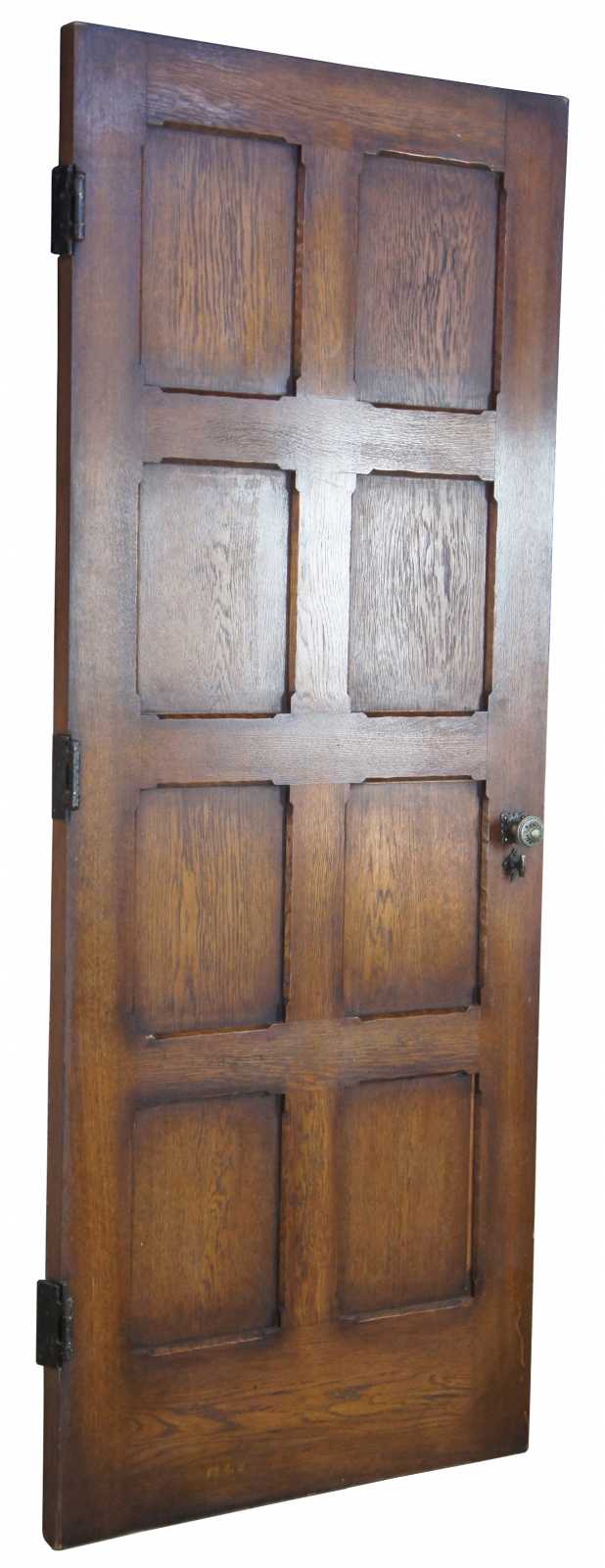 Early 20th century oak reclaimed door. Features eight panels in a grid pattern with Spanish Revival design hammered hardware with knobs and deadbolt. Comes from one of the first homes built in Oakwood, Ohio by Harry I Schenck, circa early 1900s.