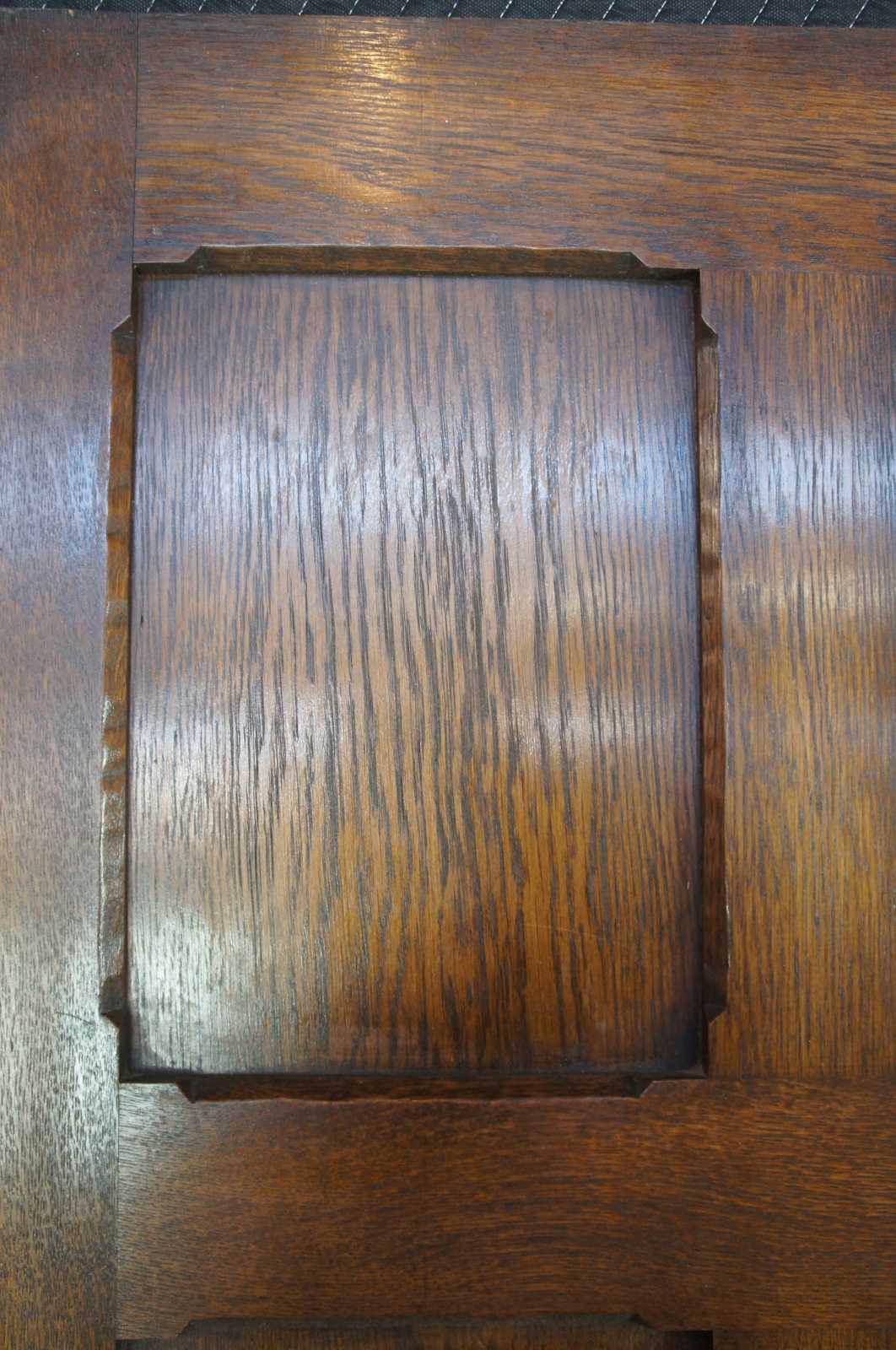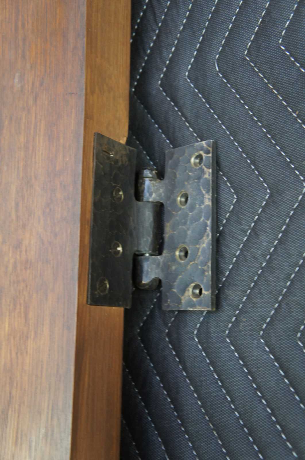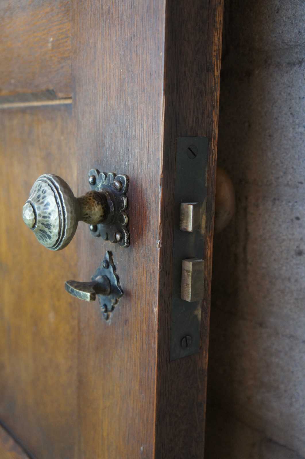 Early 20th century oak reclaimed door. Features eight panels in a grid pattern with Spanish Revival design hammered hardware with knobs and deadbolt. Comes from one of the first homes built in Oakwood, Ohio by Harry I Schenck, circa early 1900s.