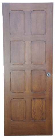 Vintage oak panel door. Features eight panels in a grid pattern with Spanish Revival design.