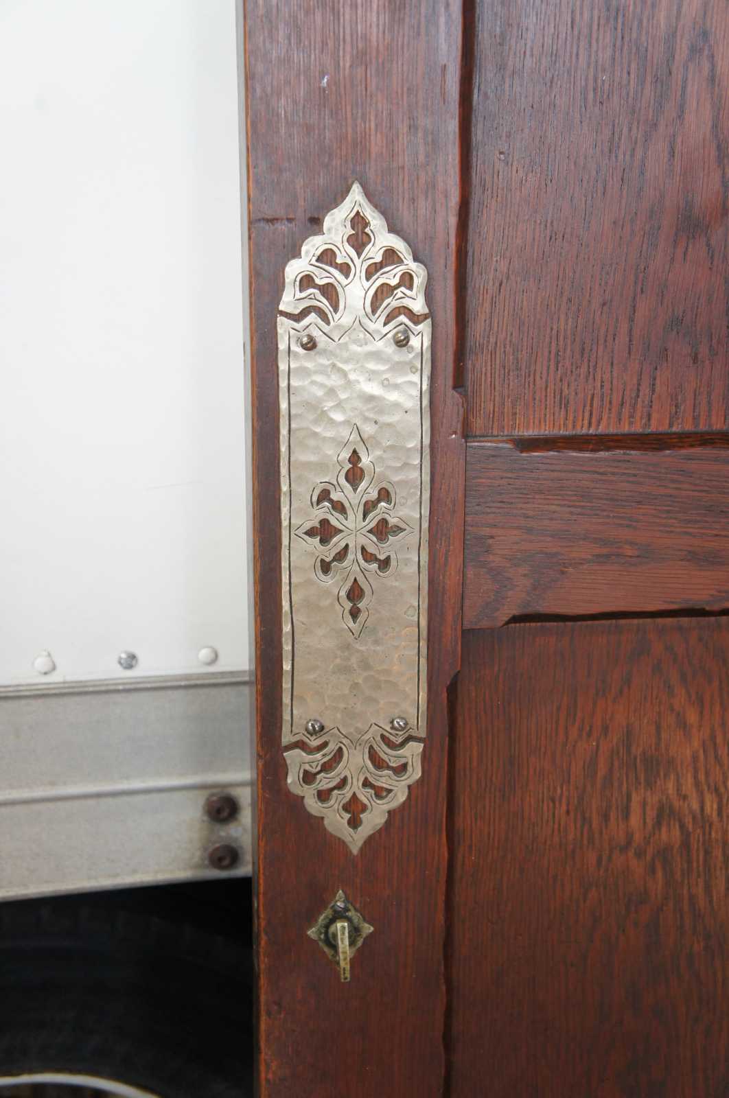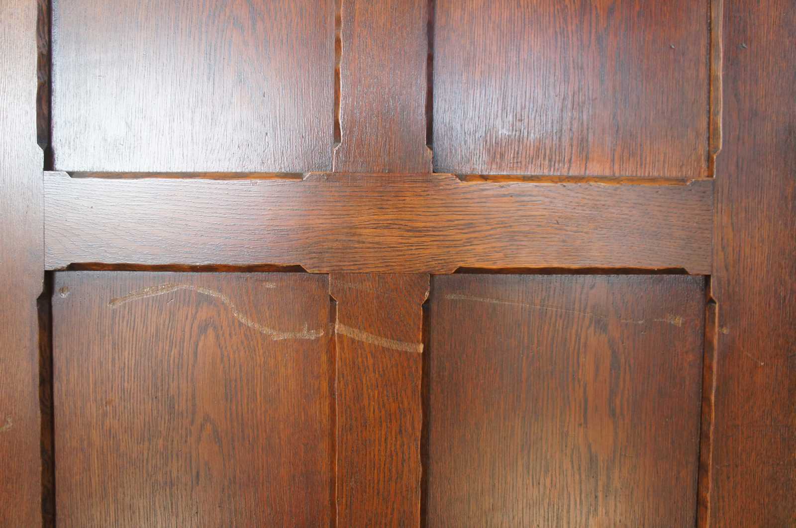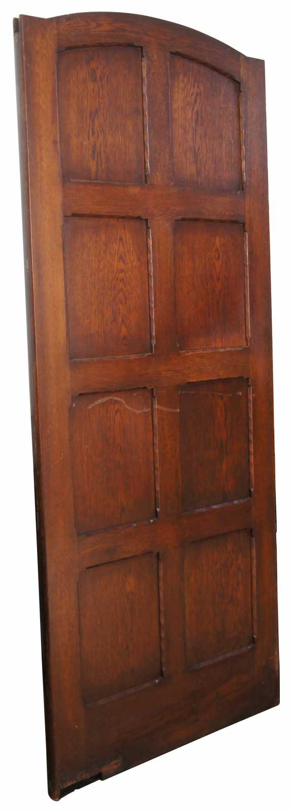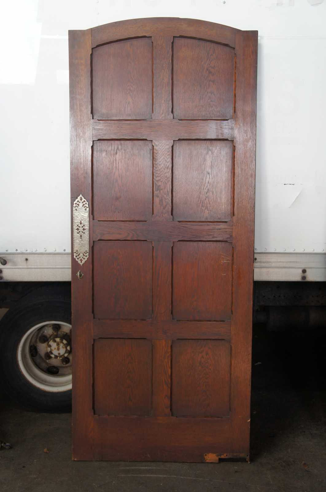 Early 20th century oak reclaimed swinging butler or kitchen door. Features eight panels in a grid pattern with Spanish Revival design and hardware along one side.. Comes from one of the first homes built in Oakwood, Ohio by Harry I Schenck, circa early 1900s.