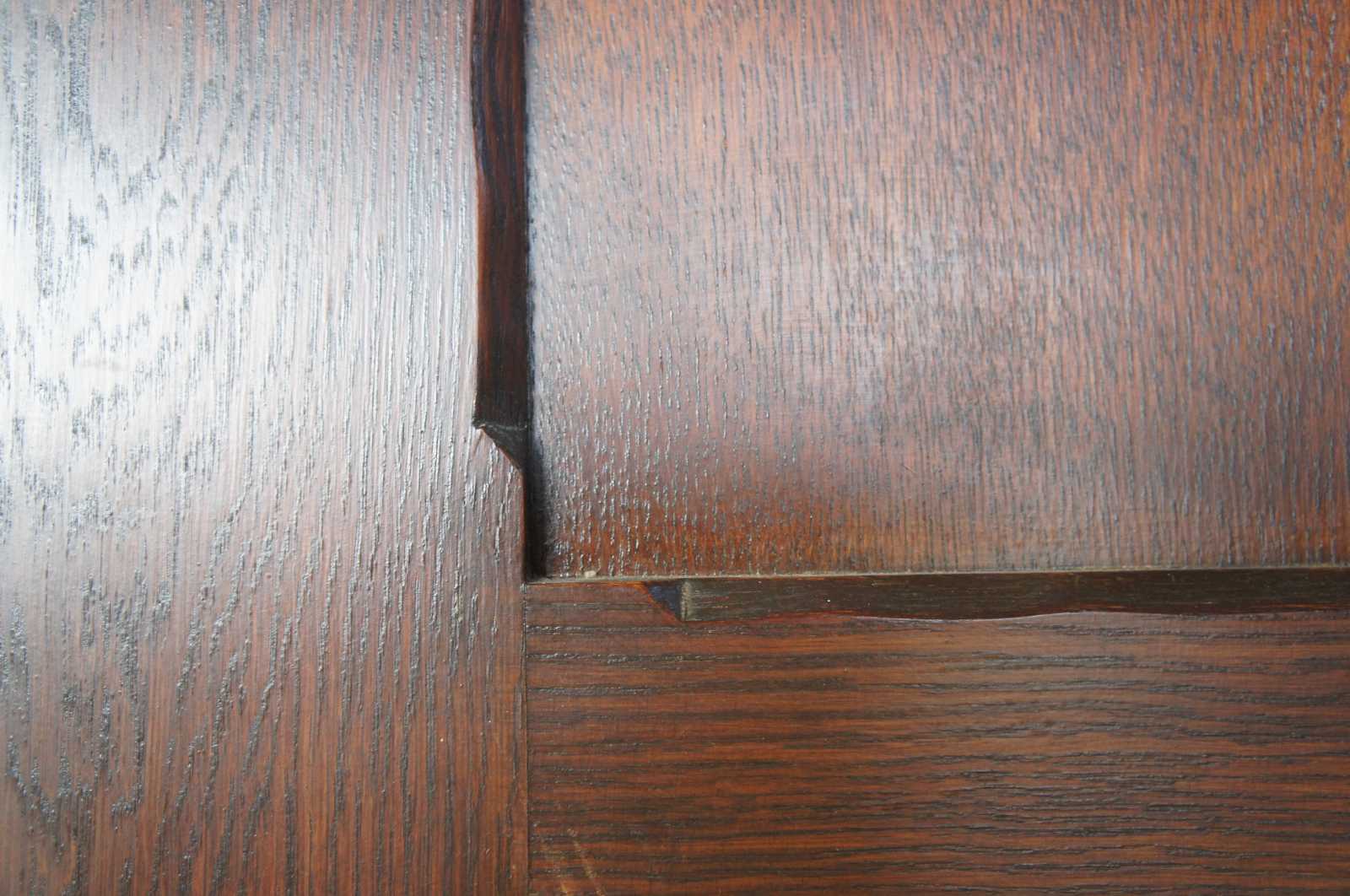 Early 20th century oak reclaimed door. Features eight panels in a grid pattern with Spanish Revival design and brass hardware with knobs, a deadbolt and kick stop. Has a platic plaque on one side that reads, "Ring Bell for Service". Comes from one of the first homes built in Oakwood, Ohio by Harry I Schenck, circa early 1900s. Originally used in the basement Church office (Nunnery) area of the estate.