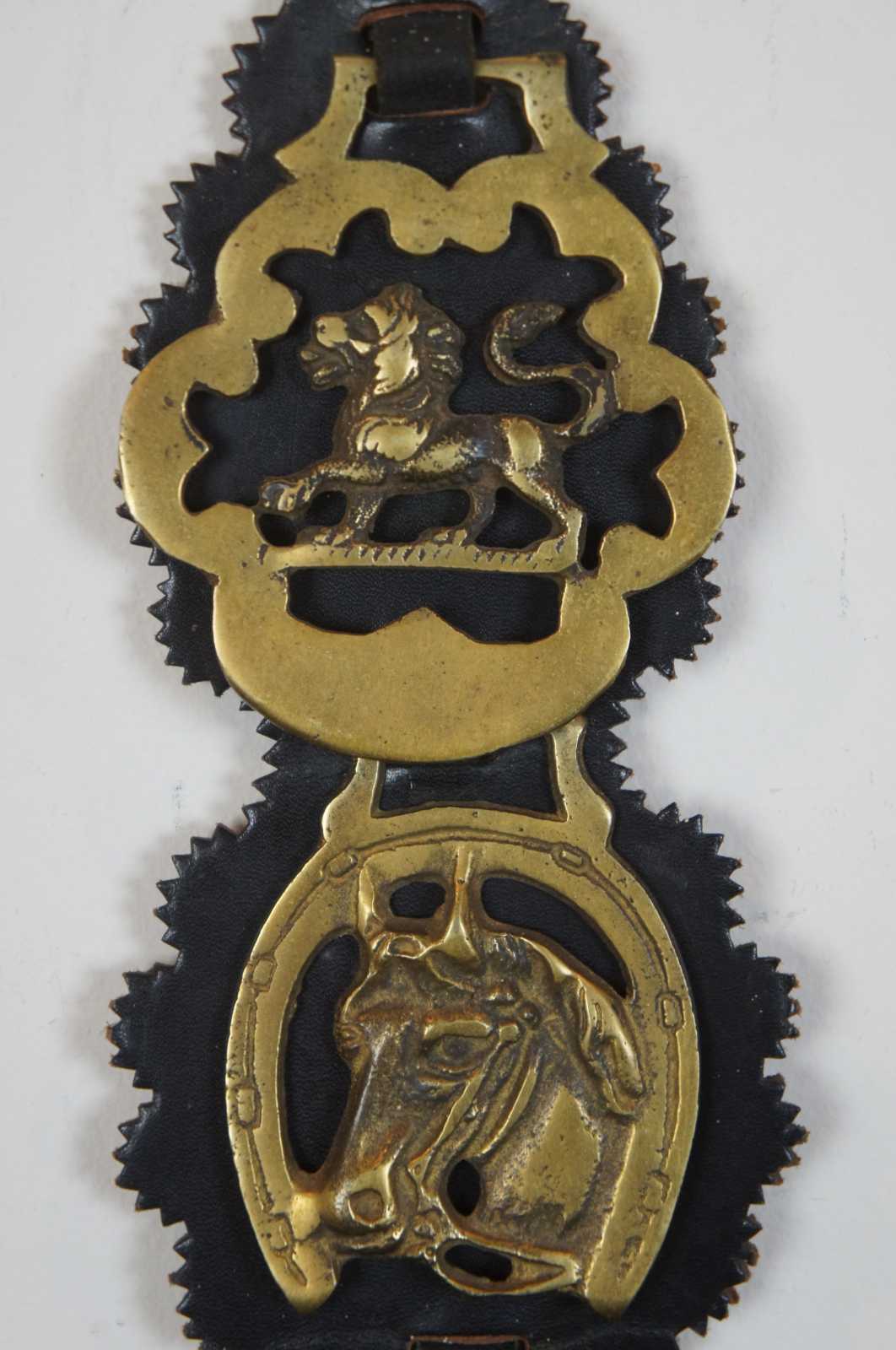 Vintage mid century black leather horse tack strap decorated with six brass bridal medallions.