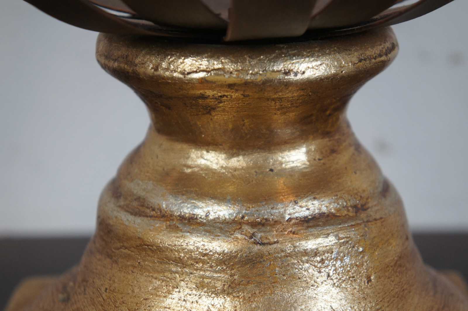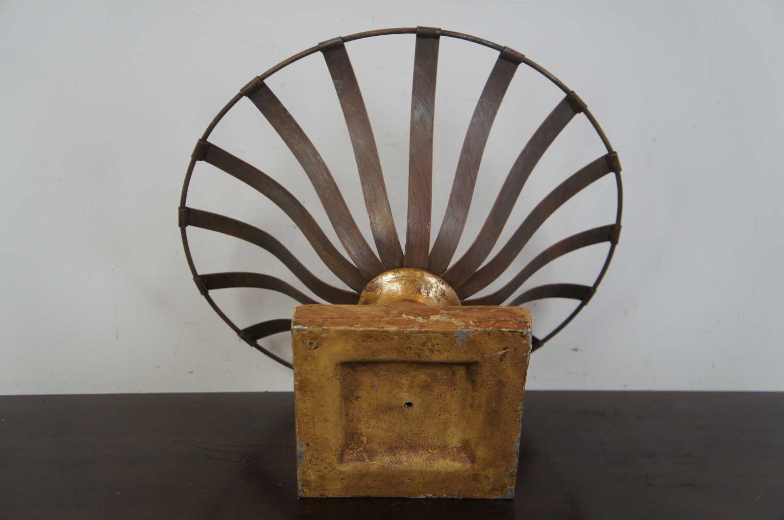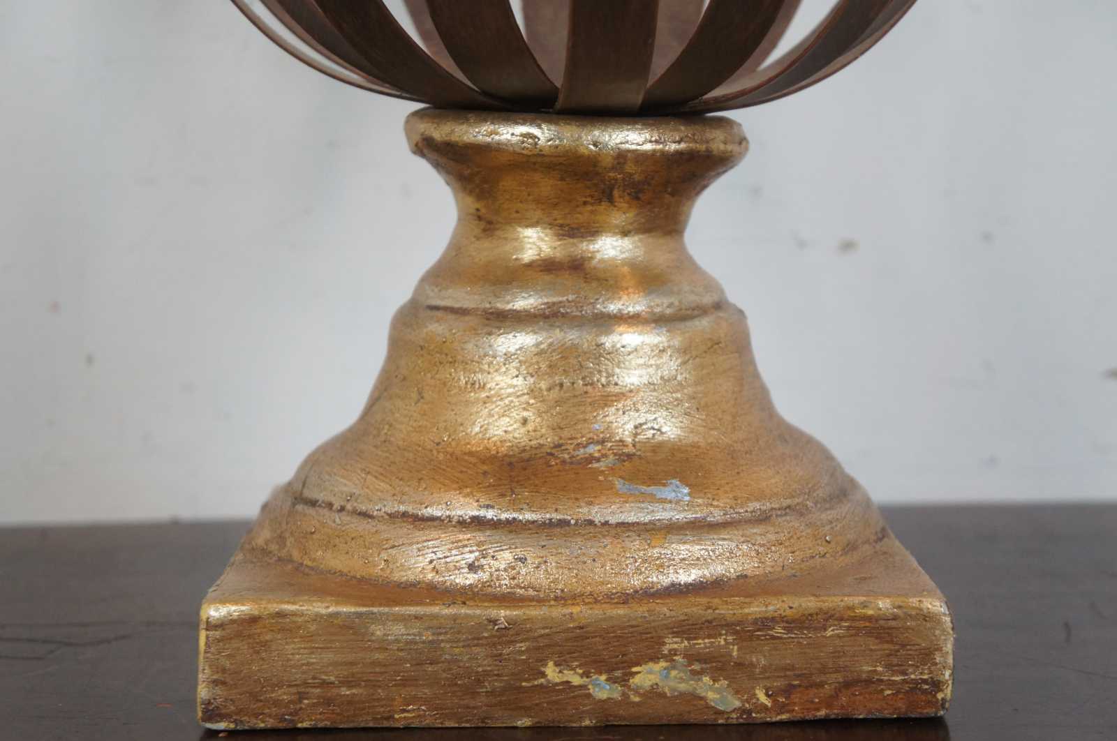 Vintage country farmhouse style fruit basket made of curved metal slats, mounted on a gilded pedestal base.