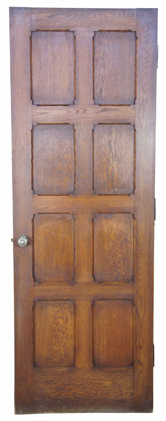 Early 20th century oak reclaimed door. Features eight panels in a grid pattern with Spanish Revival design hammered hardware with knobs and deadbolt. Comes from one of the first homes built in Oakwood, Ohio by Harry I Schenck, circa early 1900s.
