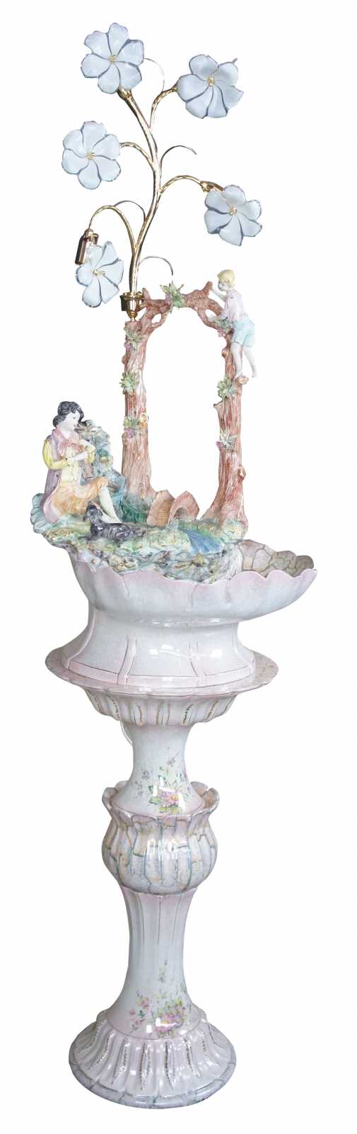Gianni Lorenzon Italian illuminated fountain with flower petal lamp and hand painted accents. Features a colonial scene with a couple with alongside a waterfall. The gentleman can be seen playing a flute while the lady climbs the nearby tree. The fountain rest upon a base and pedestal. Hand Signed.