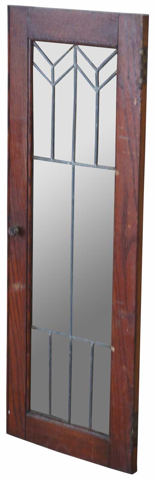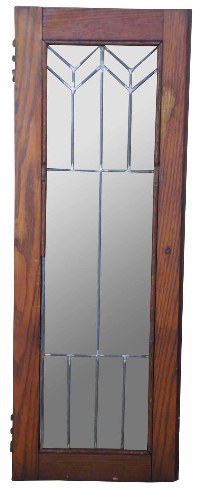 Reclaimed antique oak cabinet doors. Each features a unique leaded glass pattern in chevron design. Two available; sold separately. Each hinges on the right and opens from the left.