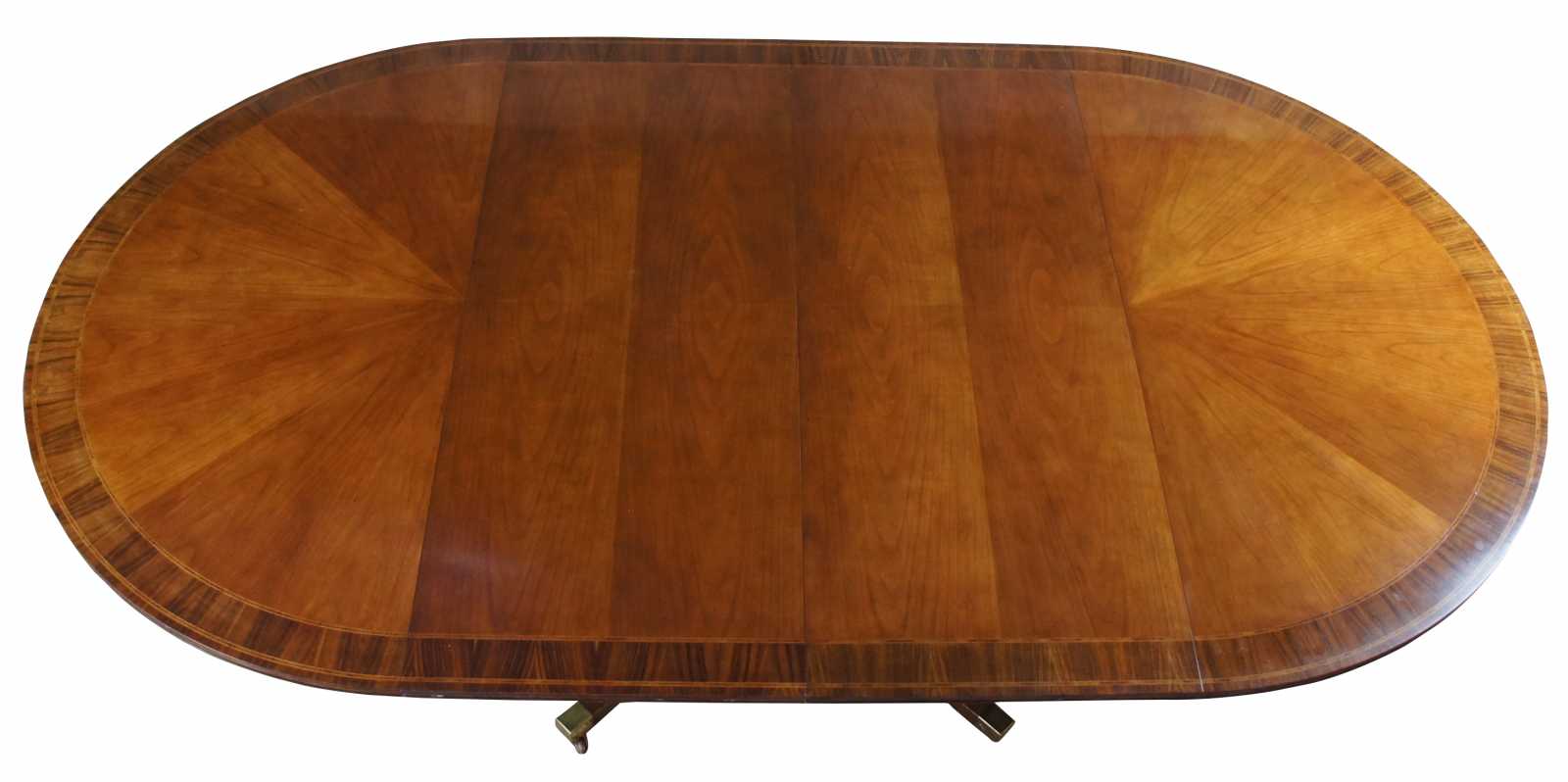 Georgian inspired dining table from the McMillian collection by Baker Furniture. The late 1980s marked the debut of The McMillen Collection, continental furniture drawn from the archives of the McMillian Design firm in New York. This gorgeous example features exotic woods on a banded top. A fluted edge leads to an elegant base with brass capped feet. Once extended turned legs can be dropped into place for added support. Includes two leafs.