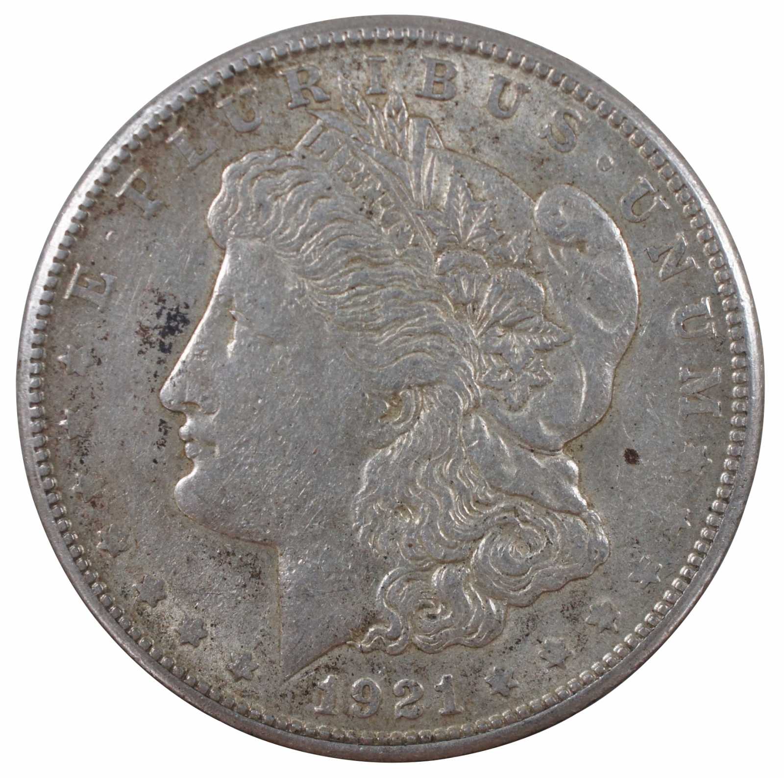 Antique 1921 Liberty one dollar coin. Obverse: head of Lady Liberty, facing left, crowned with the word “Liberty,” a wreath of flowers and wheat and a cloth cap; the words “E Pluribus Unum” across the top edge and the year centered at the bottom edge, stars filling the remainder of the edge. Reverse: a bald eagle with wings outstretched, clutching arrows and an olive branch in its claws, over an olive wreath tied with a ribbon; the words “United States of America” and One Dollar” flaned by two stars around the outside edge; “In God We Trust” above the eagle’s head.