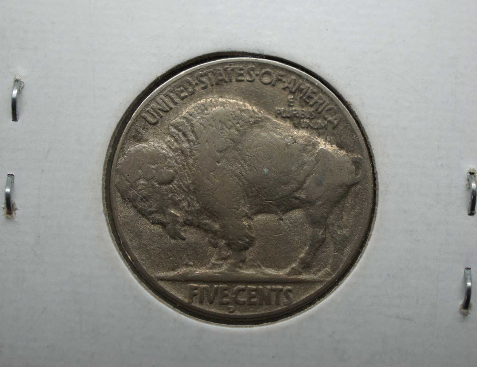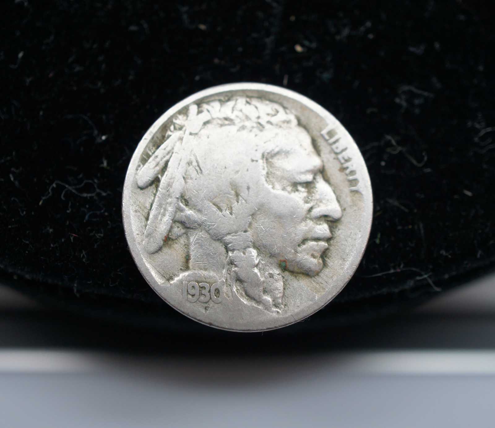 Lot of five Indian head/buffalo nickels. Obverse: the head of a Native American, facing right, with feathers and braids in his hair; the year on his shoulder; the word “Liberty” on the edge by his eyes. Reverse: a buffalo/bison, facing left; the words “United States of America” along the top edge, “Five Cents” centered on the bottom edge, and “E Pluribus Unum” above the bison’s back. Years included: 1925-D, 1930, 1935, and 1936.