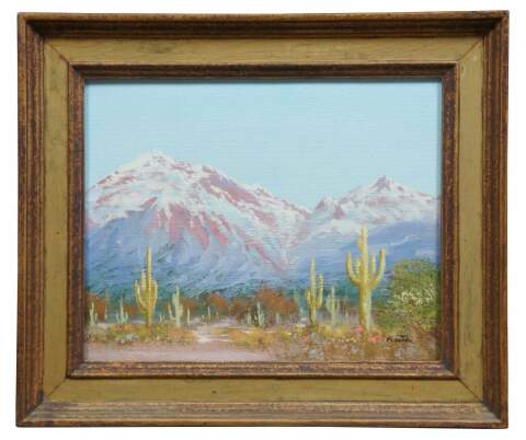 Oil on canvas featuring a desert, cactus and mountain landscape, titled “Phoenix” by Geneene Riston. Geneene Riston studied at the American Academy of Art in Chicago, Roosevelt University, and received a scholarship to the Chicago Art Institute. She was born and lives in Chicago, IL.