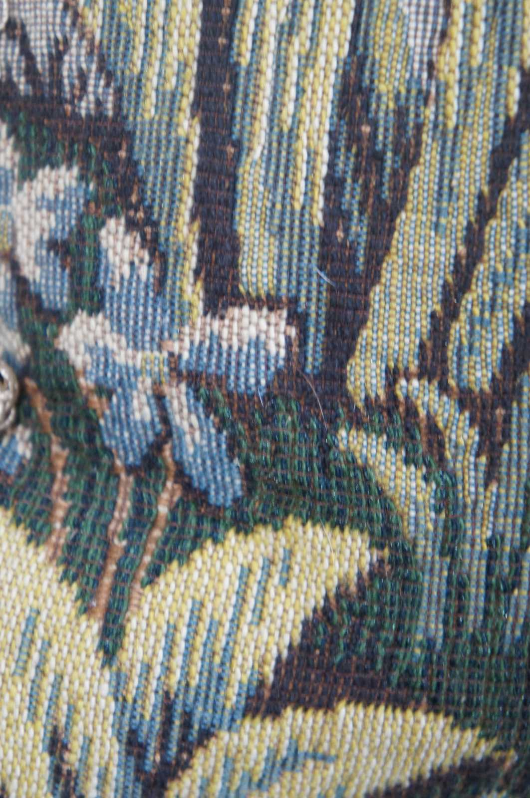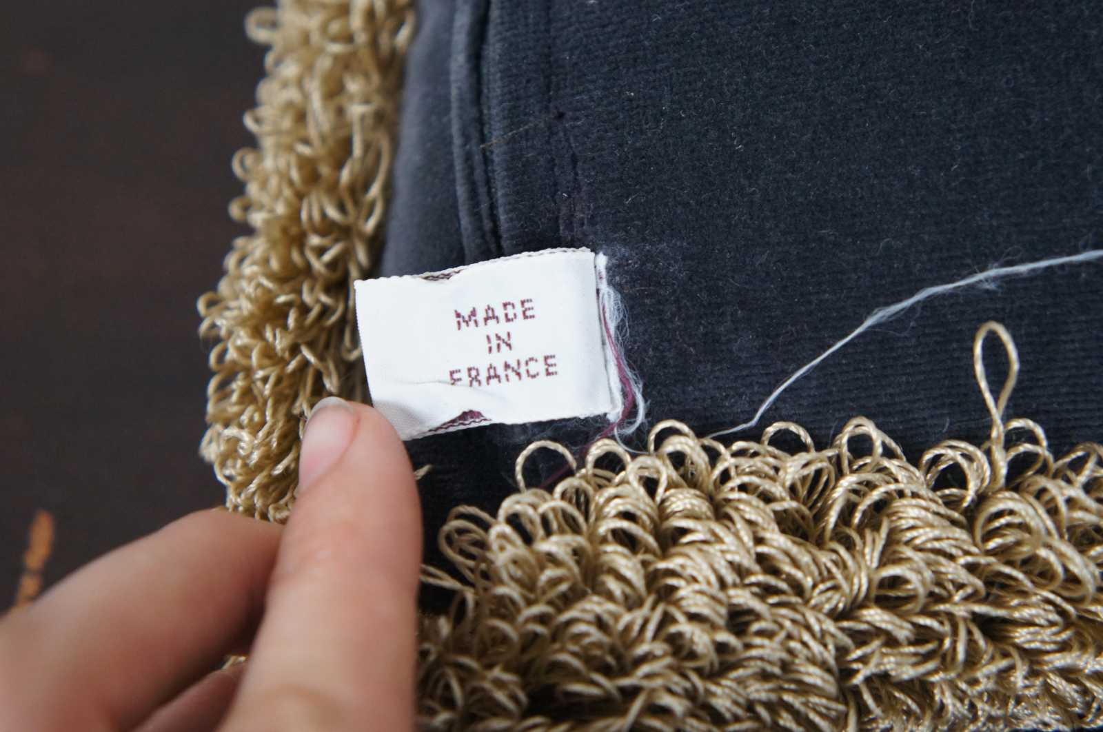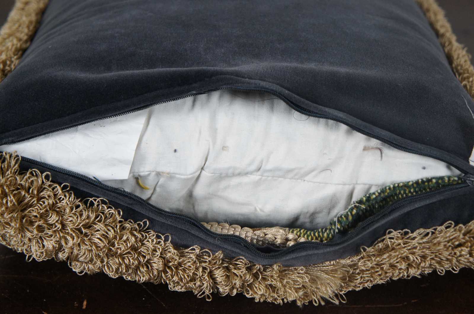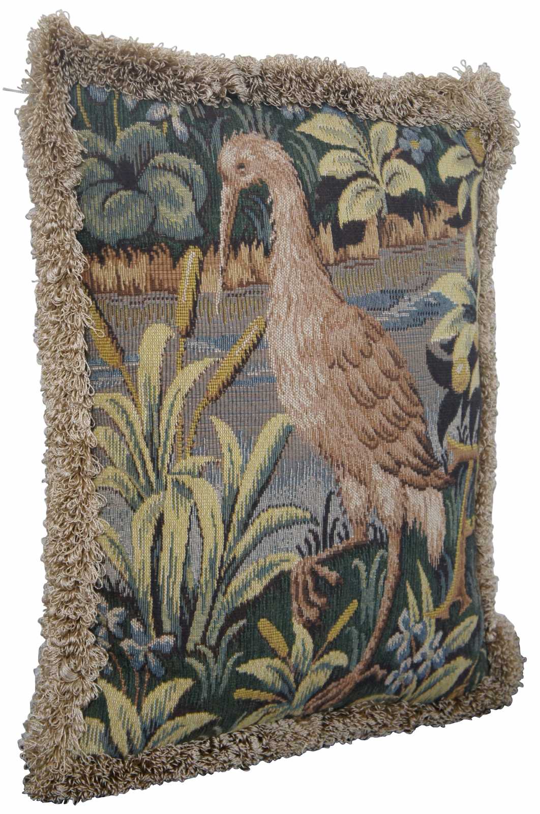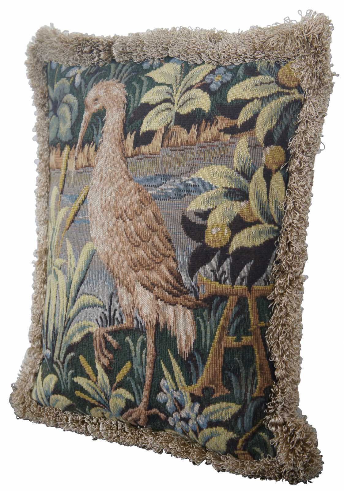 Medieval style, down filled, embroidered throw pillow with velour back and gold fringe, featuring a heron or crane at the edge of a lake with the capital letter A, made in France for CJC of St Simons Island, GA.
