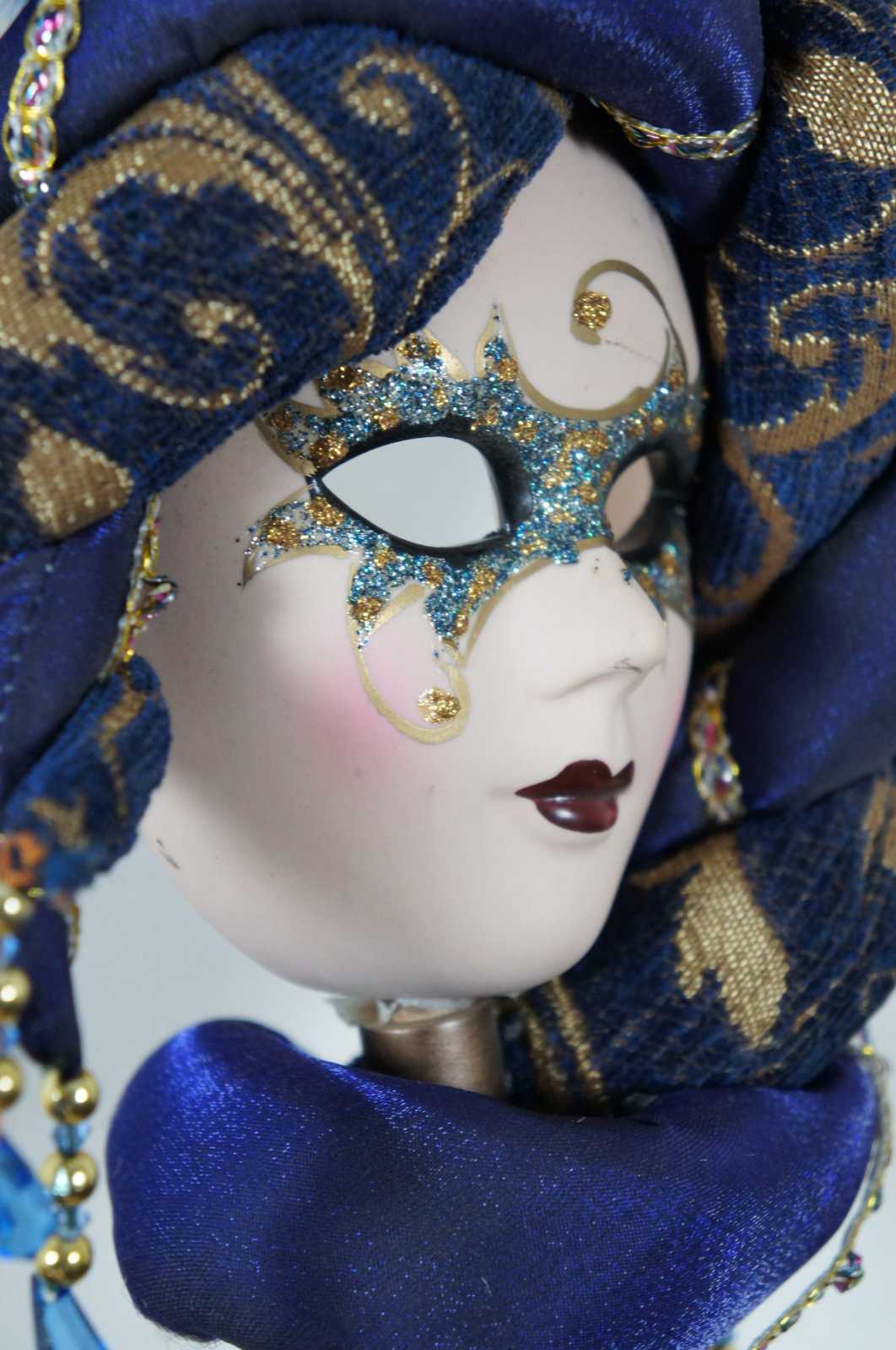 Miniature ceramic carnival or Mardi Gras masquerade mask wearing a purple and gold turban style, feathered head piece, on a painted wood stick.