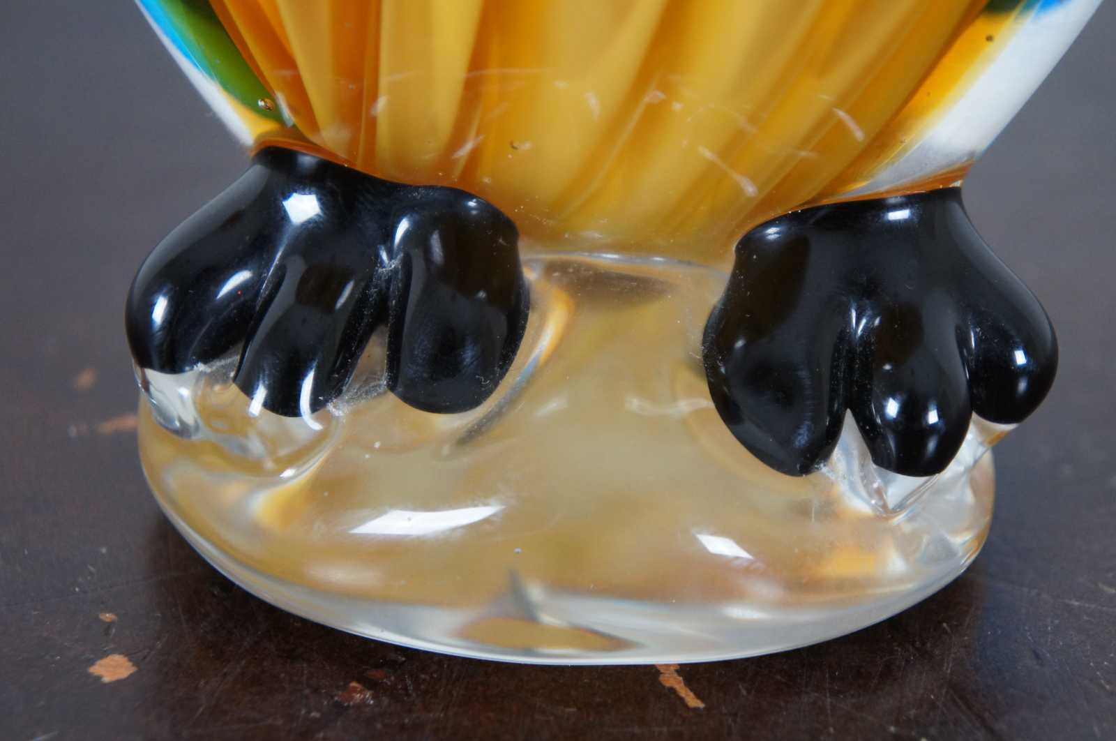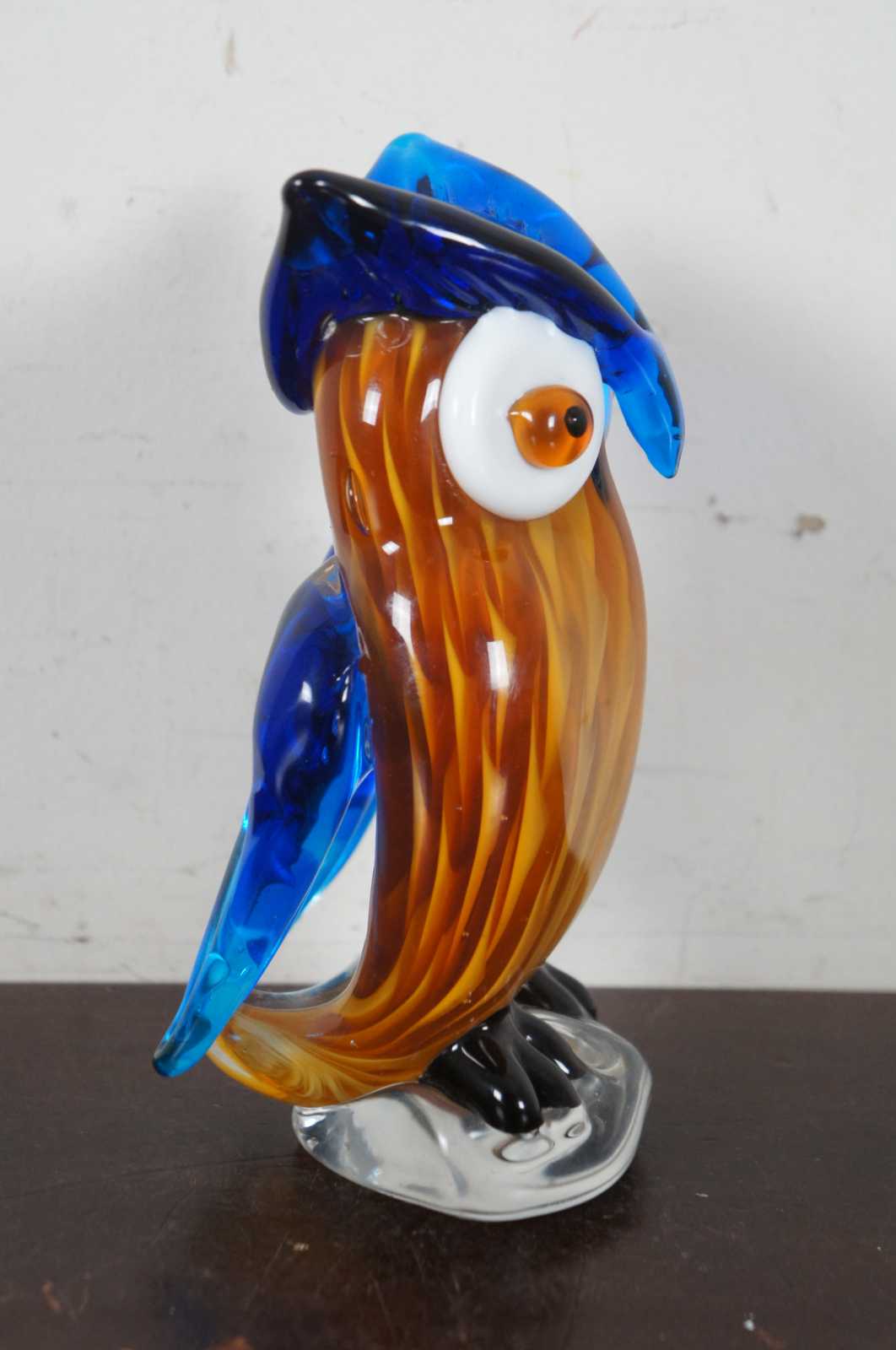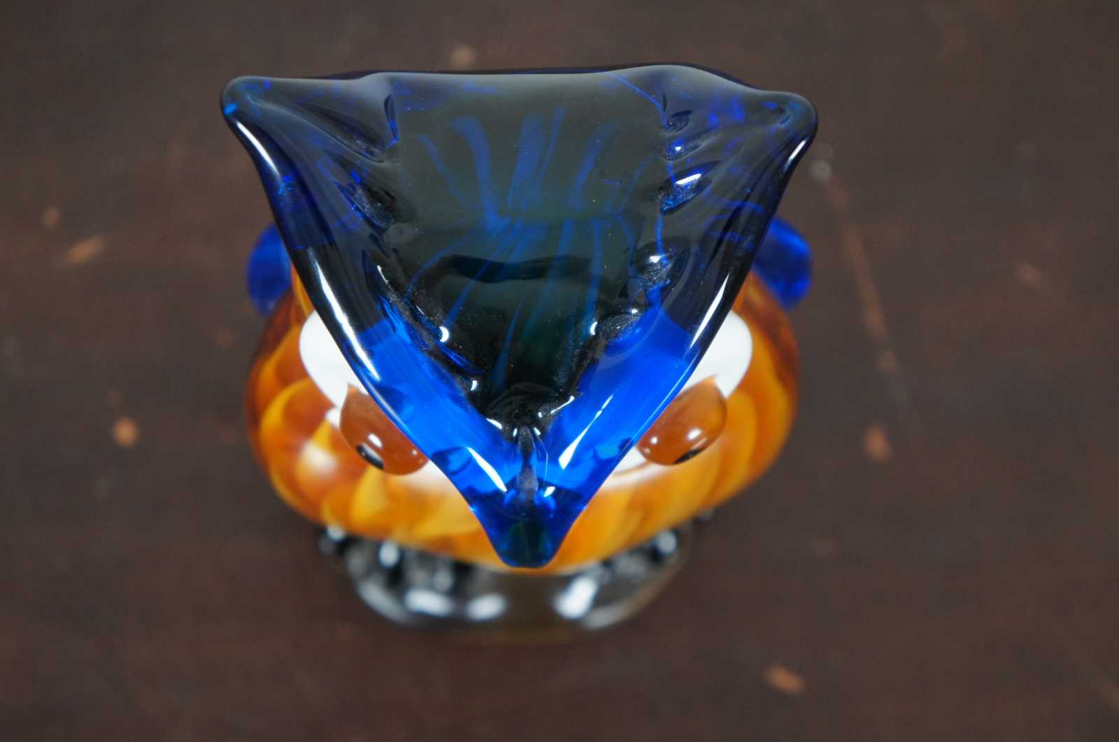 Vintage studio art glass figurine in the shape of a great horned owl with a swirling orange chest and blue wings and face.